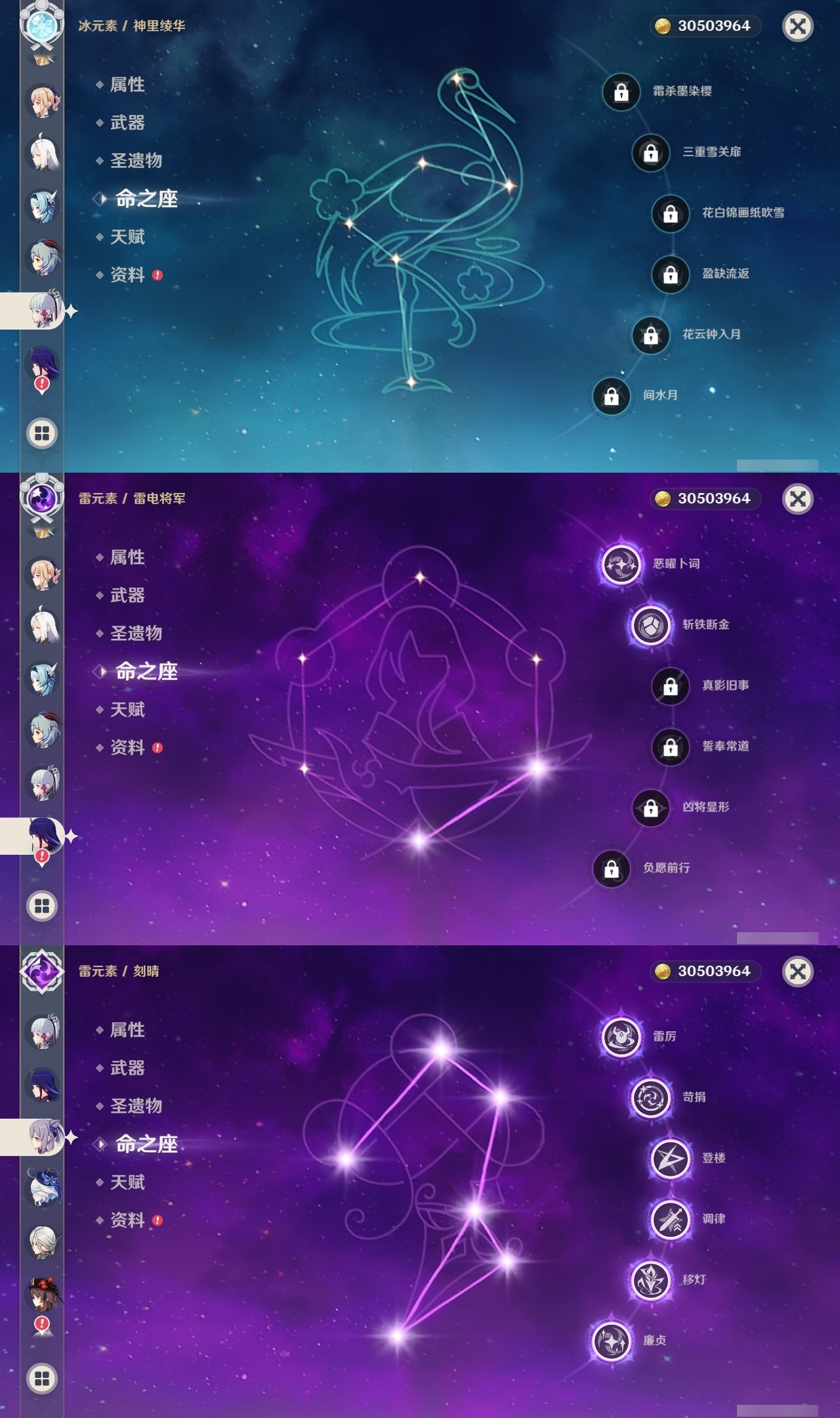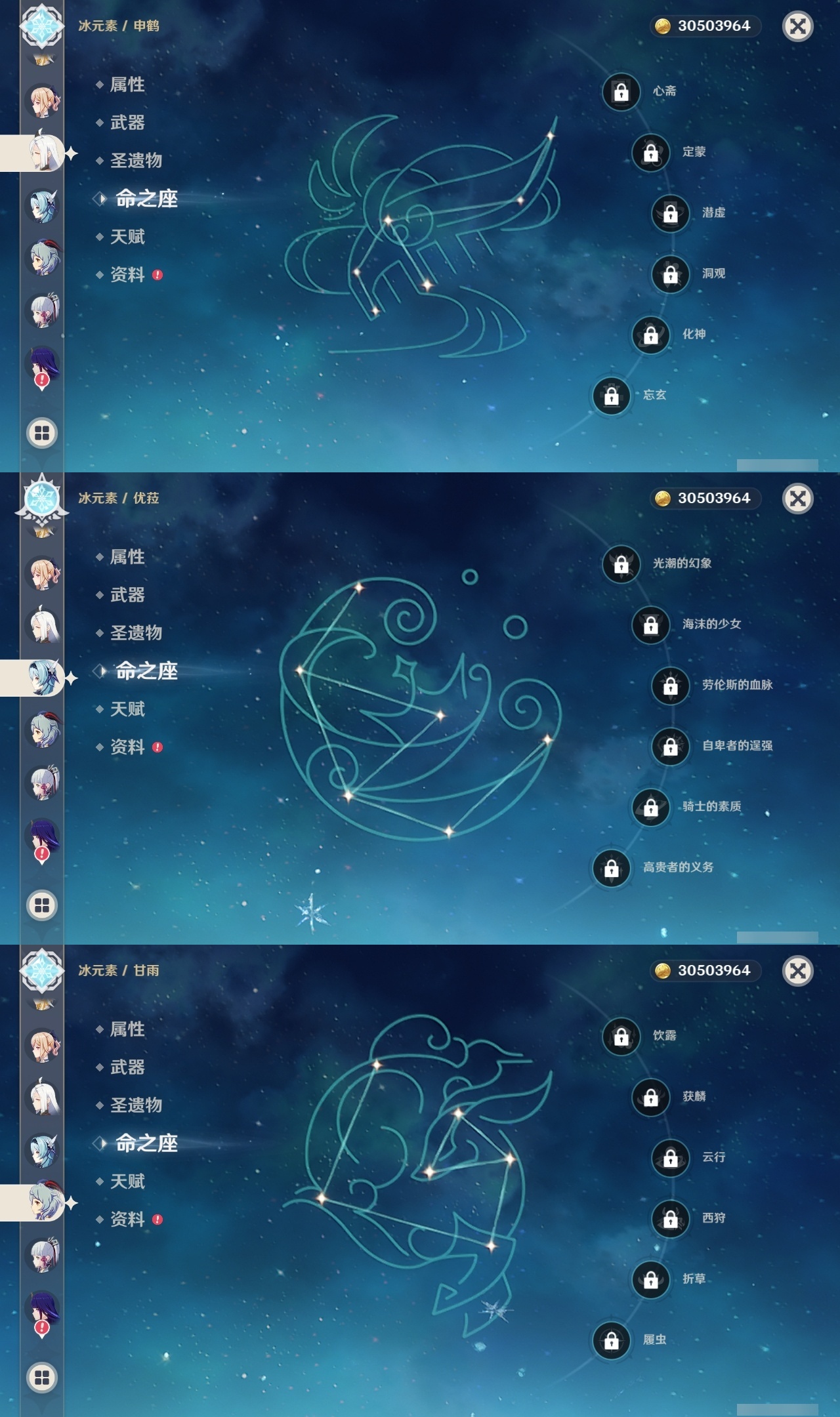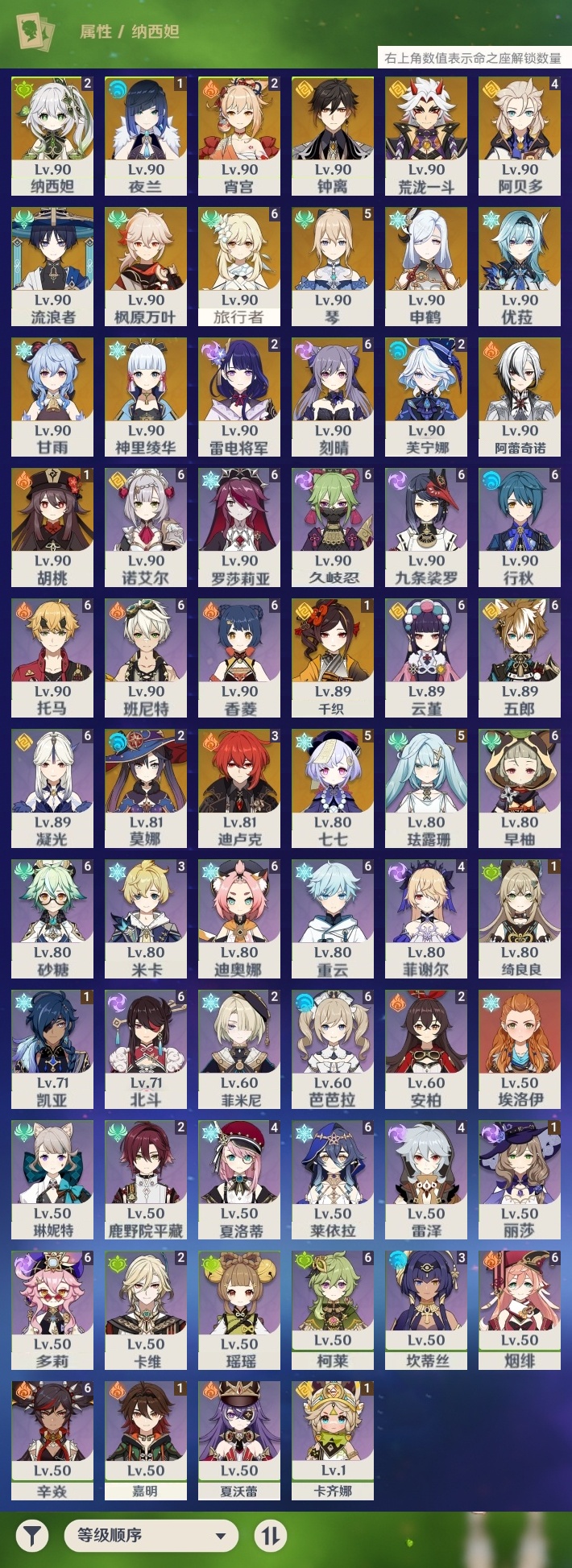 【原神】【lyys6812】冒险等级:60,五星数量:44,五星角色:刻晴 6命七七 5命琴 5命阿贝多 4命迪卢克 3命芙宁娜 2命雷电将军 2命莫娜 2命宵宫 2命纳西妲 2命千织 1命胡桃 1命夜兰 1命神里绫华优菈钟离荒泷一斗申鹤阿蕾奇诺流浪者枫原万叶甘雨__五星武器:飞雷之弦振 3精天空之傲 2精天空之脊 2精天空之翼 2精无工之剑 2精赤角石溃杵 2精赤月之形阿莫斯之弓尘世之锁和璞鸢护摩之杖狼的末路四风原典松籁响起之时天空之卷天空之刃雾切之回光薙草之稻光息灾若水千夜浮梦__四星角色:班尼特 6命行秋 6命九条裟罗 6命香菱 6命久岐忍 6命凝光 6命迪奥娜 6命砂糖 6命莱依拉 6命多莉 6命柯莱 6命芭芭拉 6命云堇 6命早柚 6命托马 6命五郎 6命烟绯 6命重云 6命辛焱 6命诺艾尔 6命罗莎莉亚 6命北斗 6命珐露珊 5命雷泽 4命菲谢尔 4命夏洛蒂 4命米卡 3命坎蒂丝 3命鹿野院平藏 2命卡维 2命菲米尼 2命卡齐娜 1命绮良良 1命嘉明 1命埃洛伊瑶瑶琳妮特夏沃蕾