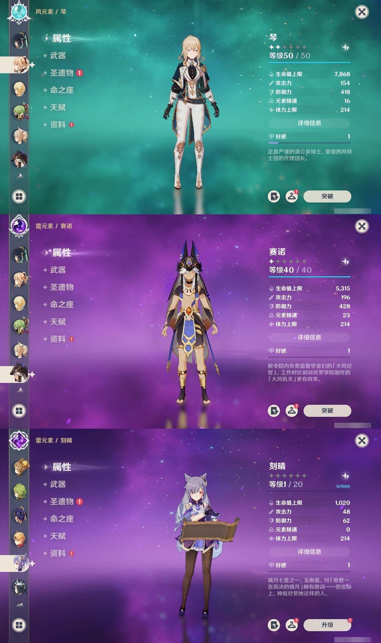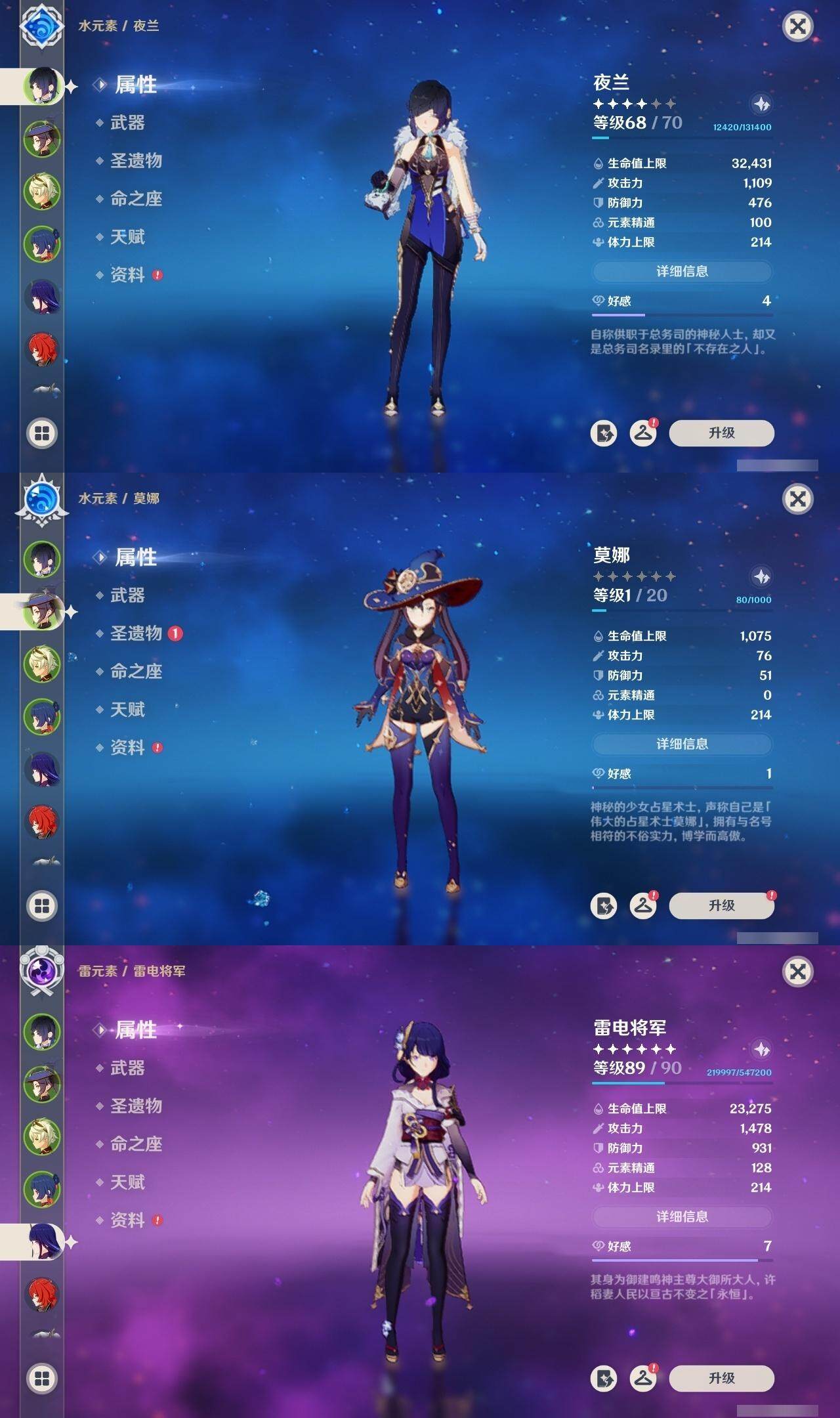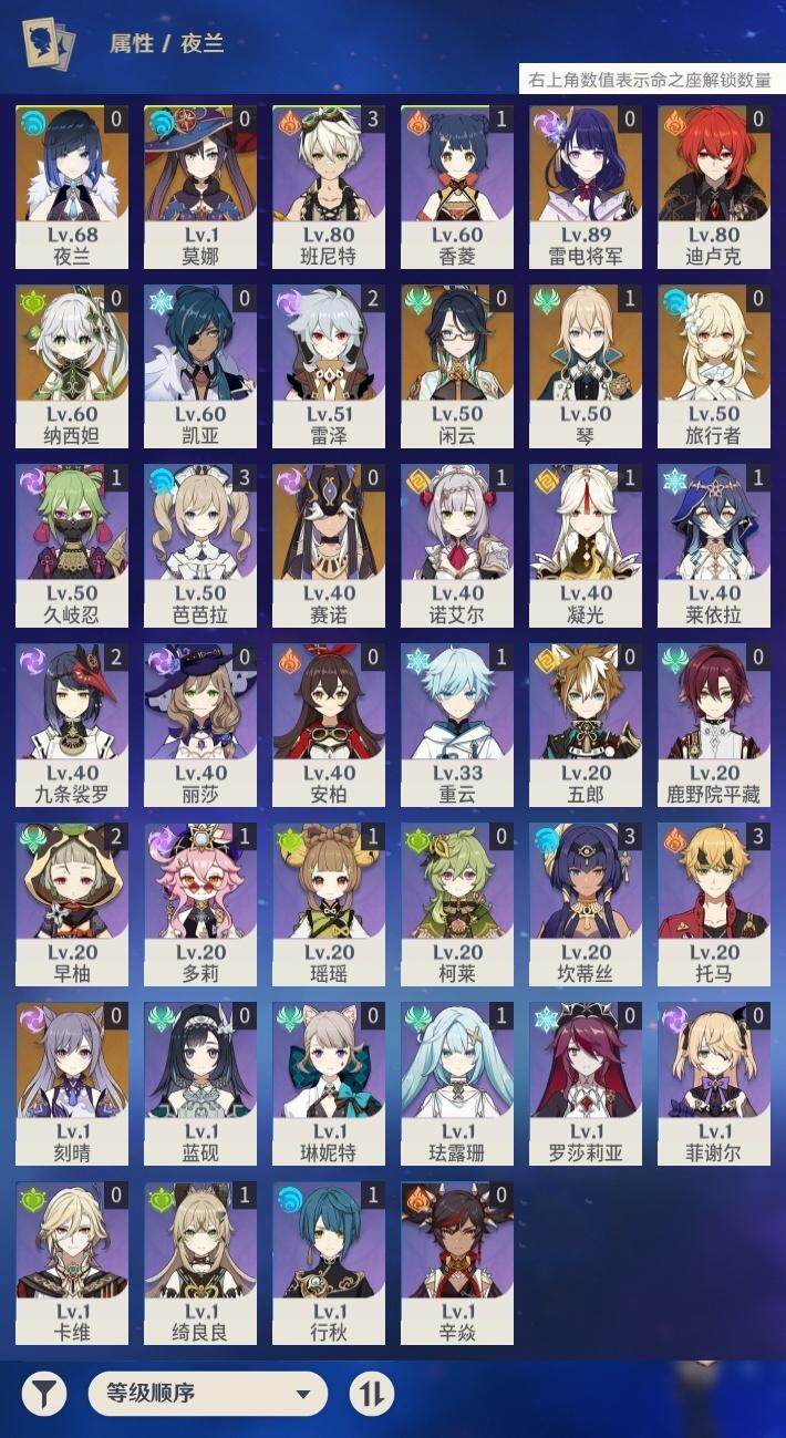 50级/10黄/女主/9个五星角色 0命闲云0命纳西妲0命赛诺0命夜兰0命雷电将军0命刻晴1命琴0命莫娜0命迪卢克