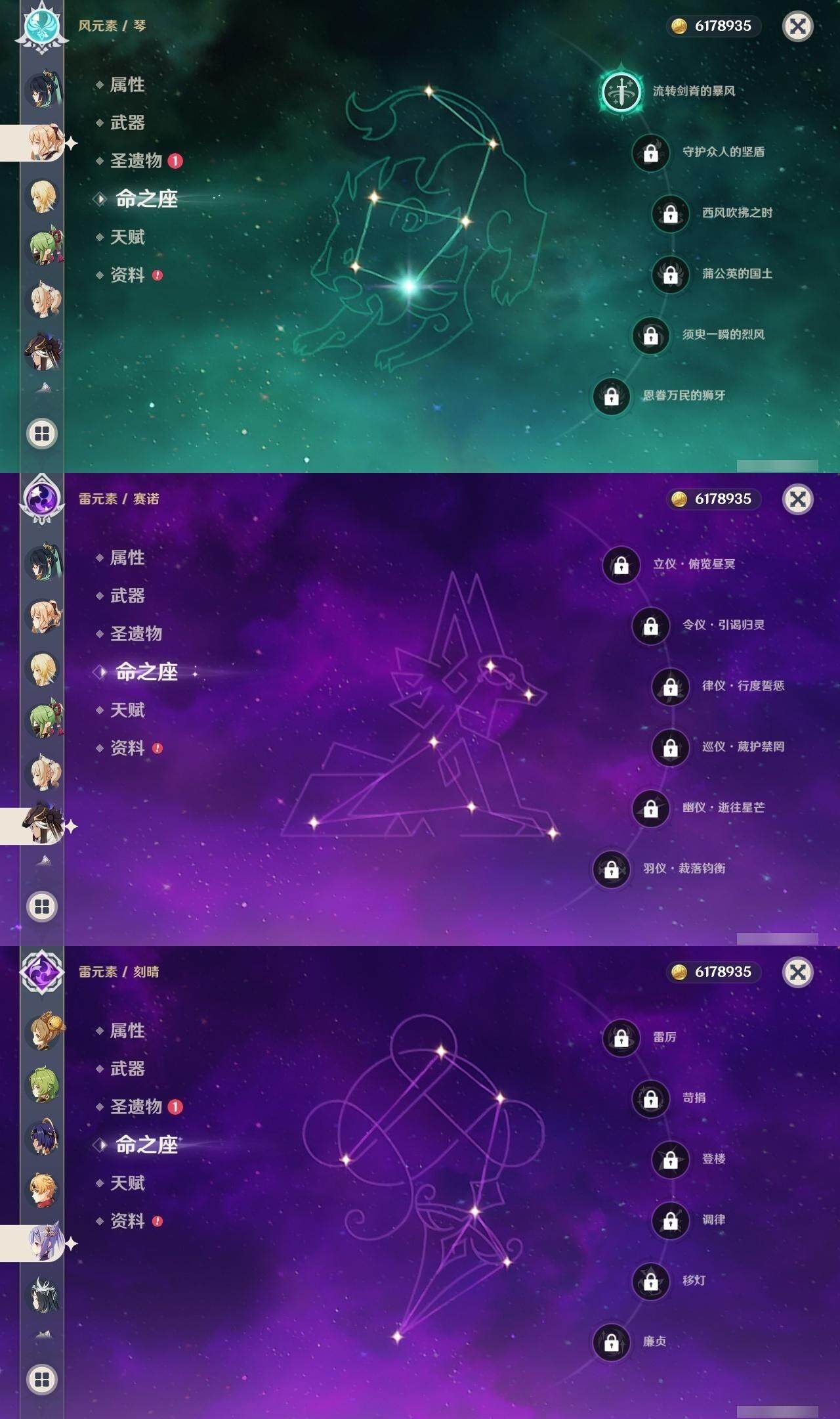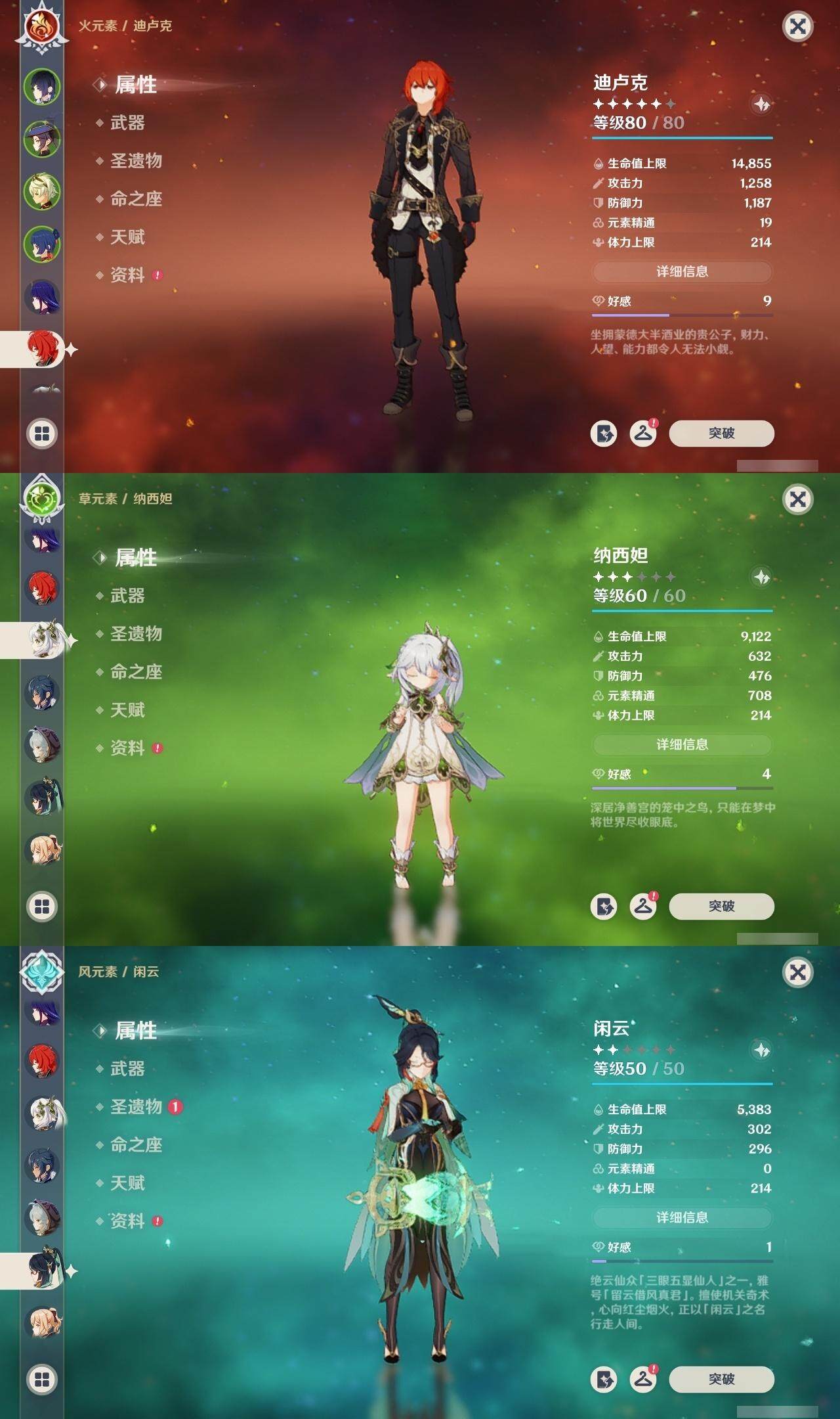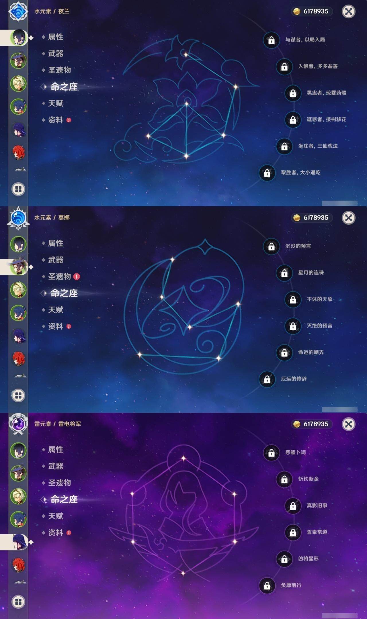50级/10黄/女主/9个五星角色 0命闲云0命纳西妲0命赛诺0命夜兰0命雷电将军0命刻晴1命琴0命莫娜0命迪卢克