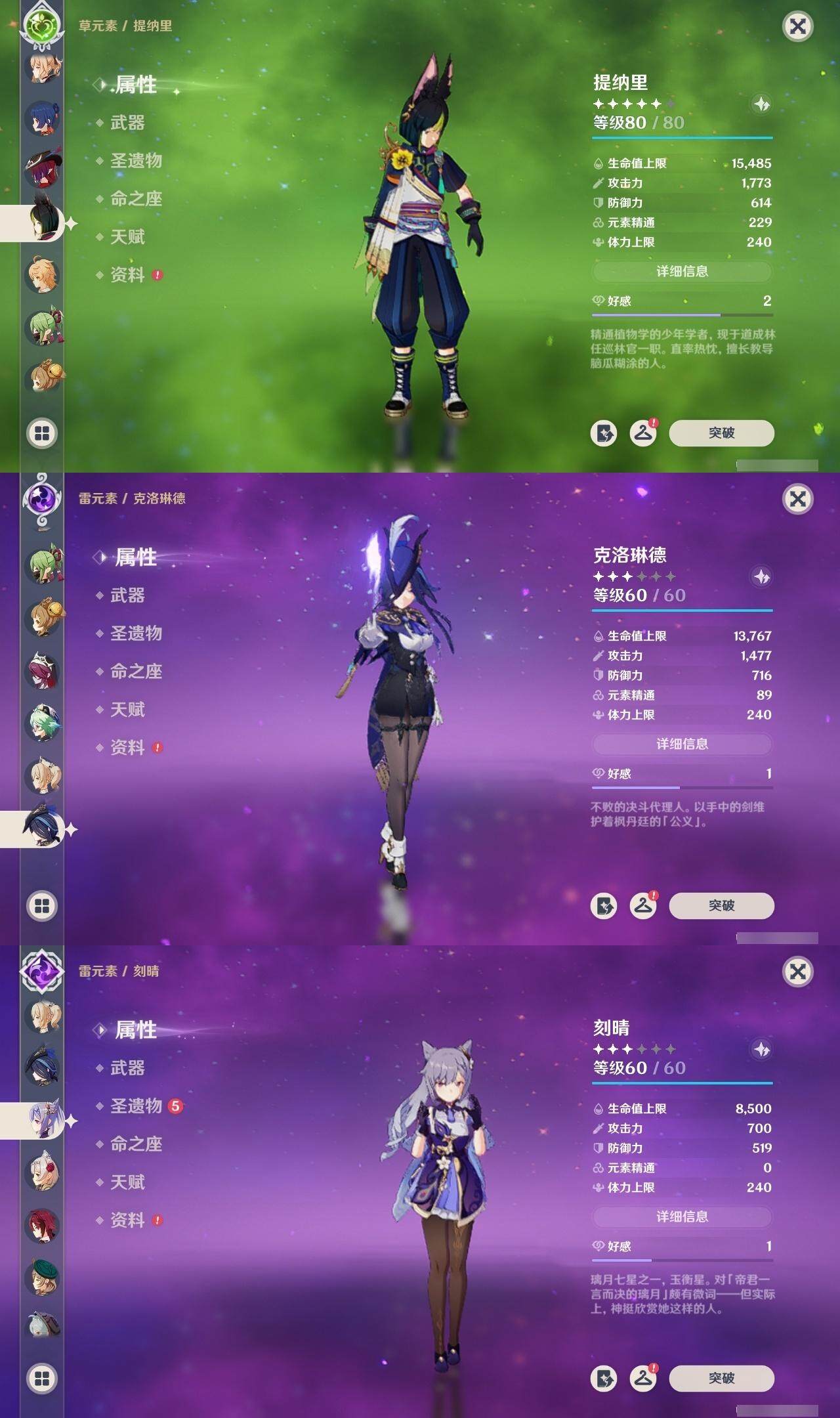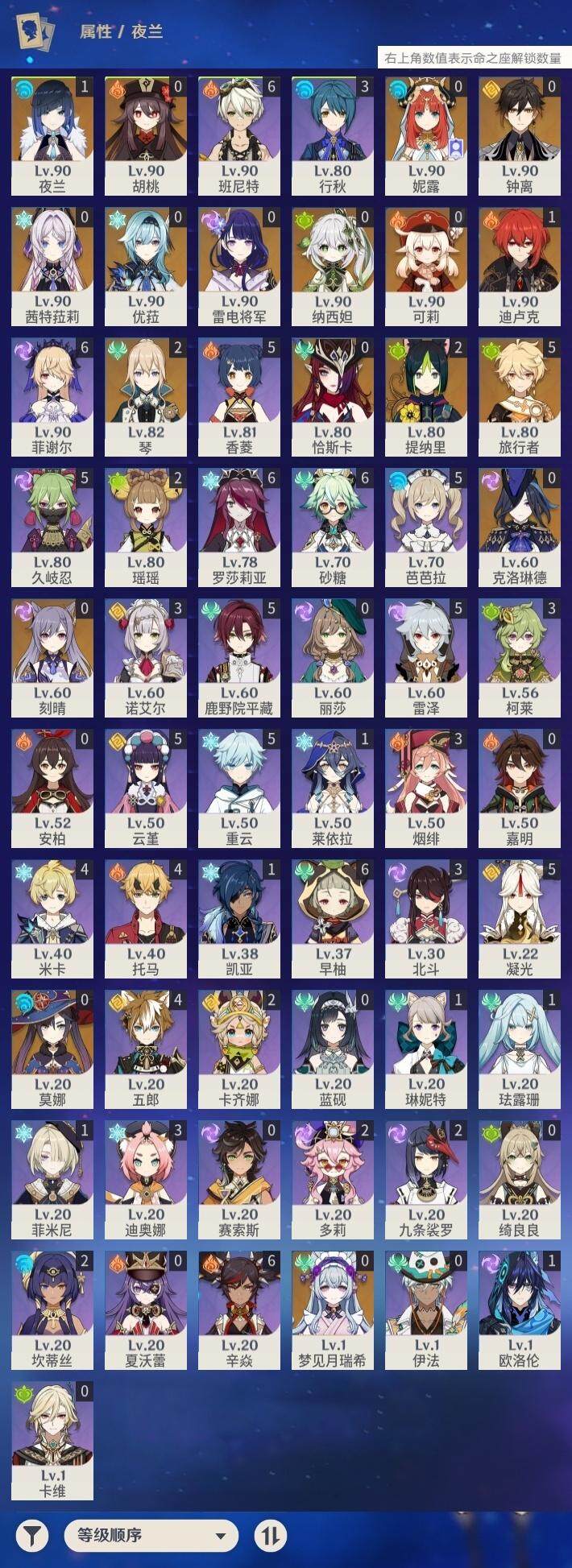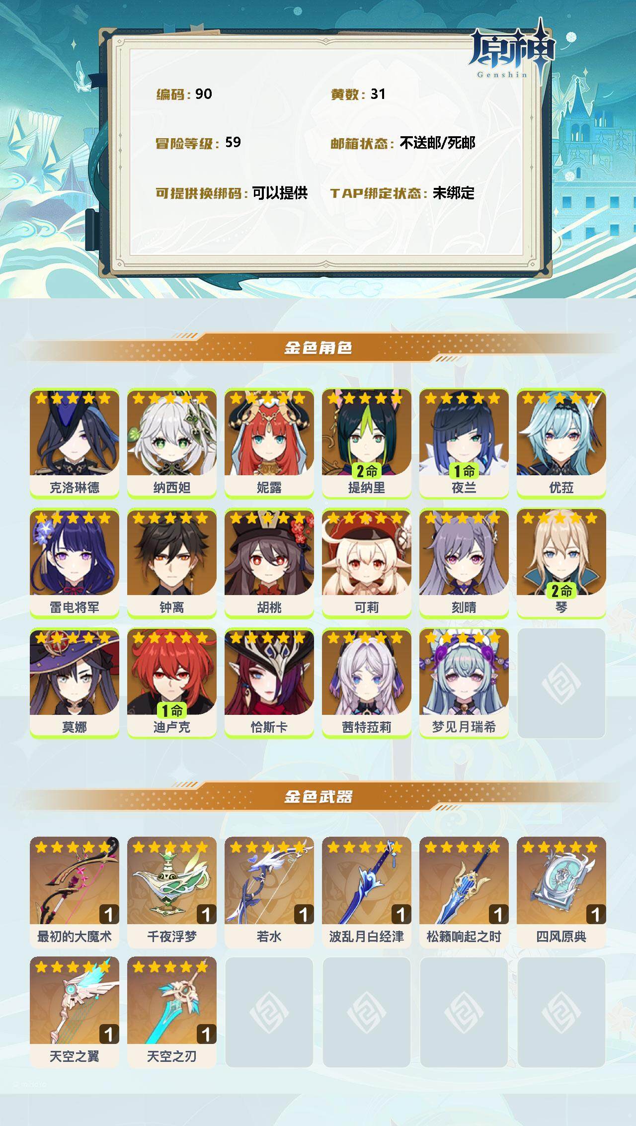 59级/31黄/男主/17个五星角色/8个五星武器 0命克洛琳德0命纳西妲0命妮露2命提纳里1命夜兰0命优菈0命雷电将军0命钟离0命胡桃0命可莉0命刻晴2命琴0命莫娜1命迪卢克0命恰斯卡0命茜特菈莉0命梦见月瑞希精1最初的大魔术精1千夜浮梦精1若水精1波乱月白经津精1松籁响起之时精1四风原典精1天空之翼精1天空之刃