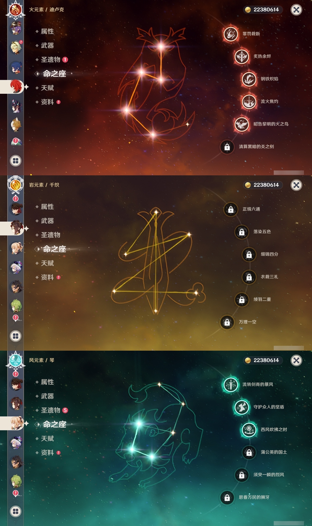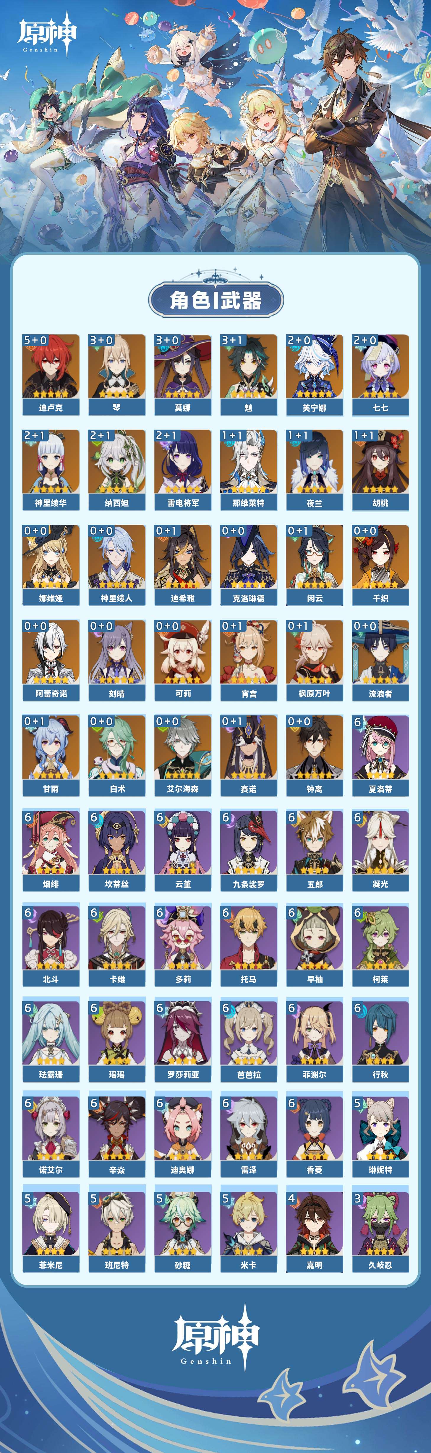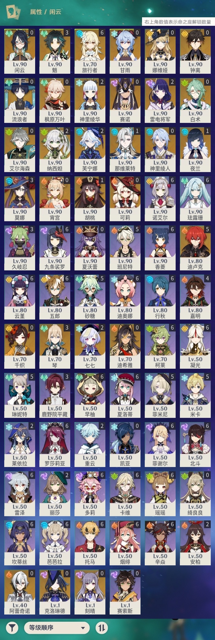 【原神】【lyys6963】冒险等级:60,五星数量:46,五星角色:迪卢克 5命魈 3命莫娜 3命琴 3命芙宁娜 2命雷电将军 2命七七 2命神里绫华 2命纳西妲 2命那维莱特 1命胡桃 1命夜兰 1命白术宵宫迪希雅钟离神里绫人娜维娅闲云千织赛诺阿蕾奇诺艾尔海森流浪者枫原万叶甘雨克洛琳德可莉刻晴__五星武器:苇海信标万世流涌大典鹤鸣余音阿莫斯之弓苍古自由之誓飞雷之弦振和璞鸢护摩之杖天空之傲天空之刃天空之翼雾切之回光薙草之稻光终末嗟叹之诗若水赤沙之杖千夜浮梦__四星角色:行秋 6命九条裟罗 6命香菱 6命珐露珊 6命凝光 6命迪奥娜 6命瑶瑶 6命坎蒂丝 6命多莉 6命柯莱 6命卡维 6命芭芭拉 6命云堇 6命早柚 6命托马 6命五郎 6命烟绯 6命辛焱 6命诺艾尔 6命罗莎莉亚 6命雷泽 6命菲谢尔 6命北斗 6命夏洛蒂 6命班尼特 5命砂糖 5命米卡 5命菲米尼 5命琳妮特 5命嘉明 4命久岐忍 3命鹿野院平藏 3命莱依拉 2命重云 2命绮良良夏沃蕾赛索斯