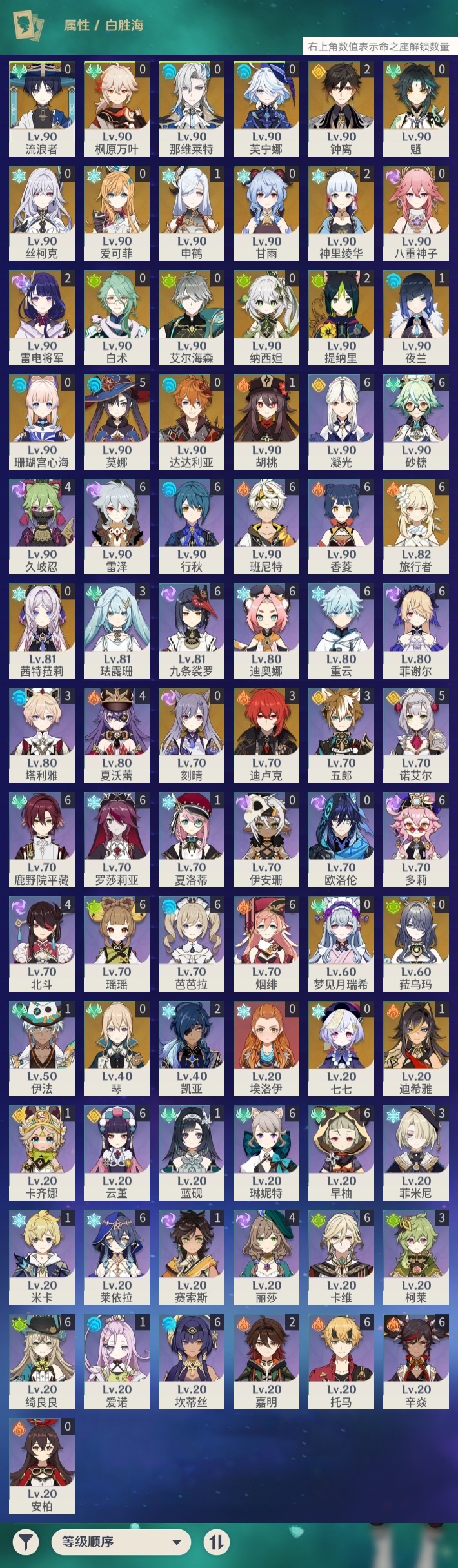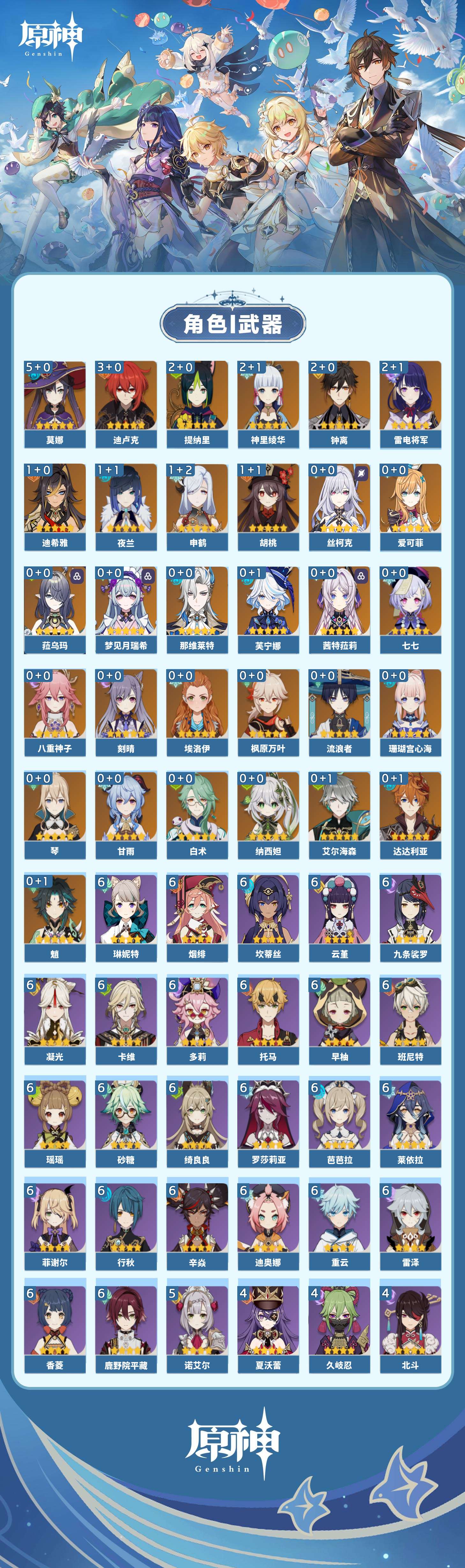 【原神】【lyys7233】冒险等级:60,五星数量:50,五星角色:莫娜 5命迪卢克 3命雷电将军 2命神里绫华 2命钟离 2命提纳里 2命迪希雅 1命胡桃 1命申鹤 1命夜兰 1命七七琴珊瑚宫心海白术茜特菈莉达达利亚梦见月瑞希八重神子那维莱特芙宁娜爱可菲丝柯克纳西妲菈乌玛艾尔海森流浪者枫原万叶甘雨魈刻晴__五星武器:天空之傲 2精息灾 2精冲浪时光焚曜千阳静水流涌之辉裁叶萃光飞雷之弦振风鹰剑和璞鸢护摩之杖四风原典天空之脊天空之翼雾切之回光薙草之稻光赤角石溃杵冬极白星波乱月白经津若水__四星角色:班尼特 6命行秋 6命九条裟罗 6命香菱 6命鹿野院平藏 6命凝光 6命迪奥娜 6命砂糖 6命绮良良 6命瑶瑶 6命莱依拉 6命坎蒂丝 6命多莉 6命卡维 6命芭芭拉 6命云堇 6命早柚 6命托马 6命烟绯 6命重云 6命辛焱 6命罗莎莉亚 6命雷泽 6命菲谢尔 6命琳妮特 6命诺艾尔 5命久岐忍 4命北斗 4命夏沃蕾 4命珐露珊 3命柯莱 3命五郎 3命菲米尼 3命塔利雅 3命嘉明 2命卡齐娜 1命米卡 1命蓝砚 1命夏洛蒂 1命伊法 1命爱诺 1命赛索斯 1命埃洛伊欧洛伦伊安珊