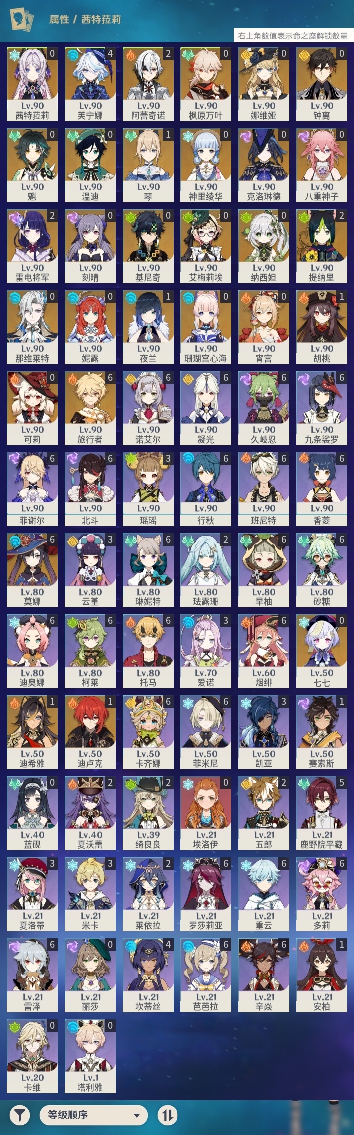 【原神】【lyys7284】冒险等级:60,五星数量:52,五星角色:莫娜 6命芙宁娜 4命阿蕾奇诺 2命雷电将军 2命提纳里 2命迪希雅 1命迪卢克 1命胡桃 1命琴 1命夜兰 1命七七艾梅莉埃基尼奇珊瑚宫心海神里绫华温迪茜特菈莉宵宫钟离八重神子那维莱特娜维娅妮露纳西妲枫原万叶魈克洛琳德可莉刻晴__五星武器:阿莫斯之弓 2精风鹰剑 2精护摩之杖 2精柔灯挽歌山王长牙祭星者之望万世流涌大典金流监督静水流涌之辉裁断赤月之形飞雷之弦振和璞鸢磐岩结绿四风原典天空之傲天空之脊天空之刃天空之翼雾切之回光神乐之真意千夜浮梦__四星角色:卡齐娜 6命班尼特 6命行秋 6命九条裟罗 6命香菱 6命久岐忍 6命凝光 6命迪奥娜 6命砂糖 6命多莉 6命柯莱 6命芭芭拉 6命早柚 6命托马 6命烟绯 6命重云 6命辛焱 6命诺艾尔 6命罗莎莉亚 6命雷泽 6命菲谢尔 6命北斗 6命菲米尼 6命琳妮特 6命鹿野院平藏 5命坎蒂丝 4命瑶瑶 3命米卡 3命云堇 3命夏洛蒂 3命爱诺 3命珐露珊 2命绮良良 2命莱依拉 2命五郎 2命夏沃蕾 2命赛索斯 1命埃洛伊卡维蓝砚塔利雅