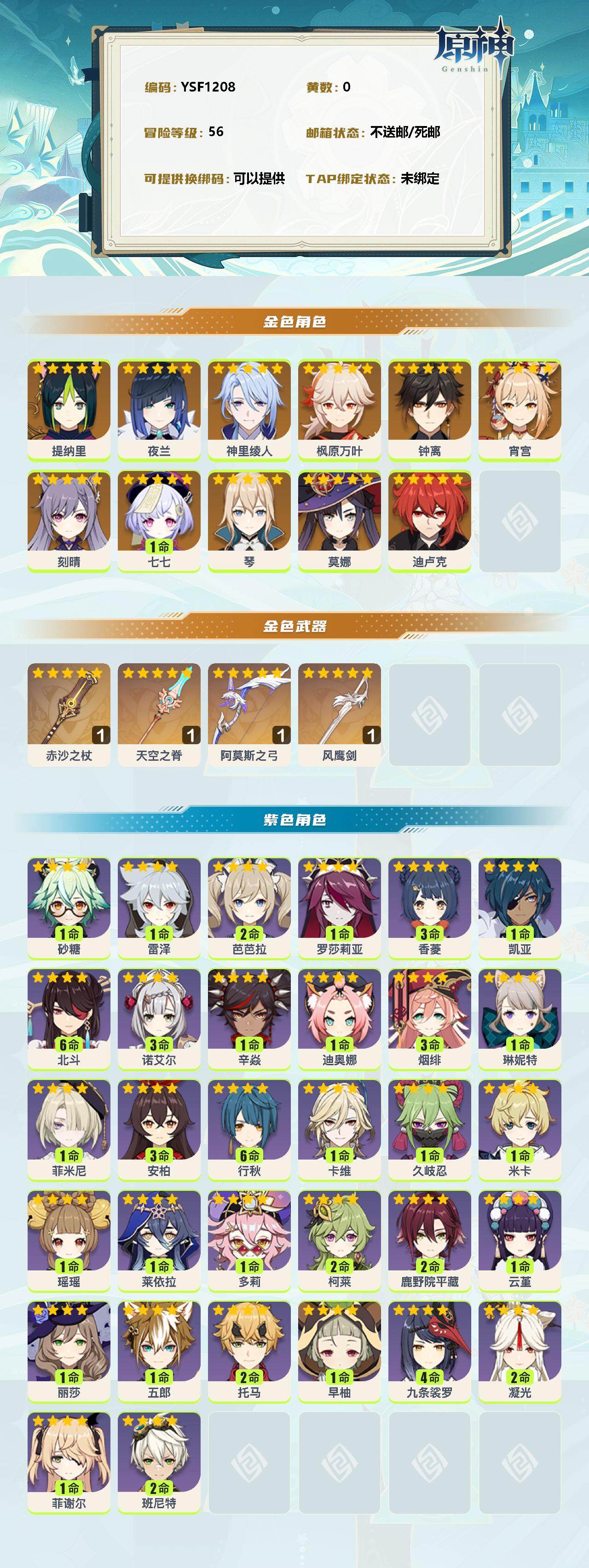 【ysf1208】56级/男主/13个五星角色/0命提纳里/0命夜兰/0命神里绫人/0命宵宫/0命枫原万叶/0命钟离/0命琴/0命刻晴/0命迪卢克/0命莫娜/1命七七/精1赤沙之杖/精1阿莫斯之弓/精1风鹰剑/精1天空之脊/0命菲米尼/0命琳妮特/0命卡维/1命米卡/1命瑶瑶/1命莱依拉/0命多莉/2命柯莱/2命鹿野院平藏/1命久岐忍/0命云堇/1命五郎/2命托马/4命九条裟罗/0命早柚/3命烟绯/0命罗莎莉亚/0命辛焱/0命迪奥娜/0命砂糖/1命雷泽/0命菲谢尔/0命丽莎/满命北斗/3命香菱/3命安柏/2命班尼特/满命行秋/2命芭芭拉/2命凝光/3命诺艾尔/0命凯亚