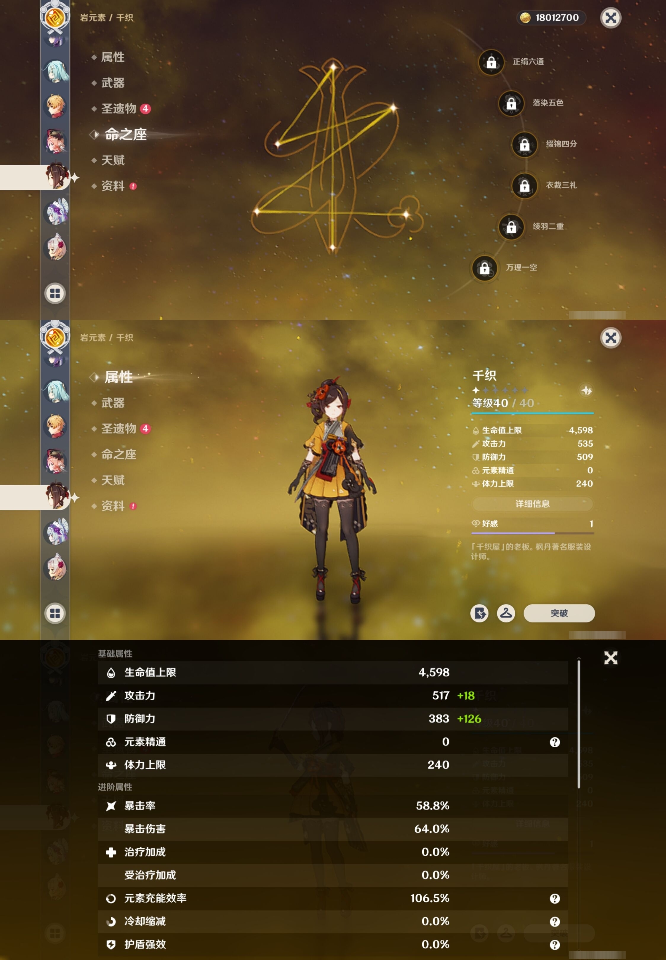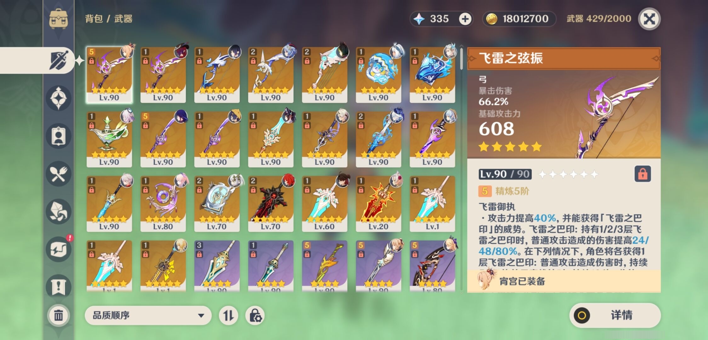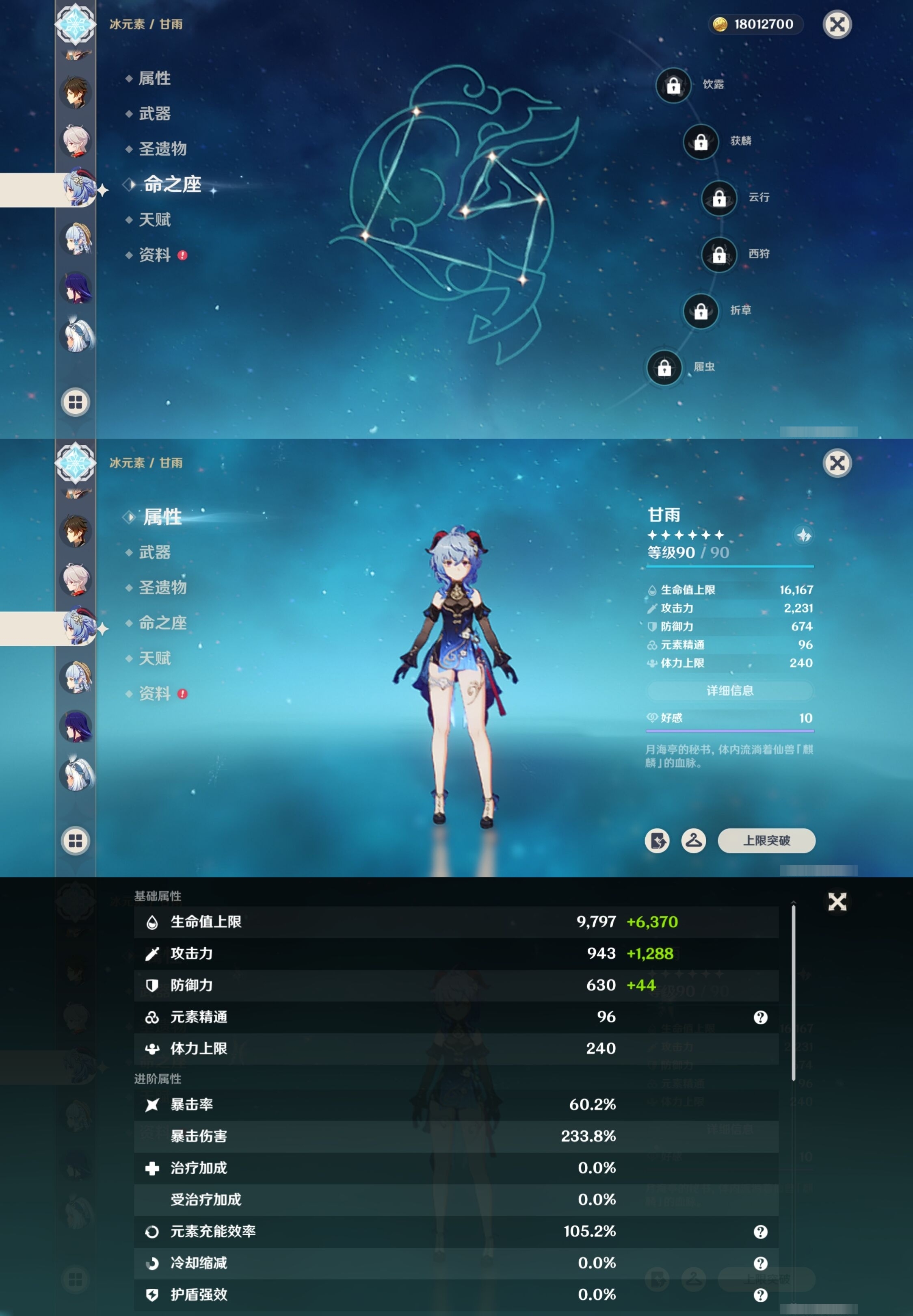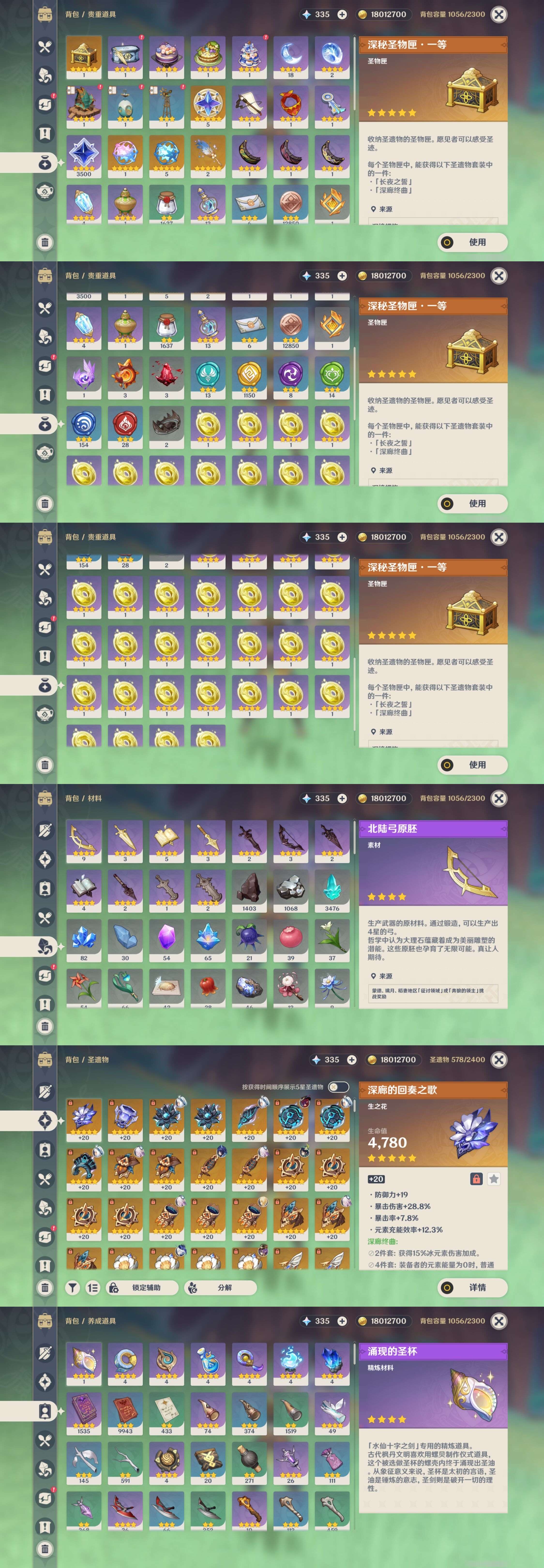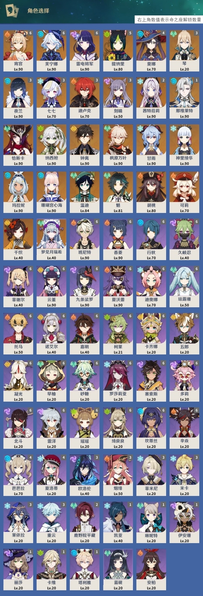 [13292552]107黄 风系:0命恰斯卡/3命琴/0命枫原万叶/0命温迪/0命魈/0命梦见月瑞希 火系:0命胡桃/0命可莉/3命迪卢克/6命宵宫 水系:0命玛拉妮/1命那维莱特/3命夜兰/0命珊瑚宫心海/4命莫娜/6命芙宁娜 冰系:0命甘雨/0命神里绫华/3命七七/2命茜特菈莉 岩系:0命钟离/0命千织 雷系:6命雷电将军/3命刻晴 草系:0命纳西妲/5命提纳里 [四星角色等级及命座] 风系: 6命珐露珊/0命蓝砚/1命琳妮特/2命鹿野院平藏/6命早柚/6命砂糖 火系: 6命班尼特/6命香菱/6命夏沃蕾/6命托马/3命烟绯/6命嘉明/6命辛焱/0命安柏 水系:6命行秋/4命芭芭拉/1命塔利雅/6命坎蒂丝 冰系:6命迪奥娜/1命凯亚/4命夏洛蒂/3命菲米尼/3命米卡/3命莱依拉/6命罗莎莉亚/3命重云 岩系:6命云堇/6命诺艾尔/6命五郎/6命凝光 雷系:3命欧洛伦/6命久岐忍/6命菲谢尔/6命九条裟罗/1命伊安珊/6命赛索斯/6命多莉/6命北斗/6命雷泽/1命丽莎 草系:6命柯莱/1命卡维/6命瑶瑶/6命绮良良 [角色经验书] 紫色1535/蓝色9943/绿色433 [小物品] 脆弱树脂18/异梦溶媒4/嬗变之尘1637 [特殊材料] 东风之翎1/东风之爪1/东风的吐息7/北风之尾4/北风之环4/北风的魂匣4/吞天之鲸·只角14 魔王之刃·残片15/武炼之魂·孤影16/龙王之冕11/血玉之枝9/鎏金之鳞7/智识之冕20