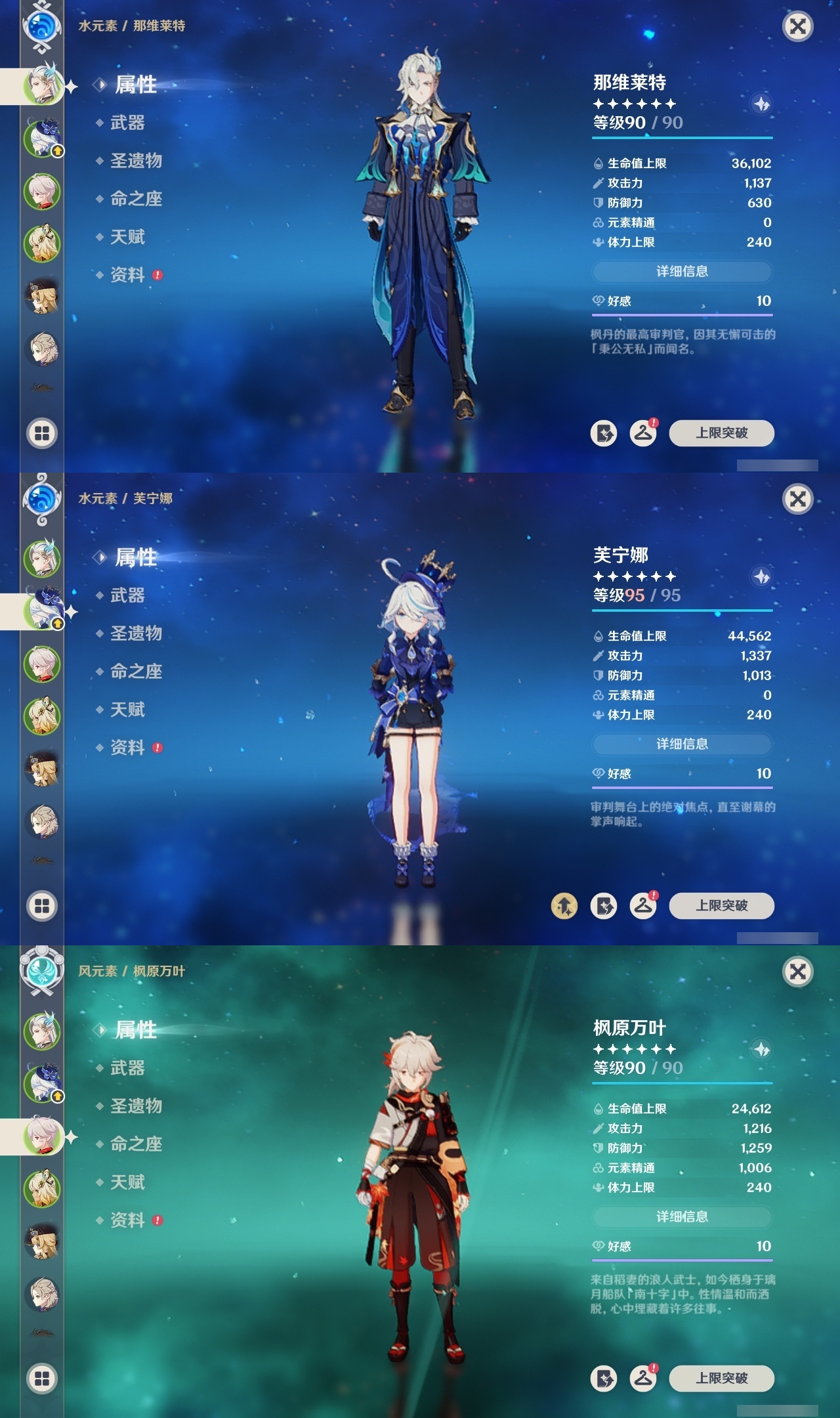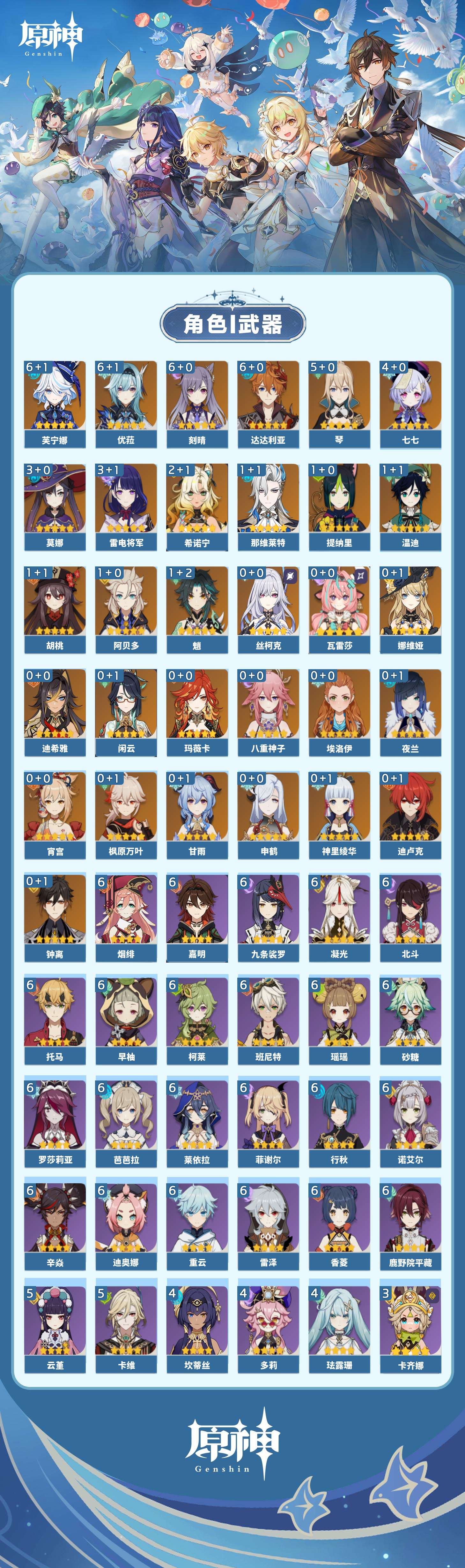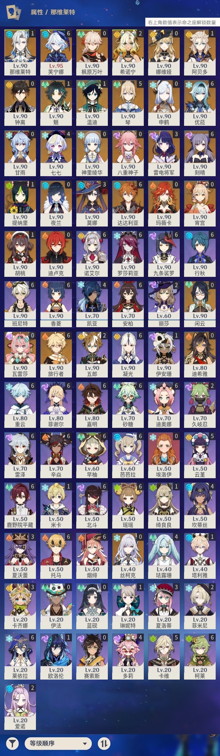 【原神】满命,冒险等级:60,五星数量:58,五星角色:芙宁娜 6命达达利亚 6命刻晴 6命优菈 6命琴 5命七七 4命雷电将军 3命莫娜 3命希诺宁 2命那维莱特 1命魈 1命胡桃 1命温迪 1命阿贝多 1命提纳里 1命神里绫华玛薇卡宵宫迪希雅钟离申鹤瓦雷莎八重神子夜兰娜维娅闲云丝柯克迪卢克枫原万叶甘雨__五星武器:四风原典 3精天空之脊 3精风鹰剑 2精和璞鸢 2精天空之刃 2精岩峰巡歌万世流涌大典静水流涌之辉裁断鹤鸣余音裁叶萃光阿莫斯之弓苍古自由之誓护摩之杖狼的末路松籁响起之时天空之傲天空之卷天空之翼无工之剑雾切之回光薙草之稻光终末嗟叹之诗贯虹之槊若水圣显之钥白雨心弦__四星角色:班尼特 6命行秋 6命九条裟罗 6命香菱 6命鹿野院平藏 6命凝光 6命迪奥娜 6命砂糖 6命瑶瑶 6命莱依拉 6命柯莱 6命芭芭拉 6命早柚 6命托马 6命烟绯 6命重云 6命辛焱 6命诺艾尔 6命罗莎莉亚 6命雷泽 6命菲谢尔 6命北斗 6命嘉明 6命卡维 5命云堇 5命珐露珊 4命坎蒂丝 4命多莉 4命卡齐娜 3命夏洛蒂 3命夏沃蕾 3命久岐忍 2命五郎 2命菲米尼 2命爱诺 2命绮良良 1命米卡 1命欧洛伦 1命琳妮特 1命伊安珊 1命塔利雅 1命埃洛伊蓝砚伊法赛索斯