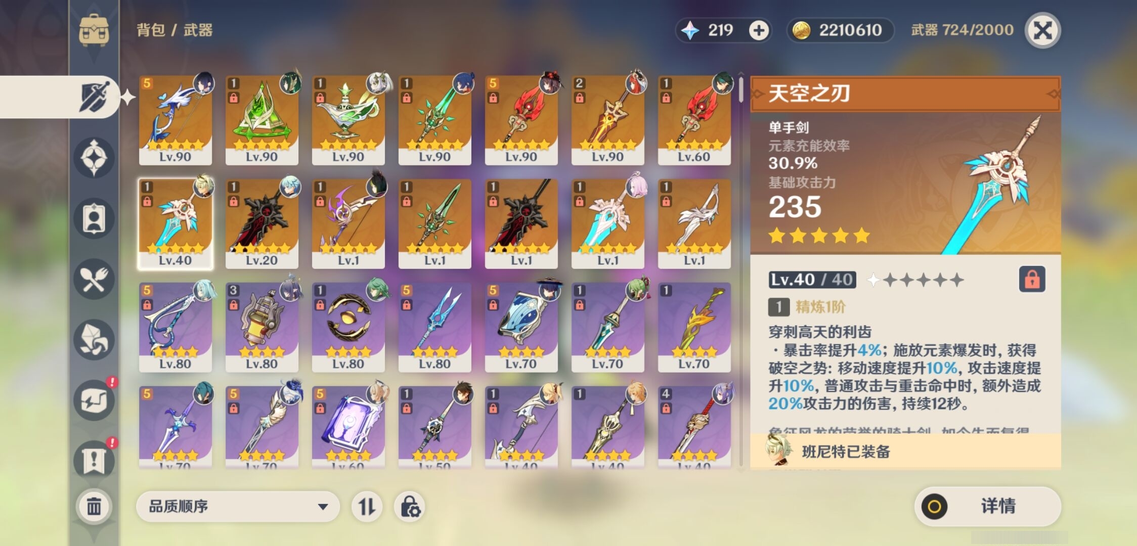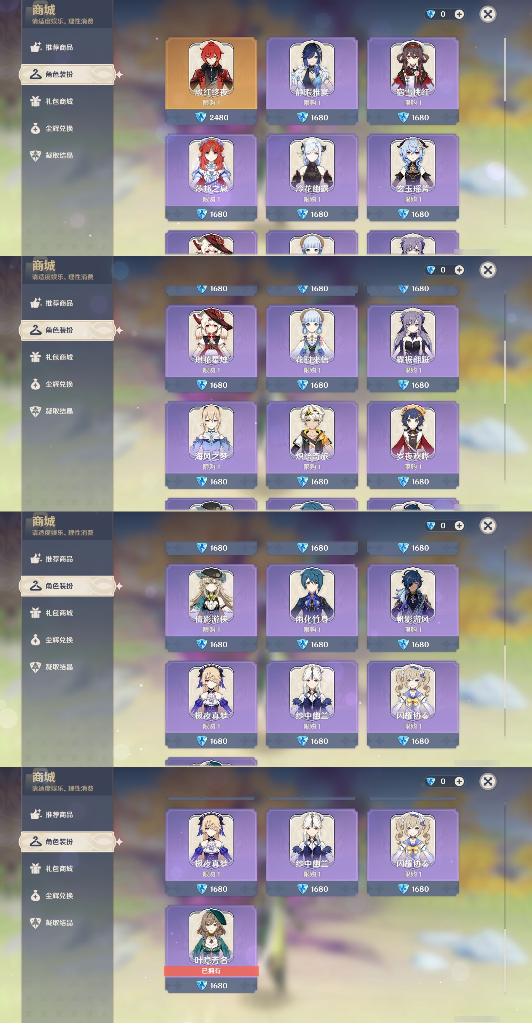 [13330578]92黄 风:1命魈,2命枫原万叶,0命流浪者,0命琴 火:6命胡桃,2命迪希雅,3命迪卢克 水:2命妮露,6命夜兰,1命达达利亚,0命芙宁娜,3命莫娜 冰:2命七七 岩:0命钟离 雷:0命雷电将军,6命刻晴 草:0命菈乌玛,6命纳西妲,6命奈芙尔,0命白术,2命提纳里 弓:精5若水,精1飞雷之弦振 法器:精1真语秘匣,精1千夜浮梦 单手剑:精2圣显之钥,精1天空之刃,精1风鹰剑 双手剑:精1狼的末路,精1狼的末路,精1天空之傲 长柄武器:精1和璞鸢,精1和璞鸢,精5护摩之杖,精1护摩之杖 【角色皮肤】 四星角色:丽莎-叶隐芳名