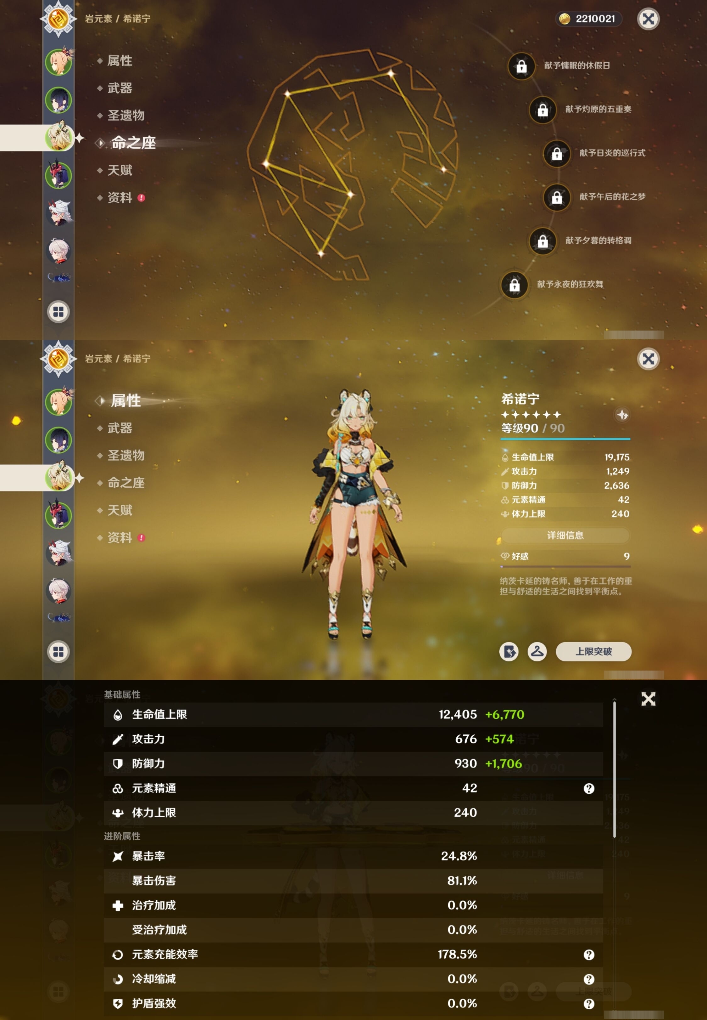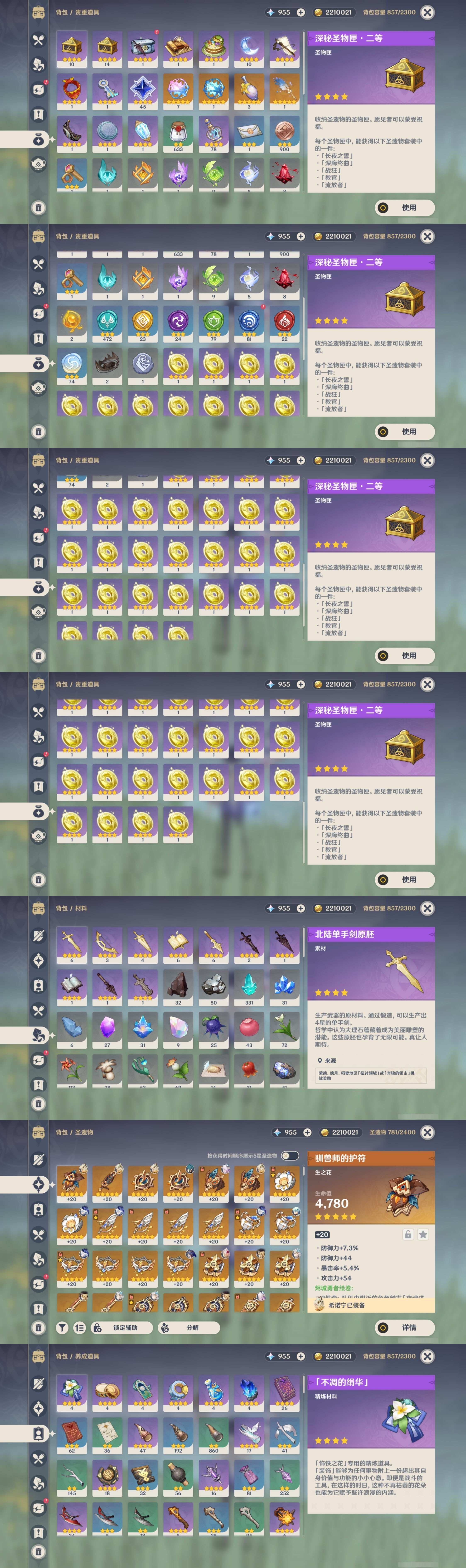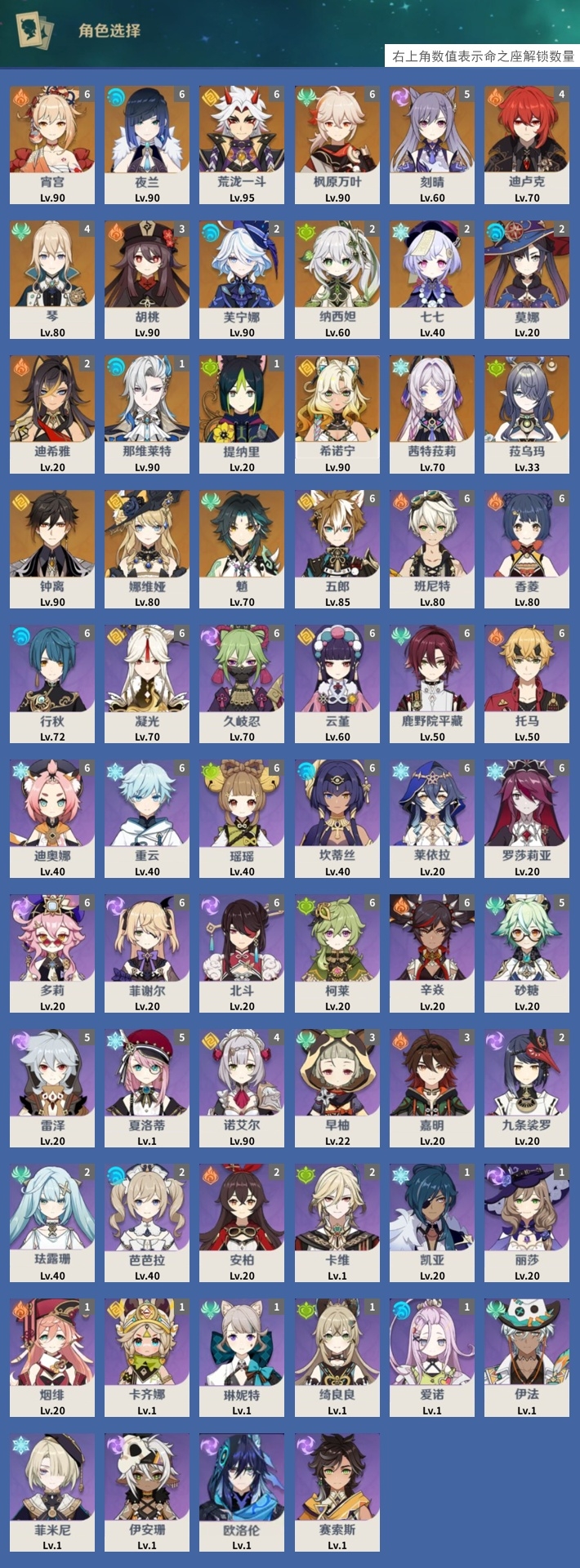 [13333098]110黄 风系:6命枫原万叶/4命琴/0命魈 火系:3命胡桃/4命迪卢克/2命迪希雅/6命宵宫 水系:6命夜兰/2命芙宁娜/1命那维莱特/2命莫娜 冰系:0命茜特菈莉/2命七七 岩系:0命希诺宁/6命荒泷一斗/0命钟离/0命娜维娅 雷系:5命刻晴 草系:2命纳西妲/0命菈乌玛/1命提纳里 [四星角色等级及命座] 风系: 6命鹿野院平藏/2命珐露珊/3命早柚/5命砂糖/0命伊法/1命琳妮特 火系: 6命班尼特/6命香菱/6命托马/3命嘉明/1命烟绯/6命辛焱/2命安柏 水系:6命行秋/6命坎蒂丝/2命芭芭拉/1命爱诺 冰系:6命迪奥娜/6命重云/6命莱依拉/6命罗莎莉亚/1命凯亚/5命夏洛蒂/0命菲米尼 岩系:4命诺艾尔/6命五郎/6命凝光/6命云堇 雷系:2命九条裟罗/6命久岐忍/6命多莉/6命菲谢尔/6命北斗/5命雷泽/1命丽莎/0命伊安珊/0命欧洛伦/0命赛索斯 草系:6命瑶瑶/6命柯莱/2命卡维/1命绮良良 [角色经验书] 紫色26/蓝色62/绿色36 [小物品] 脆弱树脂10/异梦溶媒1/嬗变之尘633 [特殊材料] 东风之翎2/东风之爪1/东风的吐息3/北风之尾2/北风之环4/北风的魂匣/吞天之鲸·只角 魔王之刃·残片8/武炼之魂·孤影6/龙王之冕5/血玉之枝14/鎏金之鳞3/智识之冕4