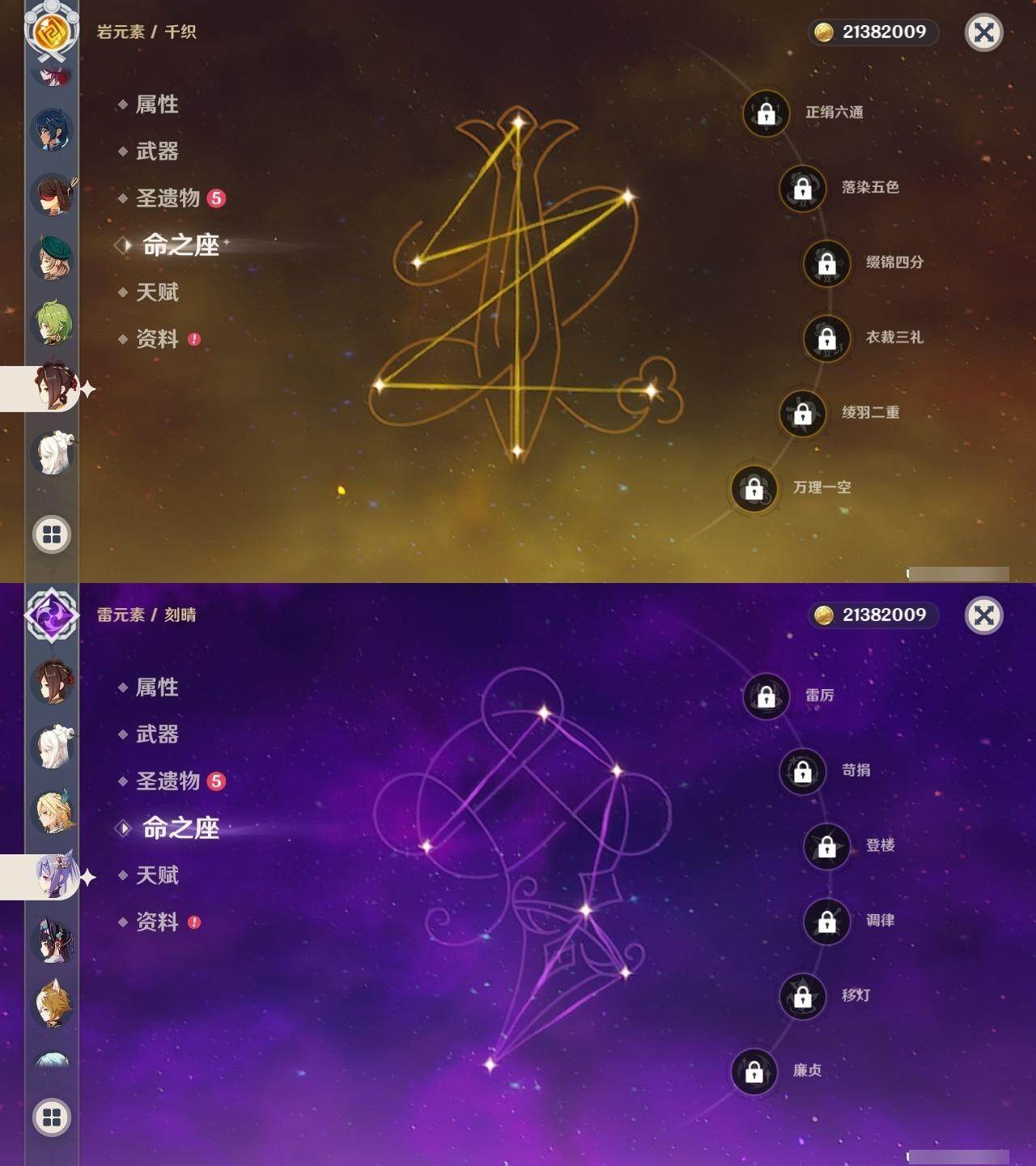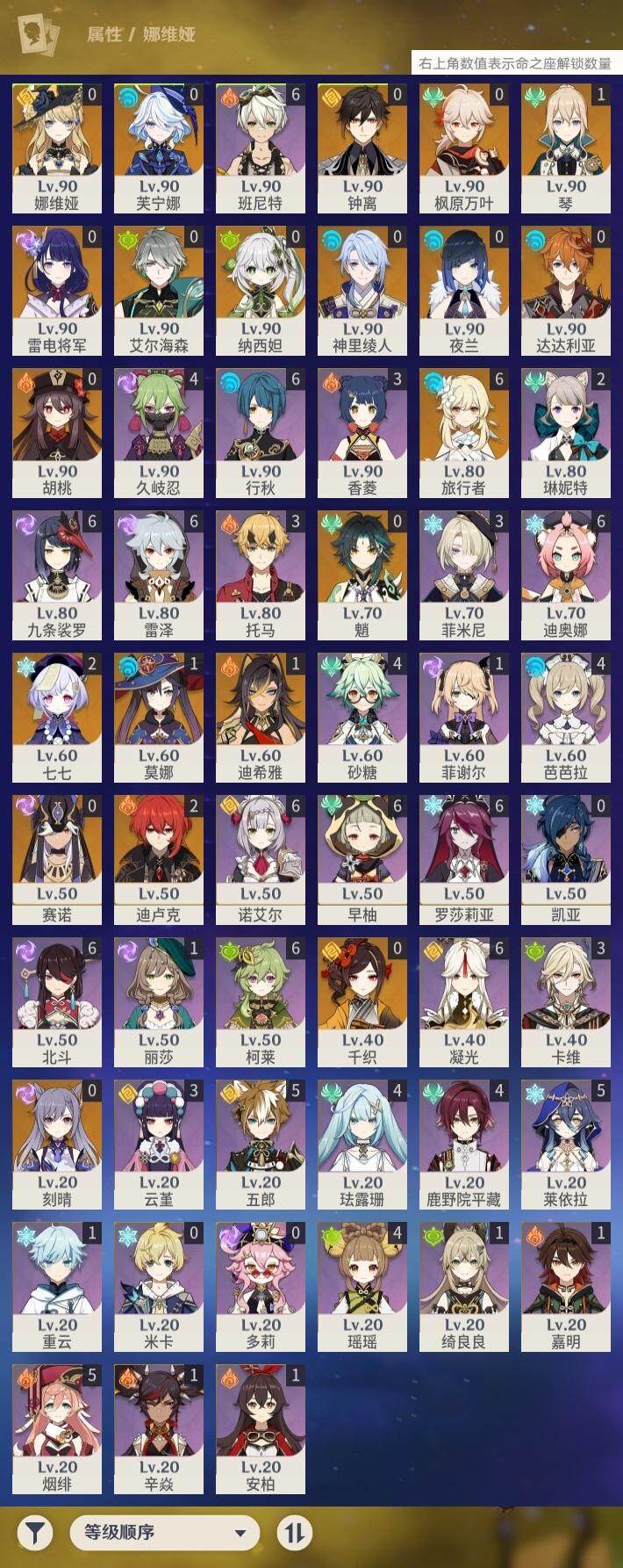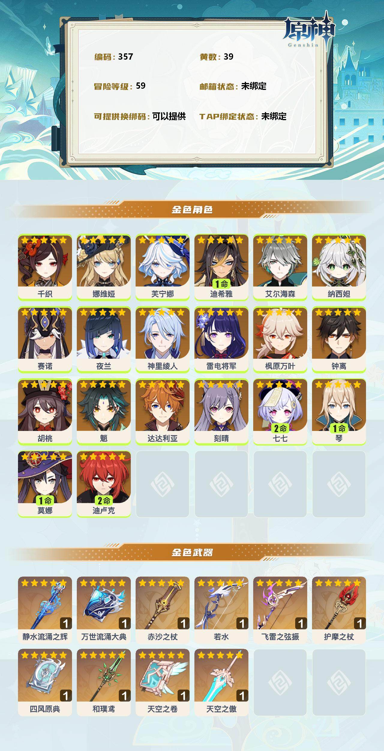 59级/39黄/女主/20个五星角色/12个五星武器 0命千织0命娜维娅0命芙宁娜1命迪希雅0命艾尔海森0命纳西妲0命赛诺0命夜兰0命神里绫人0命雷电将军0命枫原万叶0命钟离0命胡桃0命魈0命达达利亚0命刻晴2命七七1命琴1命莫娜2命迪卢克精1静水流涌之辉精1万世流涌大典精1赤沙之杖精1若水精1飞雷之弦振精1护摩之杖精1四风原典精1和璞鸢精1天空之卷精1天空之傲