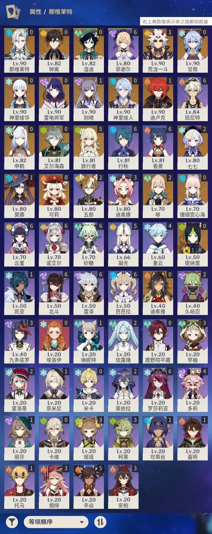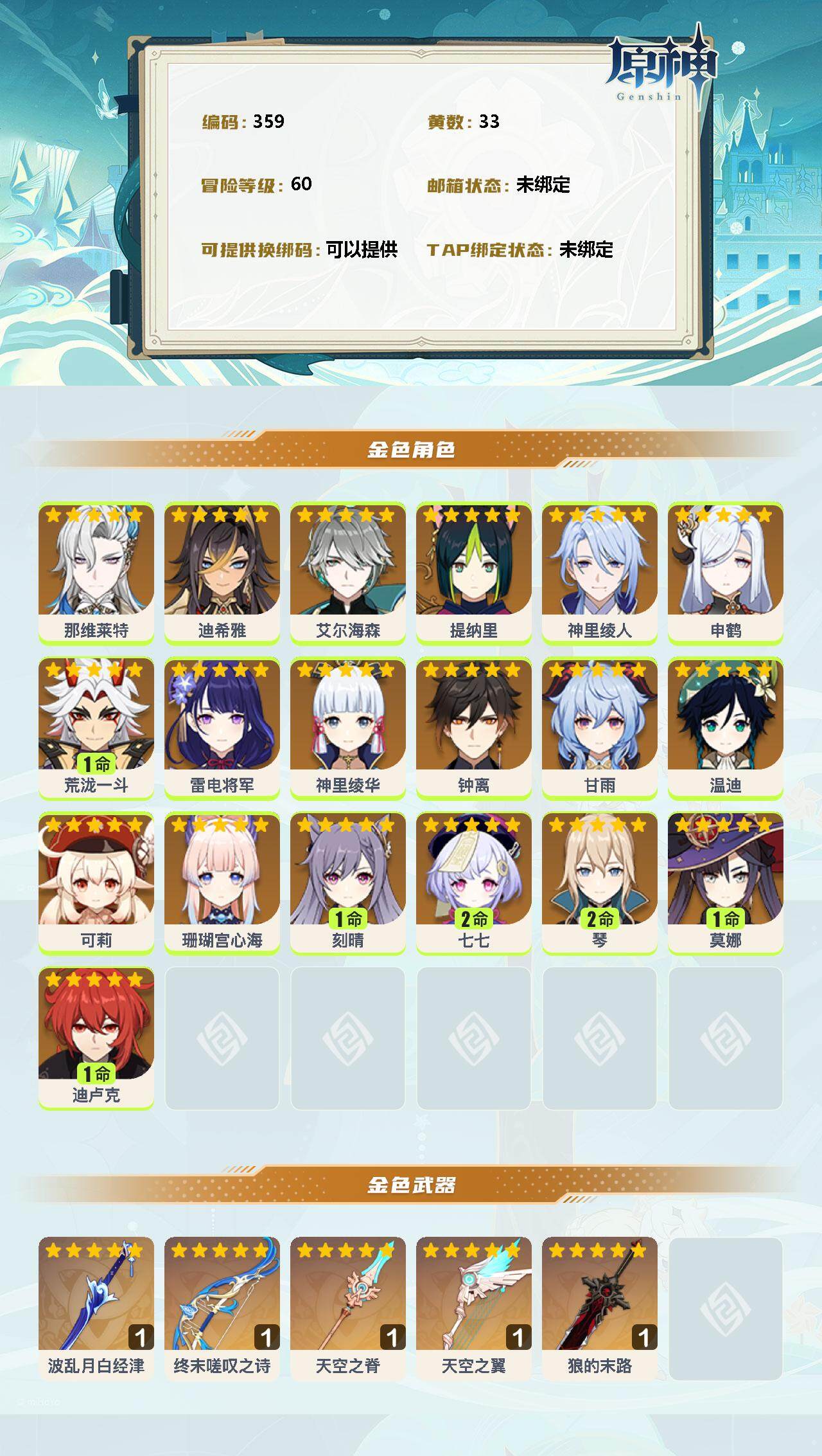 60级/33黄/女主/19个五星角色/6个五星武器 0命那维莱特0命迪希雅0命艾尔海森0命提纳里0命神里绫人0命申鹤1命荒泷一斗0命雷电将军0命神里绫华0命钟离0命甘雨0命温迪0命可莉0命珊瑚宫心海1命刻晴2命七七2命琴1命莫娜1命迪卢克精1波乱月白经津精1终末嗟叹之诗精1天空之脊精1天空之翼精1狼的末路