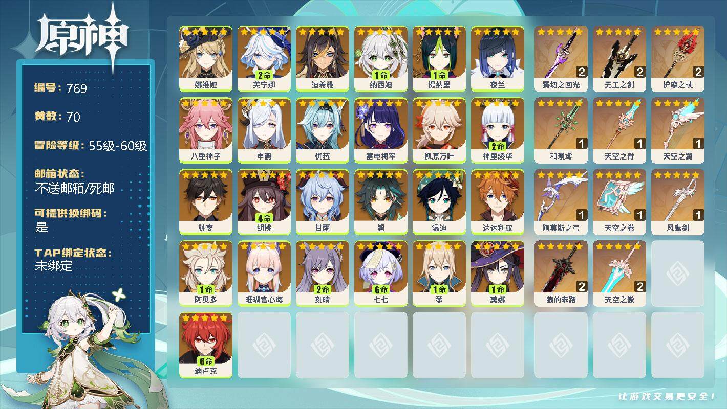 [13349251]60级/70黄/女主/25个五星角色/13个五星武器 0命娜维娅2命芙宁娜0命迪希雅1命纳西妲1命提纳里0命夜兰0命八重神子0命申鹤0命优菈0命雷电将军0命枫原万叶2命神里绫华0命钟离4命胡桃0命甘雨0命魈0命温迪0命达达利亚1命阿贝多0命珊瑚宫心海2命刻晴满命七七1命琴1命莫娜满命迪卢克精2雾切之回光精2无工之剑精2护摩之杖精1和璞鸢精1天空之脊精1天空之翼精1阿莫斯之弓精1天空之卷精1风鹰剑精2狼的末路精2天空之傲