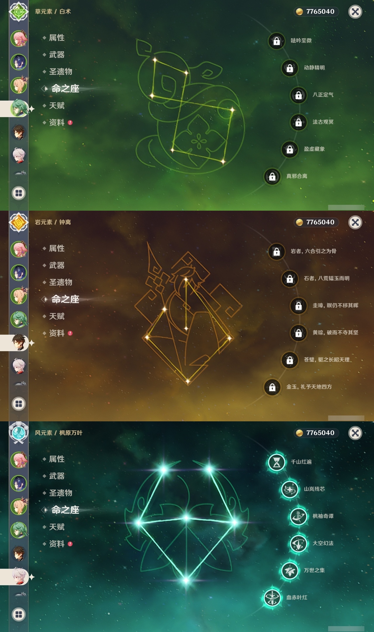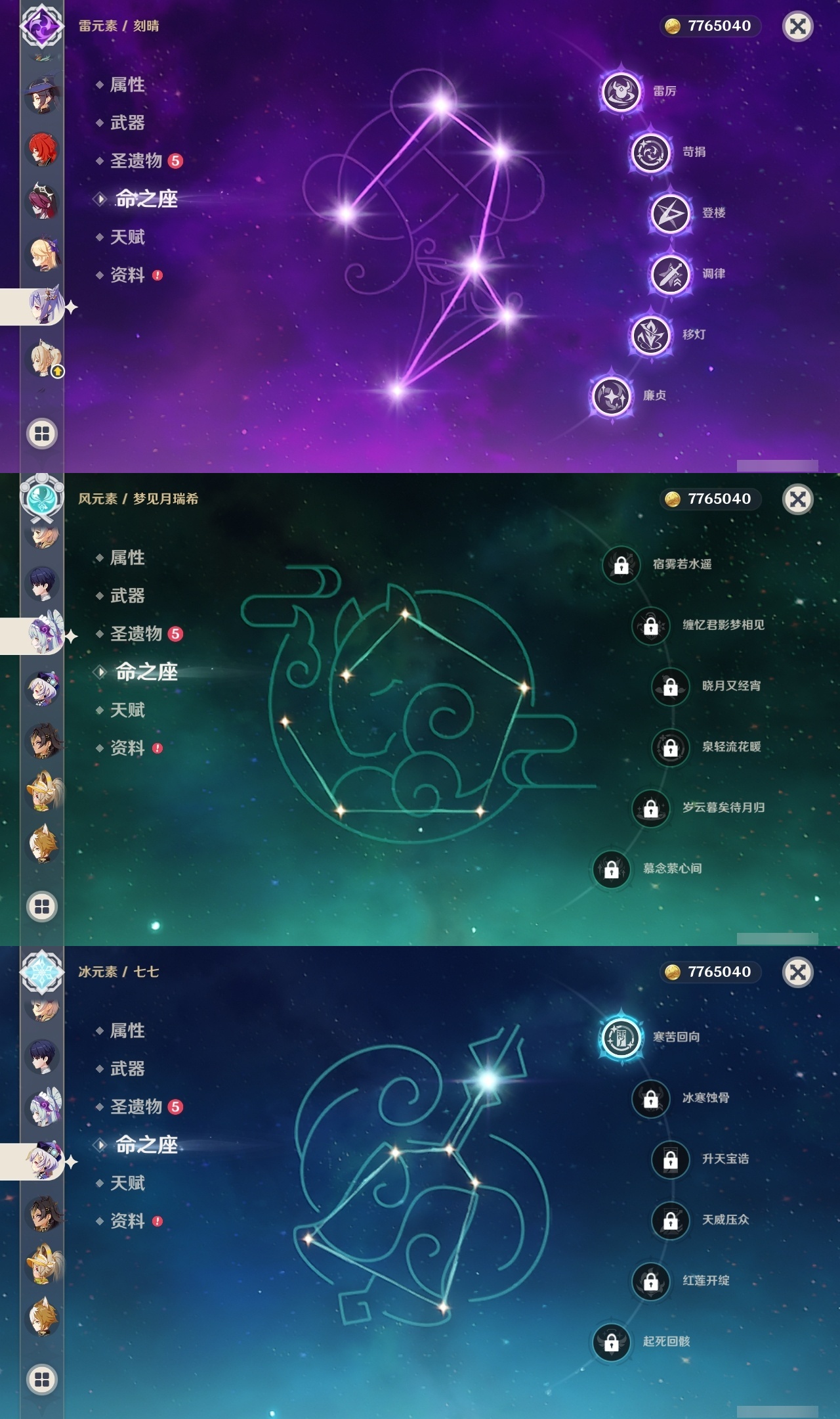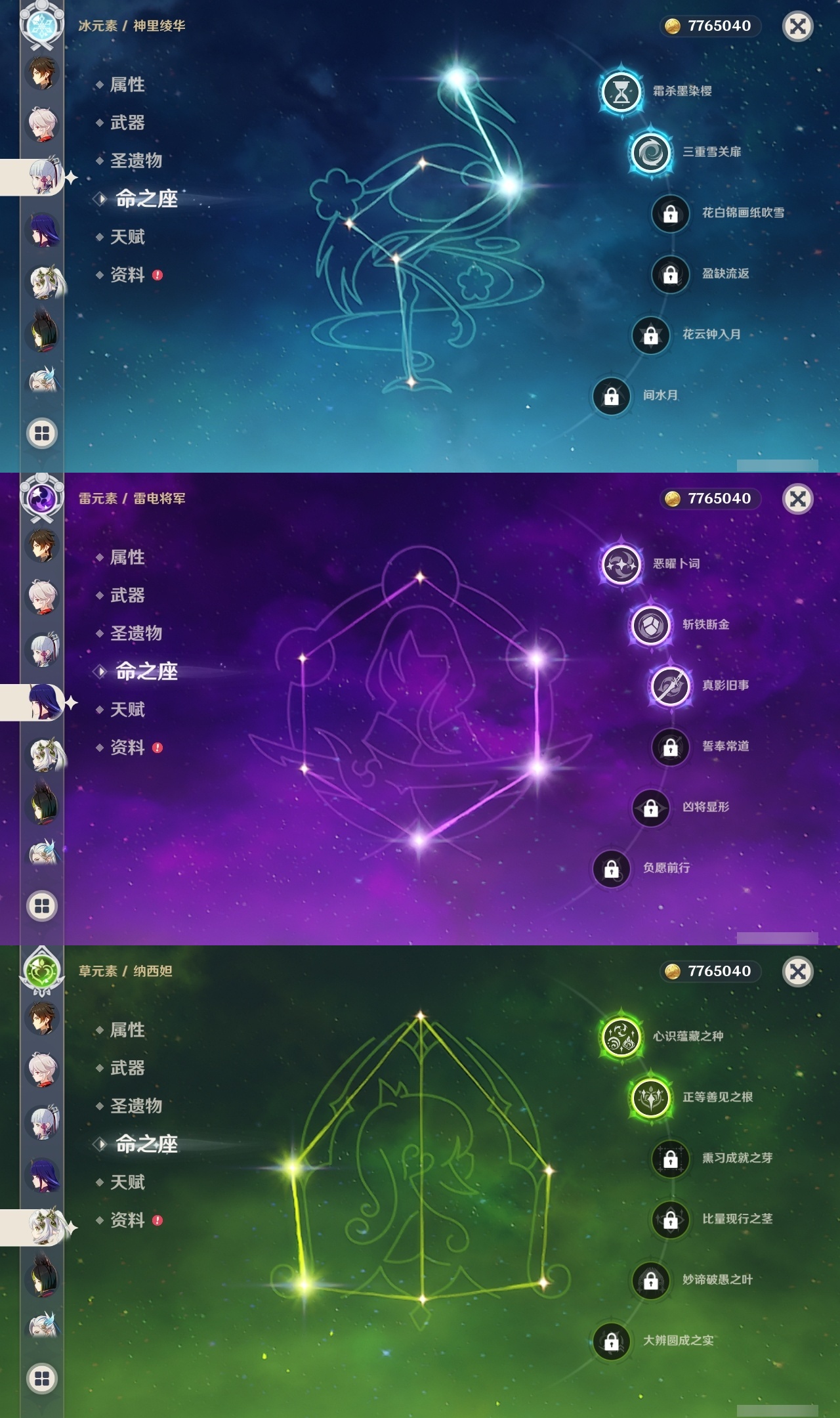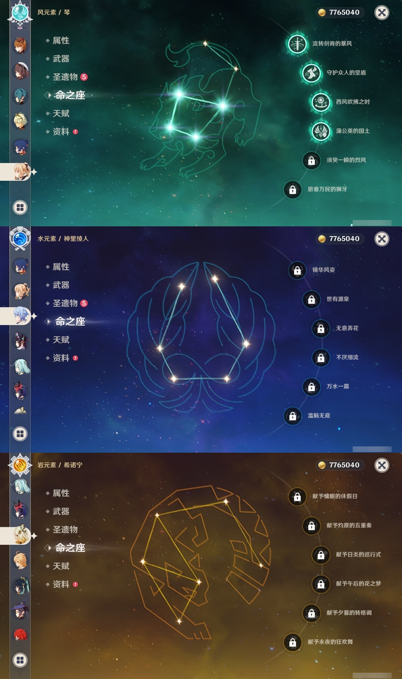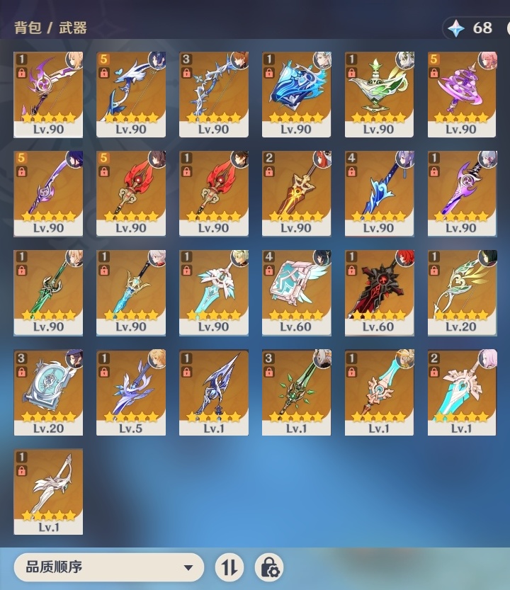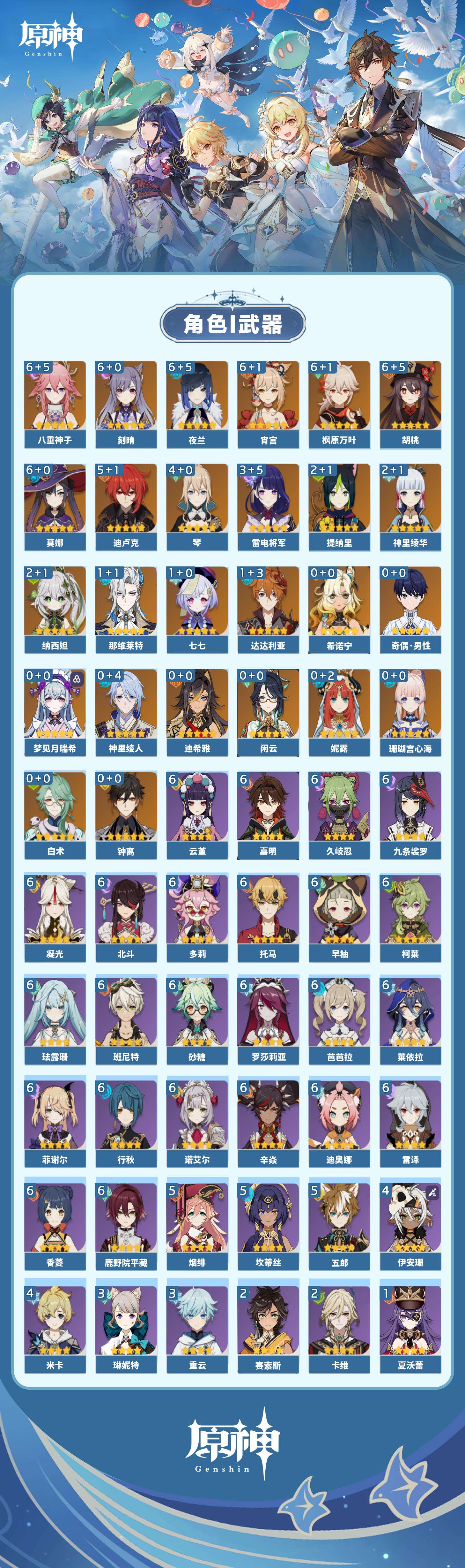 【原神】满命,冒险等级:59,五星数量:50,五星角色:枫原万叶 6命胡桃 6命刻晴 6命莫娜 6命宵宫 6命八重神子 6命夜兰 6命迪卢克 5命琴 4命雷电将军 3命神里绫华 2命提纳里 2命纳西妲 2命那维莱特 1命达达利亚 1命七七 1命珊瑚宫心海希诺宁白术迪希雅钟离梦见月瑞希神里绫人闲云妮露__五星武器:护摩之杖 5精薙草之稻光 5精神乐之真意 5精若水 5精天空之卷 4精波乱月白经津 4精和璞鸢 3精四风原典 3精冬极白星 3精天空之傲 2精圣显之钥 2精万世流涌大典苍耀血染荒城苍古自由之誓飞雷之弦振风鹰剑狼的末路磐岩结绿天空之脊天空之刃雾切之回光猎人之径千夜浮梦__四星角色:班尼特 6命行秋 6命九条裟罗 6命香菱 6命久岐忍 6命鹿野院平藏 6命珐露珊 6命凝光 6命迪奥娜 6命砂糖 6命莱依拉 6命多莉 6命柯莱 6命芭芭拉 6命云堇 6命早柚 6命托马 6命辛焱 6命诺艾尔 6命罗莎莉亚 6命雷泽 6命菲谢尔 6命北斗 6命嘉明 6命坎蒂丝 5命五郎 5命烟绯 5命米卡 4命伊安珊 4命重云 3命琳妮特 3命卡维 2命赛索斯 2命绮良良 1命夏沃蕾 1命奇偶·男性卡齐娜瑶瑶欧洛伦蓝砚菲米尼夏洛蒂伊法爱诺