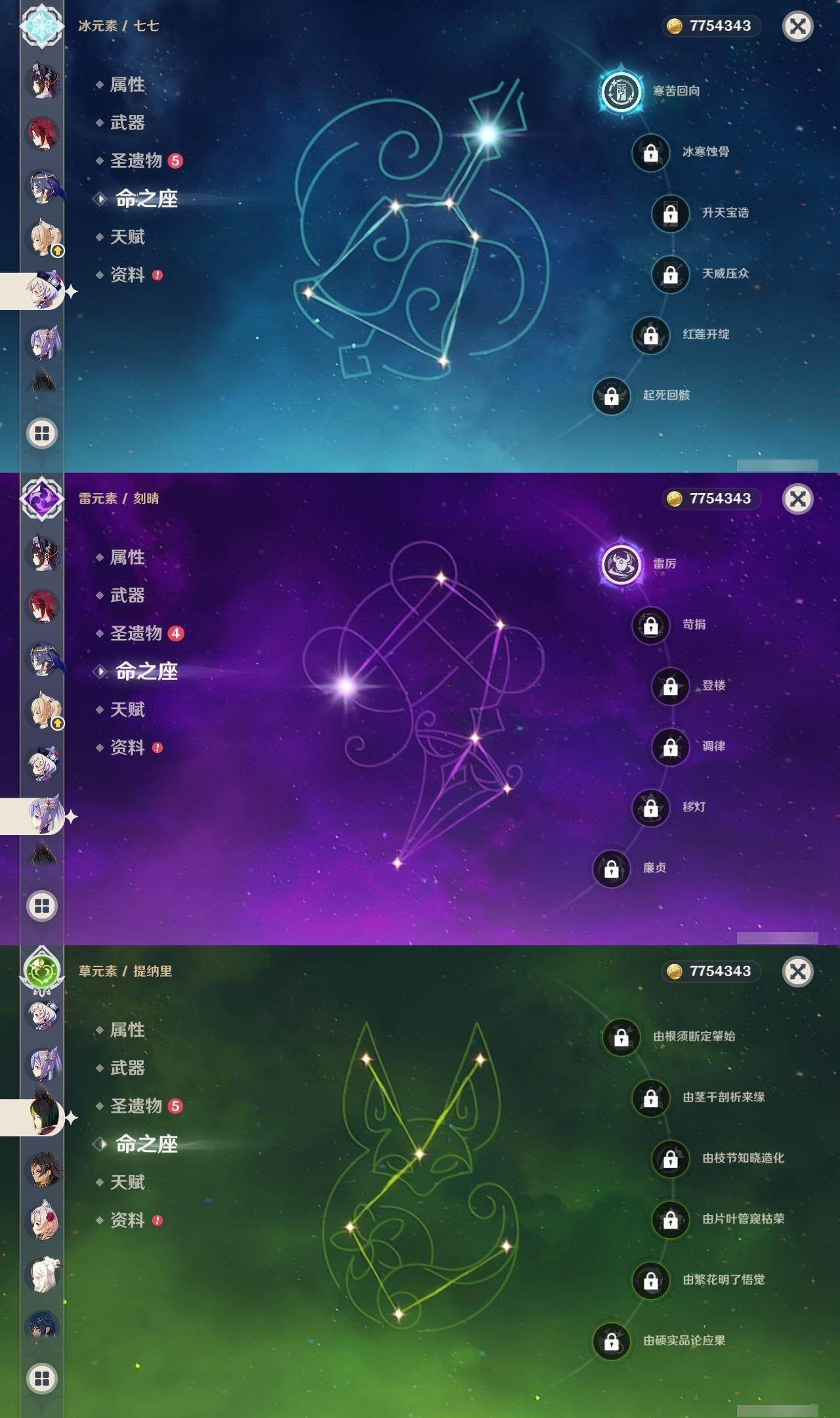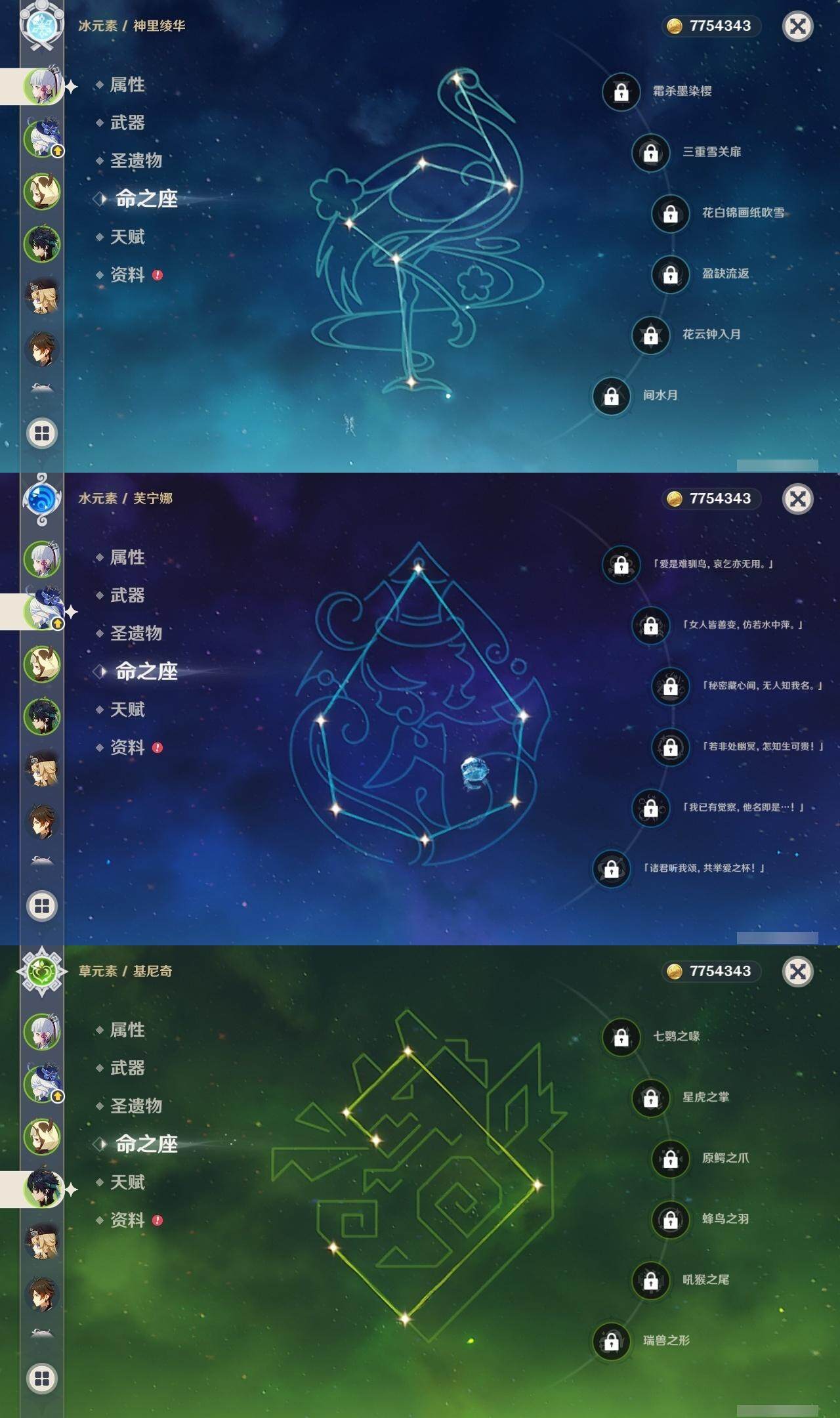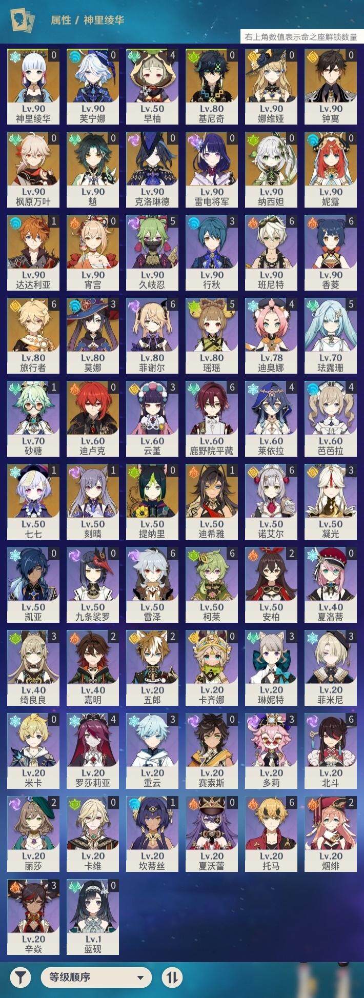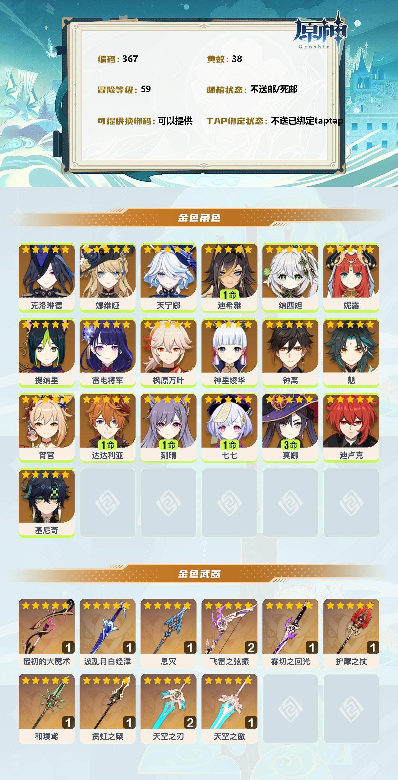 59级/38黄/男主/19个五星角色/10个五星武器 0命克洛琳德0命娜维娅0命芙宁娜1命迪希雅0命纳西妲0命妮露0命提纳里0命雷电将军0命枫原万叶0命神里绫华0命钟离0命魈0命宵宫1命达达利亚1命刻晴1命七七3命莫娜0命迪卢克0命基尼奇精1最初的大魔术精1波乱月白经津精1息灾精2飞雷之弦振精1雾切之回光精1护摩之杖精1和璞鸢精1贯虹之槊精2天空之刃精1天空之傲