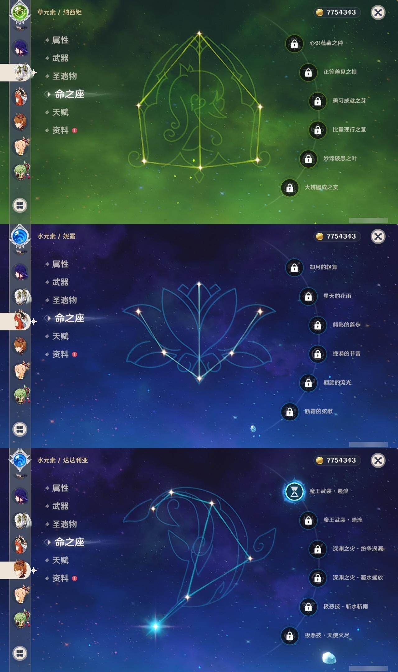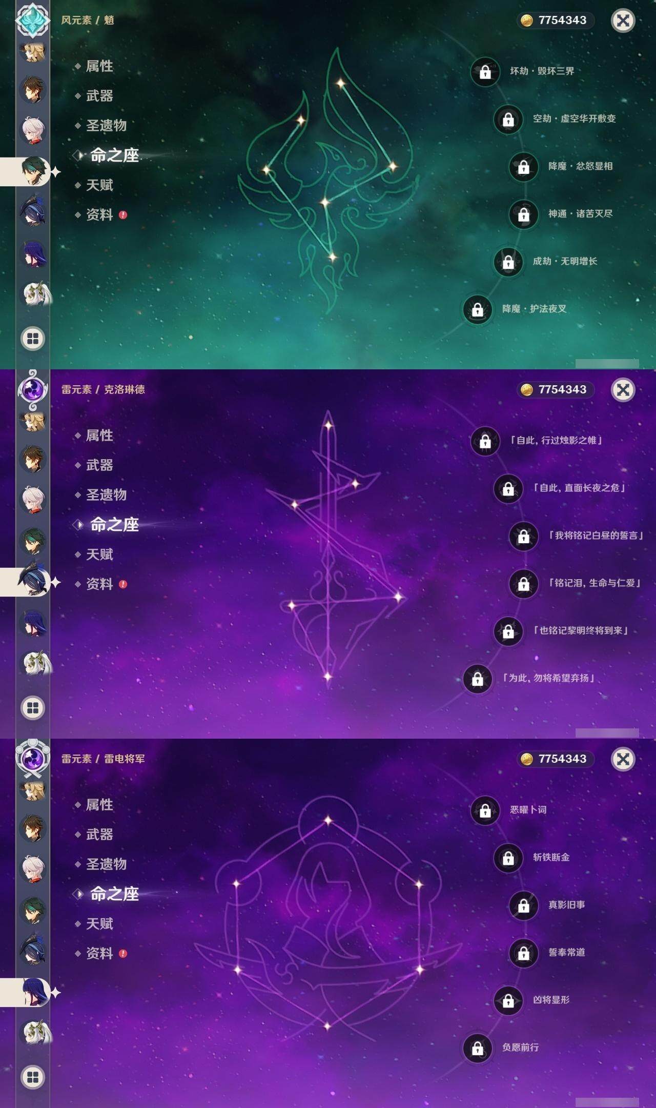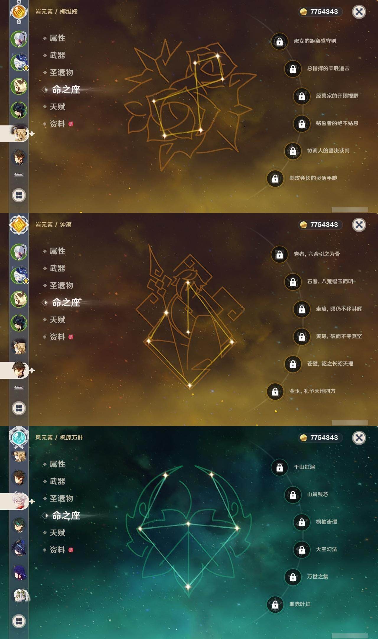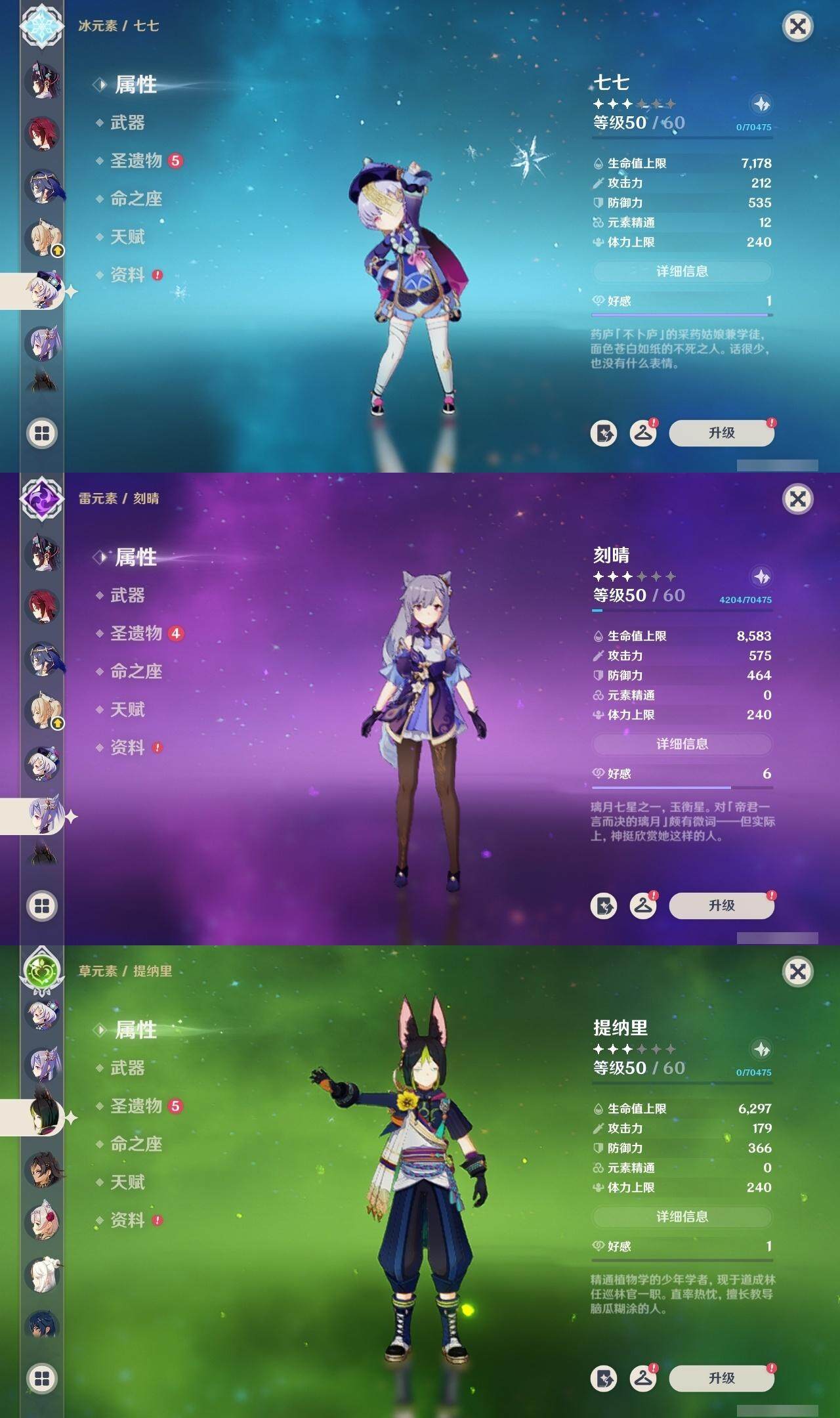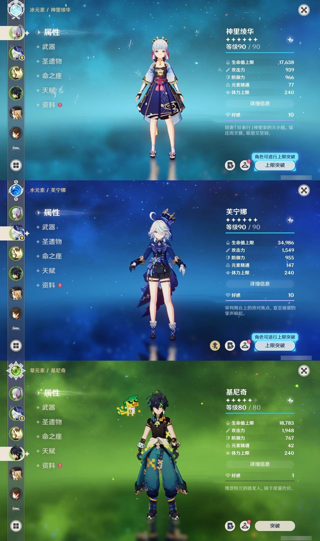 59级/38黄/男主/19个五星角色/10个五星武器 0命克洛琳德0命娜维娅0命芙宁娜1命迪希雅0命纳西妲0命妮露0命提纳里0命雷电将军0命枫原万叶0命神里绫华0命钟离0命魈0命宵宫1命达达利亚1命刻晴1命七七3命莫娜0命迪卢克0命基尼奇精1最初的大魔术精1波乱月白经津精1息灾精2飞雷之弦振精1雾切之回光精1护摩之杖精1和璞鸢精1贯虹之槊精2天空之刃精1天空之傲