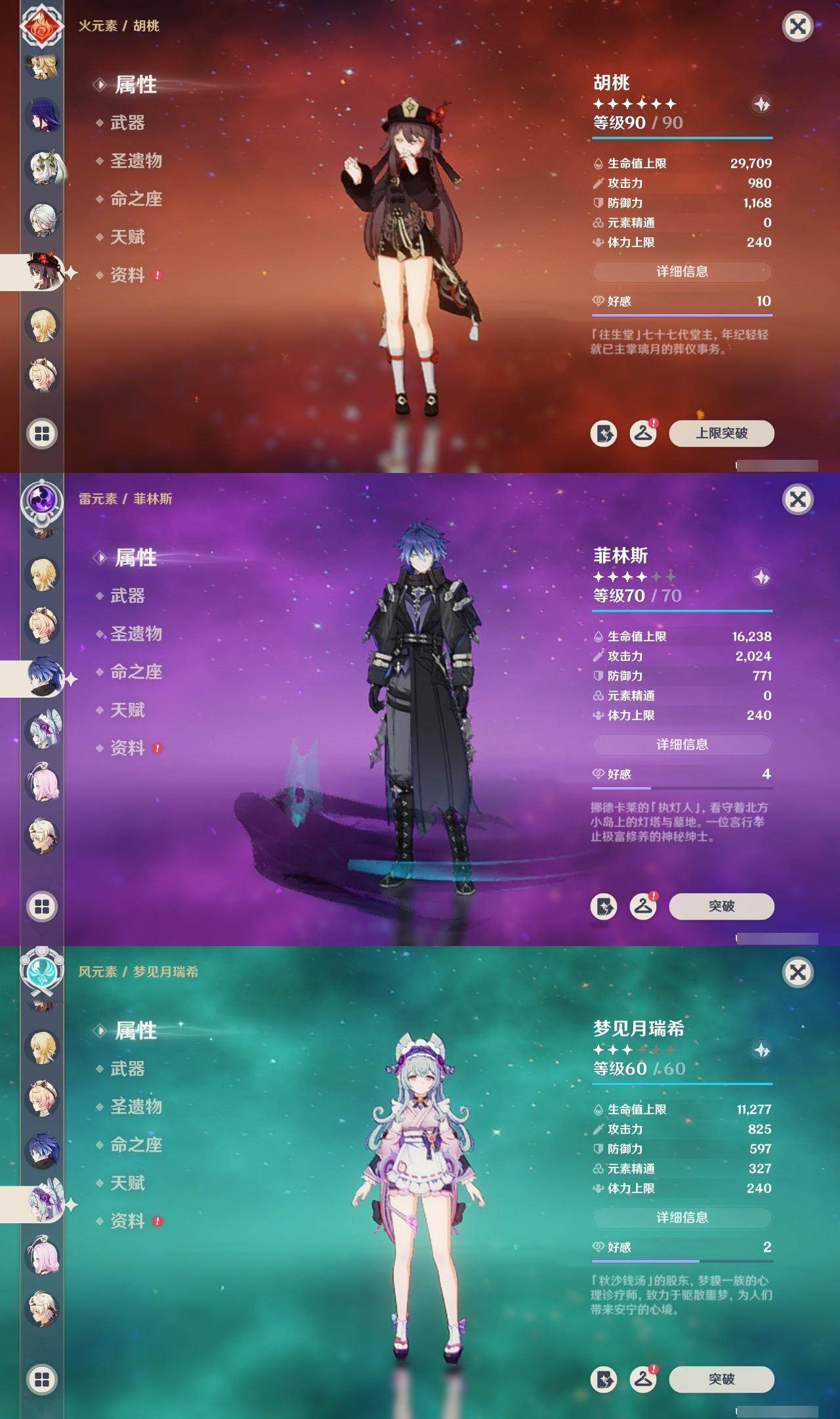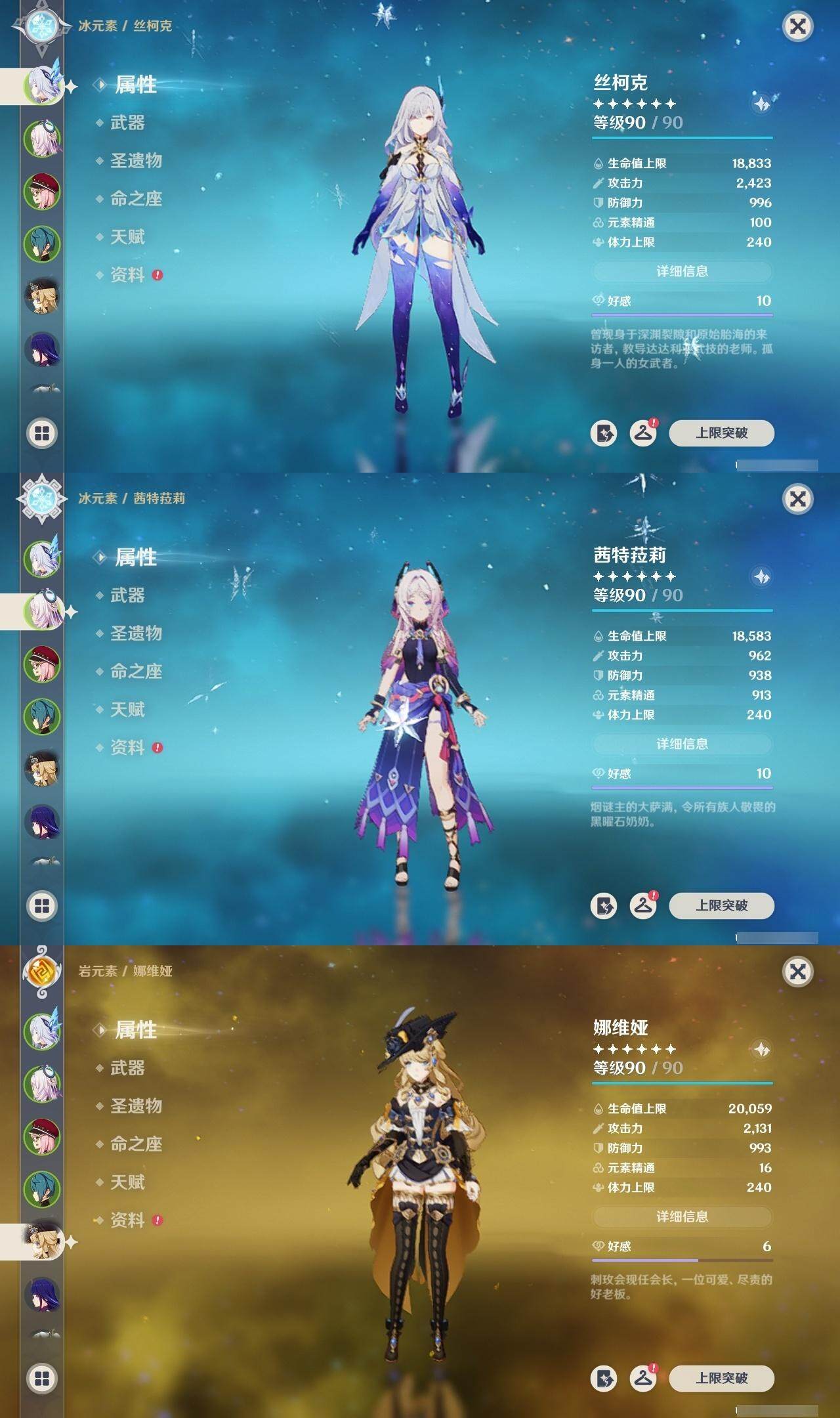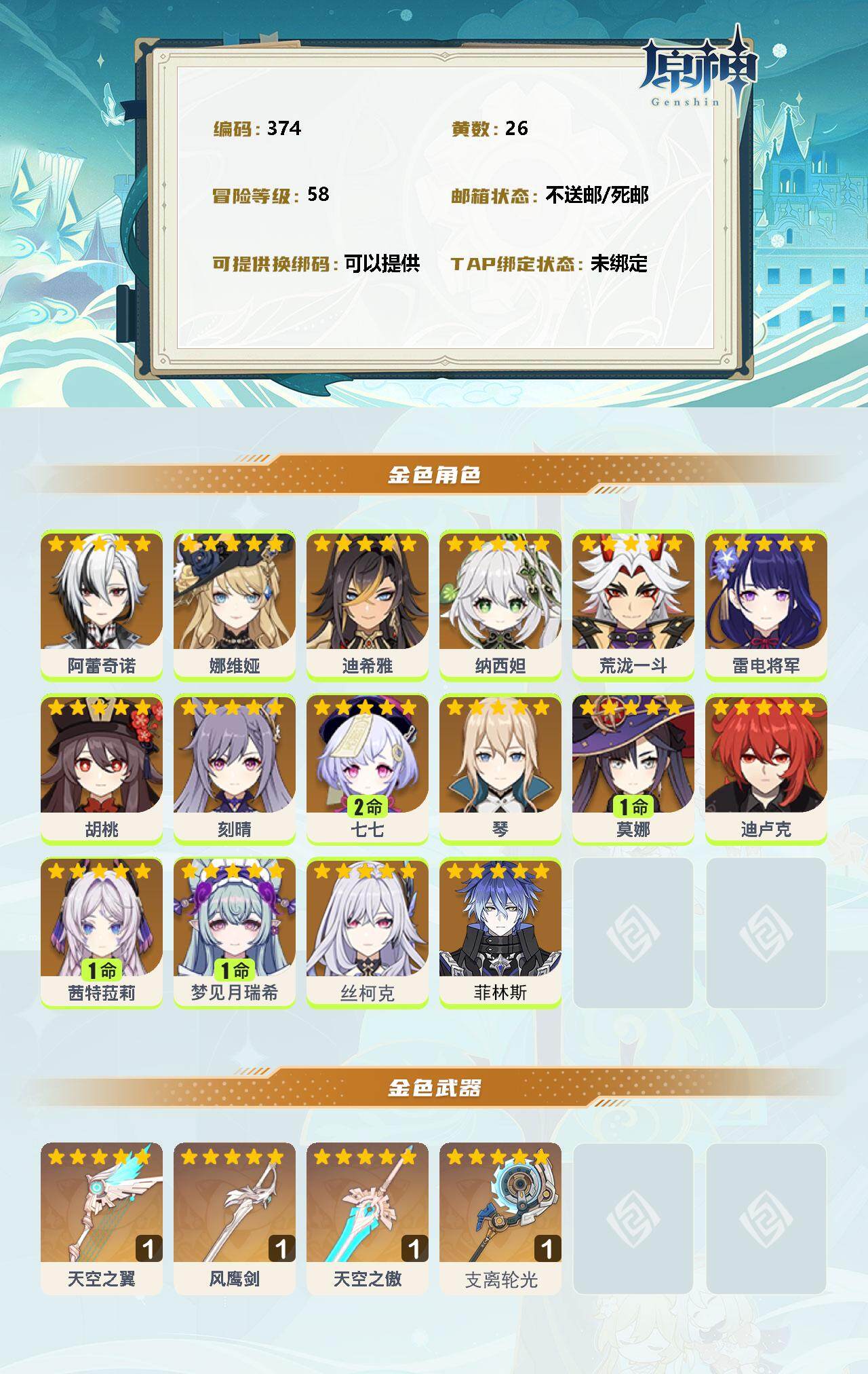 58级/26黄/女主/16个五星角色/5个五星武器 0命阿蕾奇诺0命娜维娅0命迪希雅0命纳西妲0命荒泷一斗0命雷电将军0命胡桃0命刻晴2命七七0命琴1命莫娜0命迪卢克1命茜特菈莉1命梦见月瑞希0命丝柯克0命菲林斯精1天空之翼精1风鹰剑精1天空之傲精1支离轮光