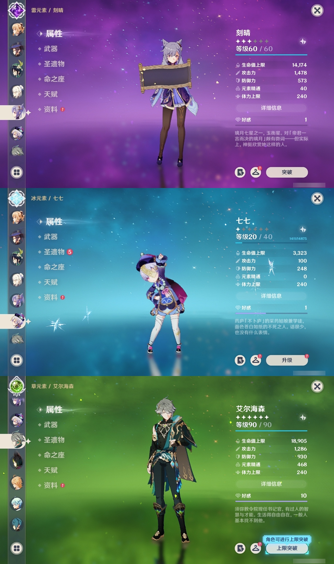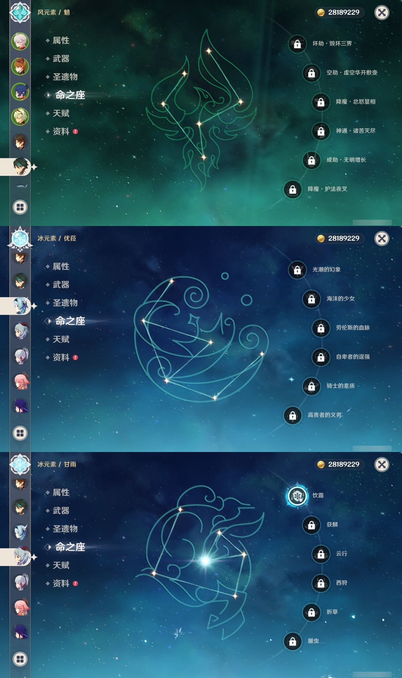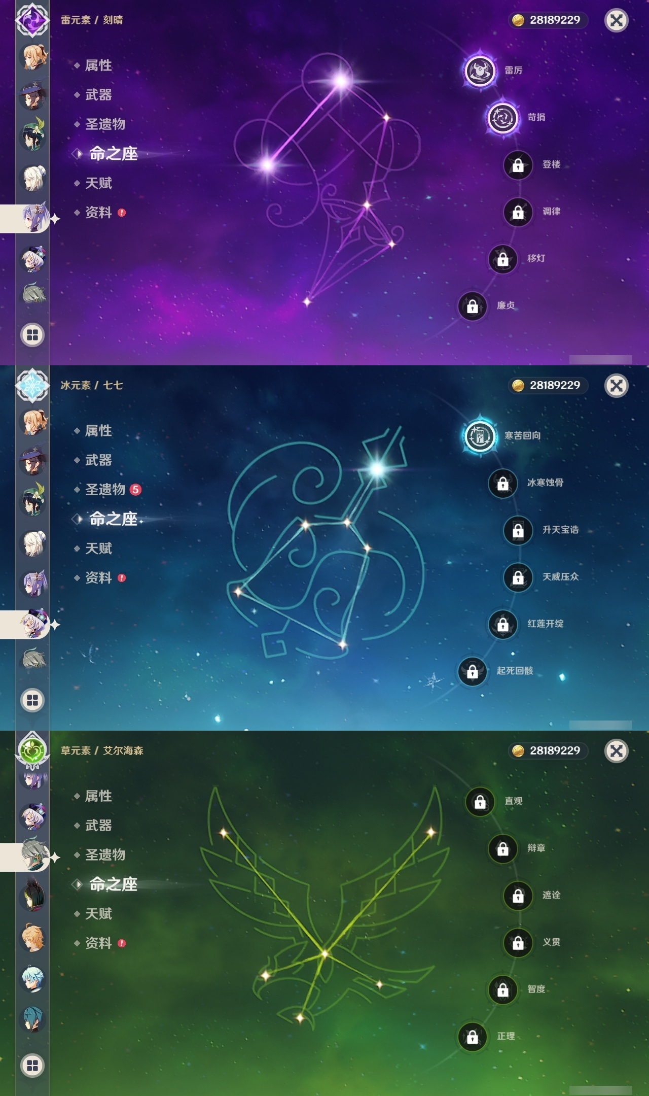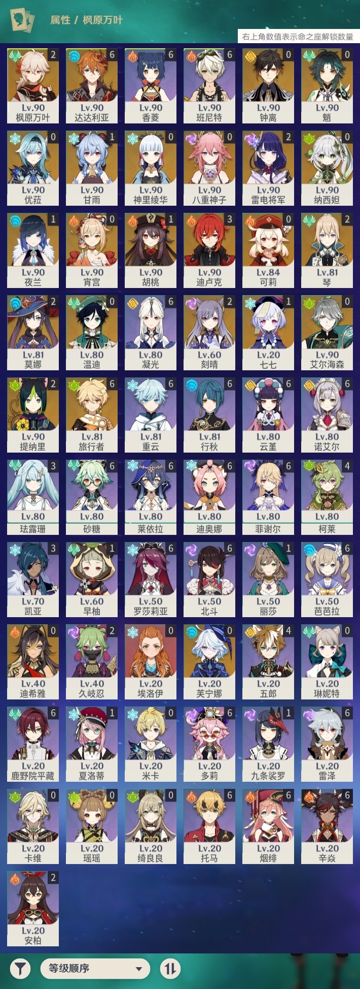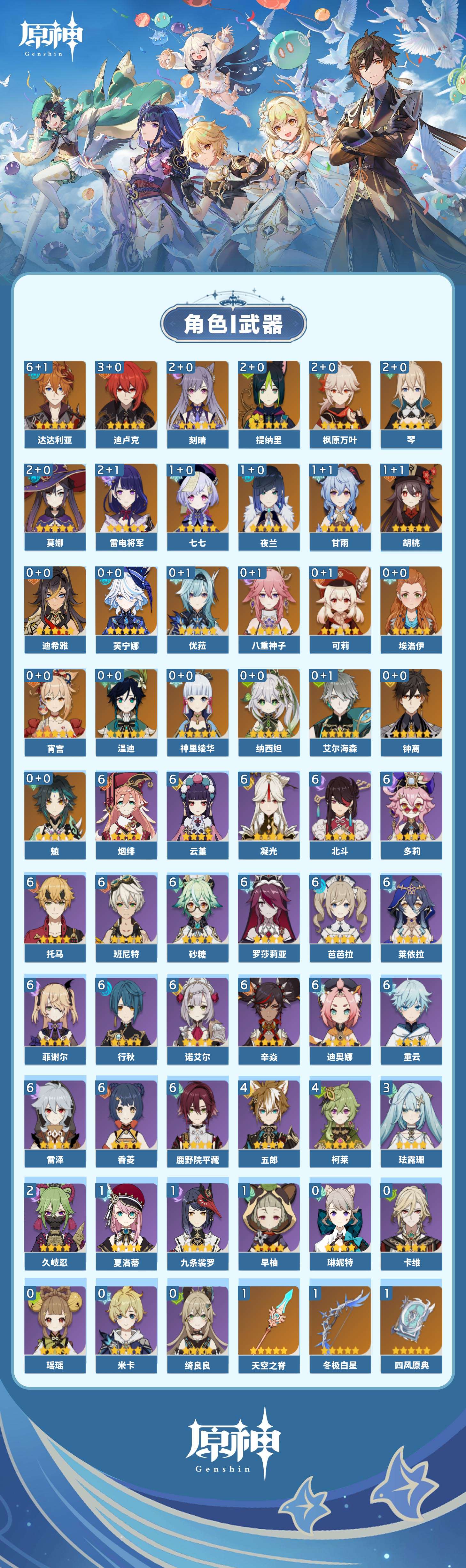 【原神】【lyys7550】冒险等级:60,五星数量:43,五星角色:达达利亚 6命迪卢克 3命枫原万叶 2命刻晴 2命雷电将军 2命莫娜 2命琴 2命提纳里 2命甘雨 1命胡桃 1命七七 1命夜兰 1命神里绫华温迪宵宫优菈迪希雅钟离八重神子芙宁娜纳西妲艾尔海森魈可莉__五星武器:裁叶萃光阿莫斯之弓尘世之锁风鹰剑护摩之杖四风原典松籁响起之时天空之傲天空之脊天空之卷天空之刃天空之翼无工之剑薙草之稻光斫峰之刃冬极白星神乐之真意赤沙之杖__四星角色:班尼特 6命行秋 6命香菱 6命鹿野院平藏 6命凝光 6命迪奥娜 6命砂糖 6命莱依拉 6命多莉 6命芭芭拉 6命云堇 6命托马 6命烟绯 6命重云 6命辛焱 6命诺艾尔 6命罗莎莉亚 6命雷泽 6命菲谢尔 6命北斗 6命柯莱 4命五郎 4命珐露珊 3命久岐忍 2命九条裟罗 1命早柚 1命夏洛蒂 1命埃洛伊绮良良瑶瑶米卡卡维琳妮特