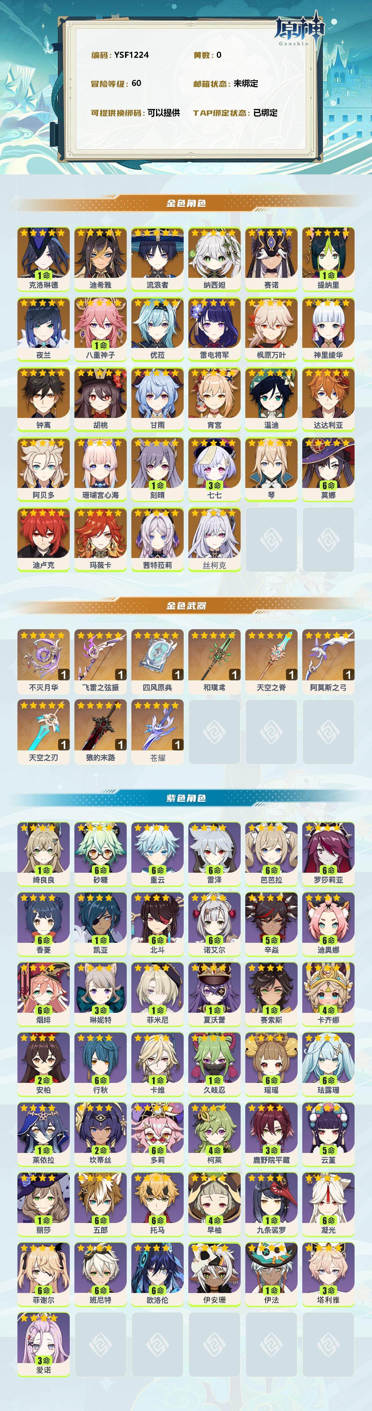 【ysf1224】60级/男主/30个五星角色/0命丝柯克/0命玛薇卡/0命茜特菈莉/1命克洛琳德/0命迪希雅/0命流浪者/0命纳西妲/0命赛诺/1命提纳里/0命夜兰/1命八重神子/0命珊瑚宫心海/0命雷电将军/0命宵宫/0命神里绫华/0命枫原万叶/0命优菈/0命胡桃/0命甘雨/0命阿贝多/0命钟离/0命达达利亚/0命温迪/0命琴/1命刻晴/0命迪卢克/满命莫娜/3命七七/精1苍耀/精1不灭月华/精1飞雷之弦振/精1和璞鸢/精1四风原典/精1狼的末路/精1阿莫斯之弓/精1天空之脊/精1天空之刃/3命爱诺/3命塔利雅/1命伊法/0命伊安珊/满命欧洛伦/4命卡齐娜/0命赛索斯/0命夏沃蕾/0命菲米尼/3命琳妮特/1命绮良良/0命卡维/满命瑶瑶/满命珐露珊/0命莱依拉/2命坎蒂丝/满命多莉/4命柯莱/3命鹿野院平藏/1命久岐忍/5命云堇/满命五郎/满命托马/1命九条裟罗/4命早柚/满命烟绯/满命罗莎莉亚/5命辛焱/满命迪奥娜/满命砂糖/满命雷泽/满命菲谢尔/1命丽莎/满命北斗/满命香菱/2命安柏/满命班尼特/满命行秋/满命芭芭拉/满命凝光/满命诺艾尔/1命凯亚/满命重云
