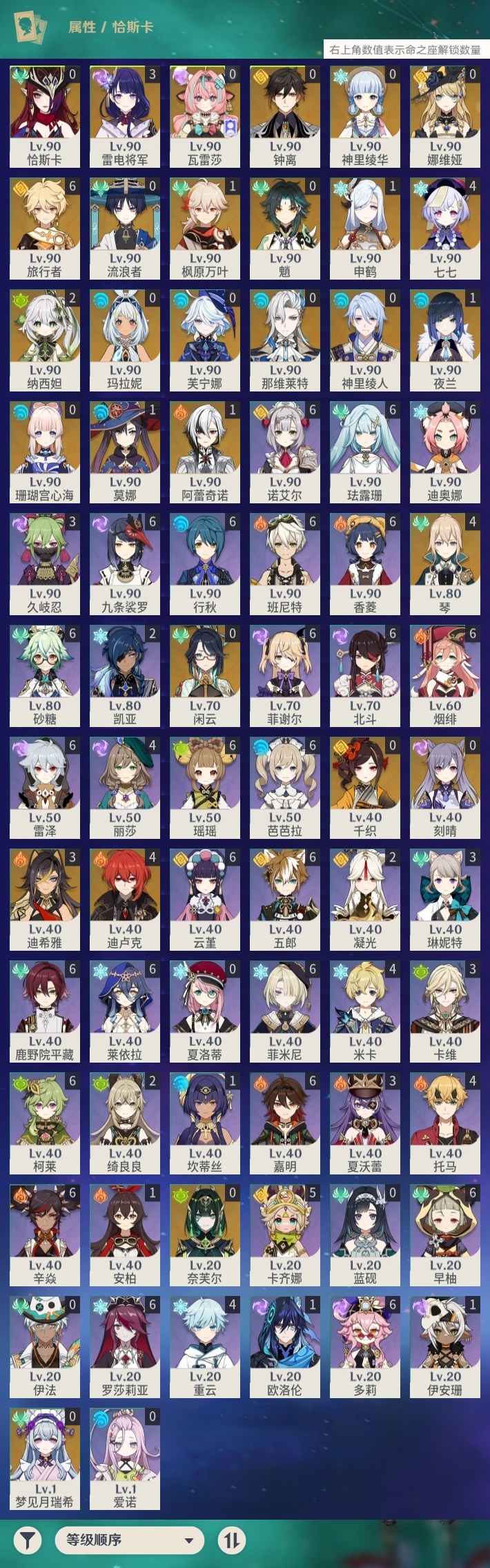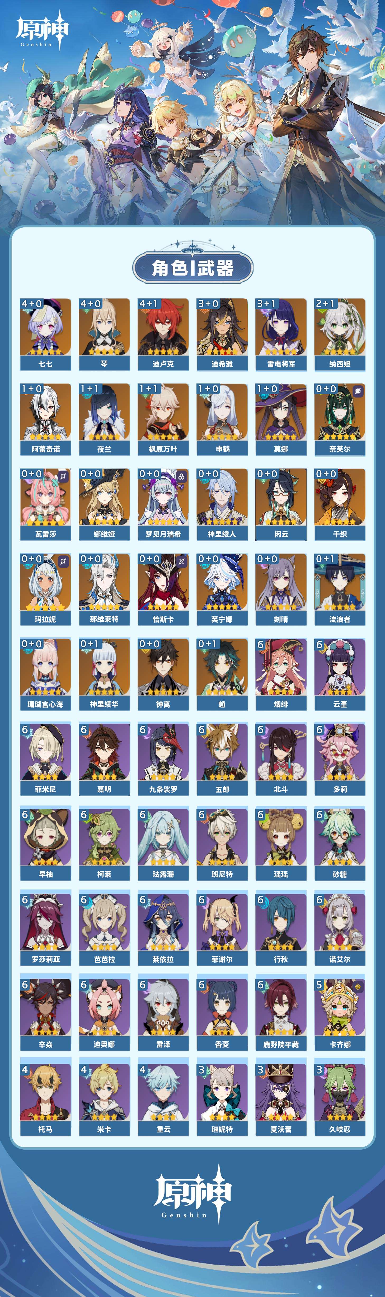 【原神】【lyys7643】冒险等级:60,五星数量:43,五星角色:迪卢克 4命七七 4命琴 4命迪希雅 3命雷电将军 3命纳西妲 2命阿蕾奇诺 1命枫原万叶 1命莫娜 1命申鹤 1命夜兰 1命玛拉妮珊瑚宫心海神里绫华恰斯卡钟离梦见月瑞希瓦雷莎神里绫人那维莱特芙宁娜娜维娅闲云千织奈芙尔流浪者魈刻晴__五星武器:最初的大魔术裁叶萃光图莱杜拉的回忆阿莫斯之弓苍古自由之誓风鹰剑和璞鸢狼的末路四风原典天空之刃天空之翼雾切之回光薙草之稻光若水千夜浮梦__四星角色:班尼特 6命行秋 6命九条裟罗 6命香菱 6命鹿野院平藏 6命珐露珊 6命迪奥娜 6命砂糖 6命瑶瑶 6命莱依拉 6命多莉 6命柯莱 6命芭芭拉 6命云堇 6命早柚 6命五郎 6命烟绯 6命辛焱 6命诺艾尔 6命罗莎莉亚 6命雷泽 6命菲谢尔 6命北斗 6命菲米尼 6命嘉明 6命卡齐娜 5命米卡 4命托马 4命重云 4命久岐忍 3命卡维 3命琳妮特 3命夏沃蕾 3命凝光 2命绮良良 2命坎蒂丝 1命欧洛伦 1命伊安珊 1命蓝砚夏洛蒂伊法爱诺