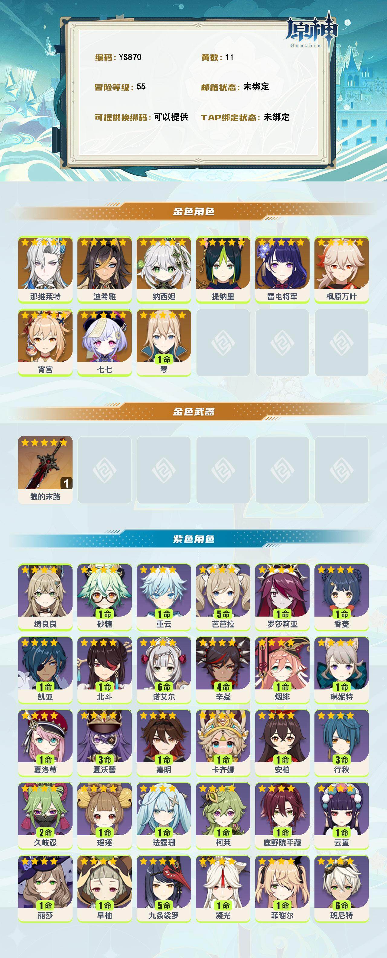 【ys870】55级/11黄/女主/10个五星角色/1个五星武器/0命那维莱特/0命迪希雅/0命纳西妲/0命提纳里/0命雷电将军/0命宵宫/0命枫原万叶/1命琴/0命七七/精1狼的末路/0命卡齐娜/1命嘉明/3命夏沃蕾/0命夏洛蒂/0命琳妮特/0命绮良良/1命瑶瑶/0命珐露珊/0命柯莱/0命鹿野院平藏/2命久岐忍/0命云堇/5命九条裟罗/1命早柚/1命烟绯/1命罗莎莉亚/4命辛焱/1命砂糖/0命菲谢尔/0命丽莎/0命北斗/0命香菱/0命安柏/满命班尼特/3命行秋/5命芭芭拉/0命凝光/满命诺艾尔/0命凯亚/0命重云