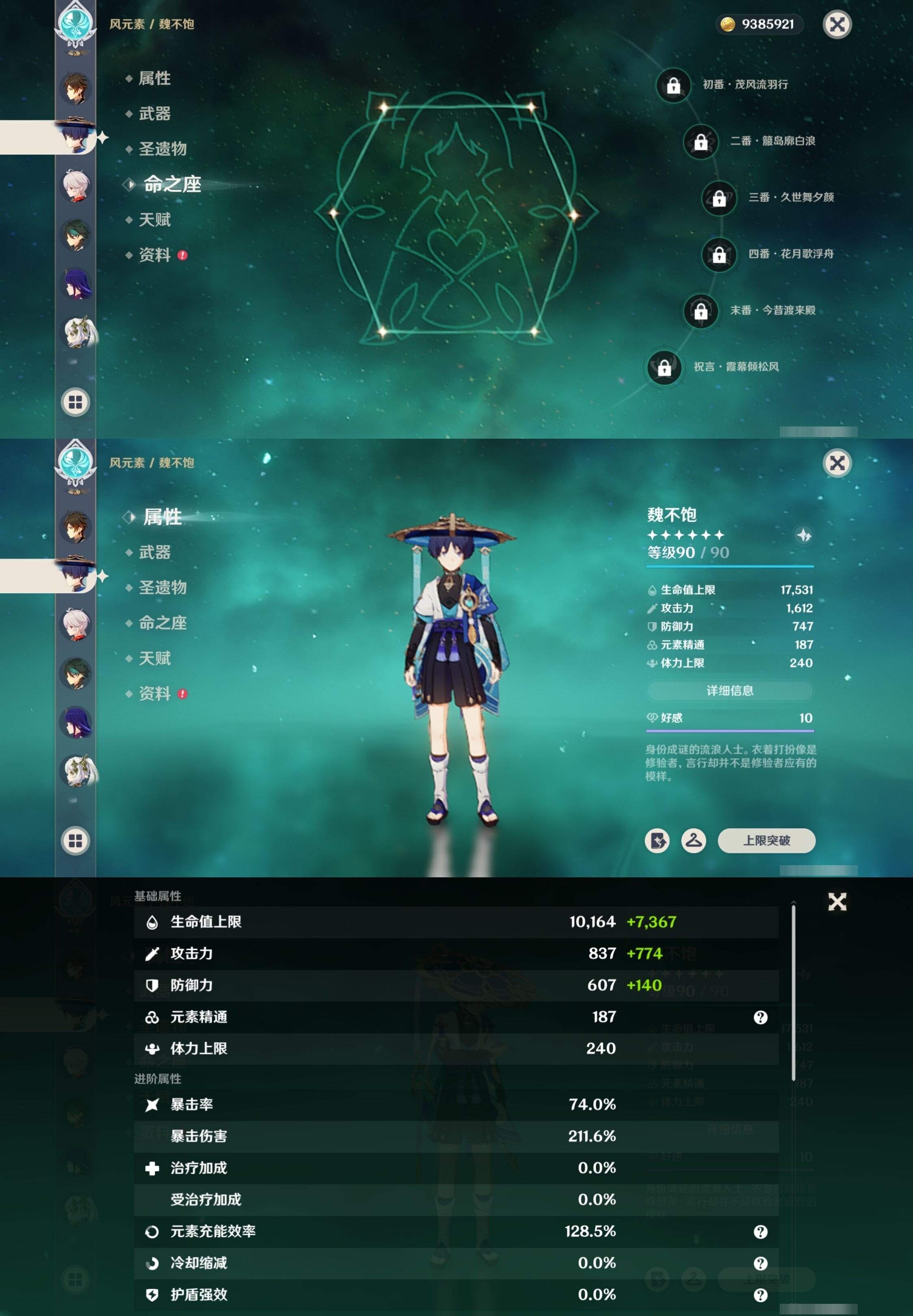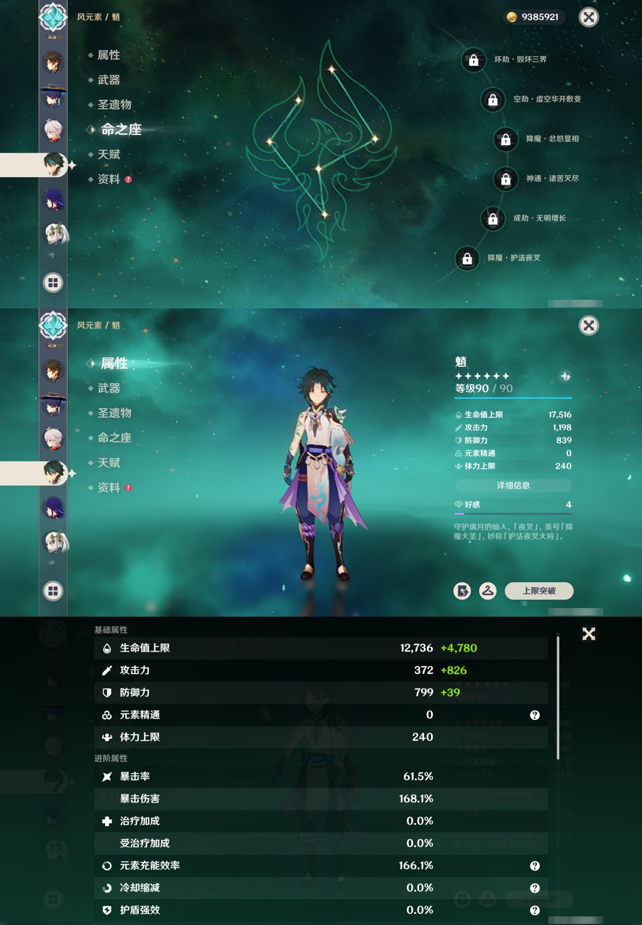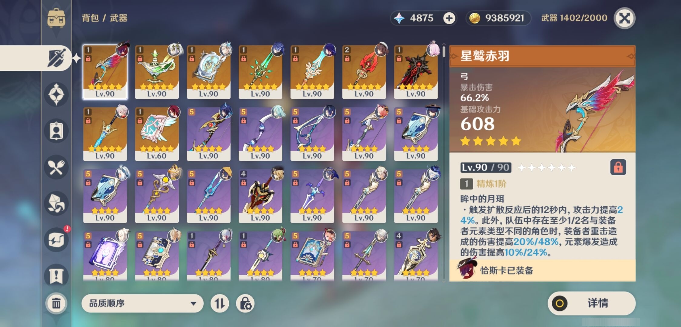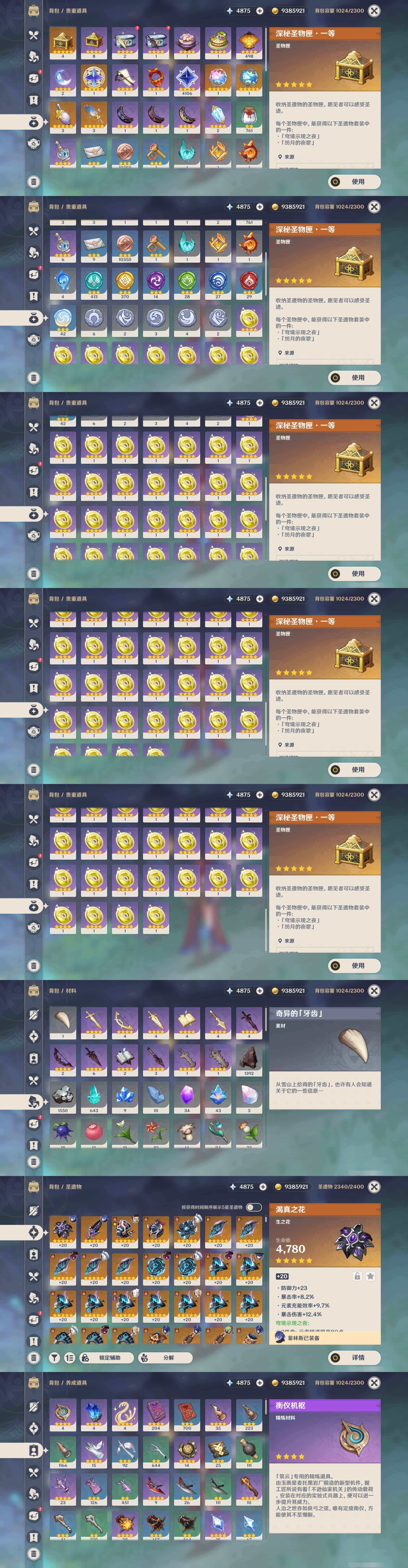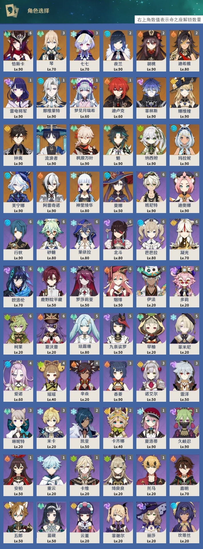 [13548489]54黄 风:6命恰斯卡,0命流浪者,0命枫原万叶,0命魈,3命琴,1命梦见月瑞希 火:2命胡桃,0命阿蕾奇诺,2命迪希雅,1命迪卢克 水:2命夜兰,0命玛拉妮,0命芙宁娜,1命那维莱特,0命莫娜 冰:0命神里绫华,3命七七 岩:0命娜维娅,0命钟离 雷:0命菲林斯,1命雷电将军 草:0命纳西妲 弓:精1星鹫赤羽 法器:精1千夜浮梦,精1四风原典,精1天空之卷 单手剑:精1苍古自由之誓 双手剑:精1狼的末路 长柄武器:精1和璞鸢,精1天空之脊,精2护摩之杖 【角色皮肤】 五星角色:夜兰-静暇雅宴,胡桃-宿雪桃红 四星角色:班尼特-炽绘奇旅,香菱-岁夜欢哗,行秋-雨化竹身,凯亚-帆影游风