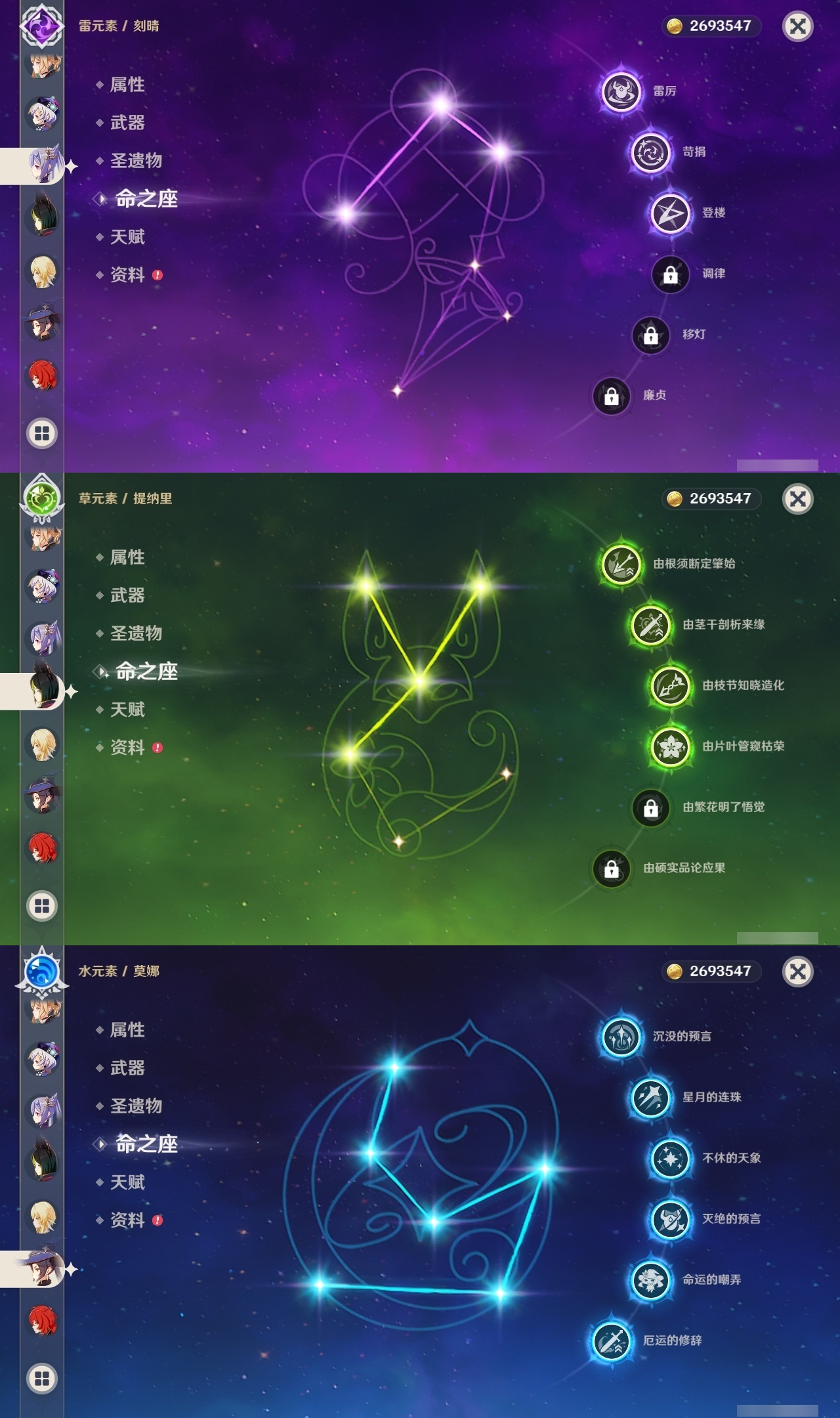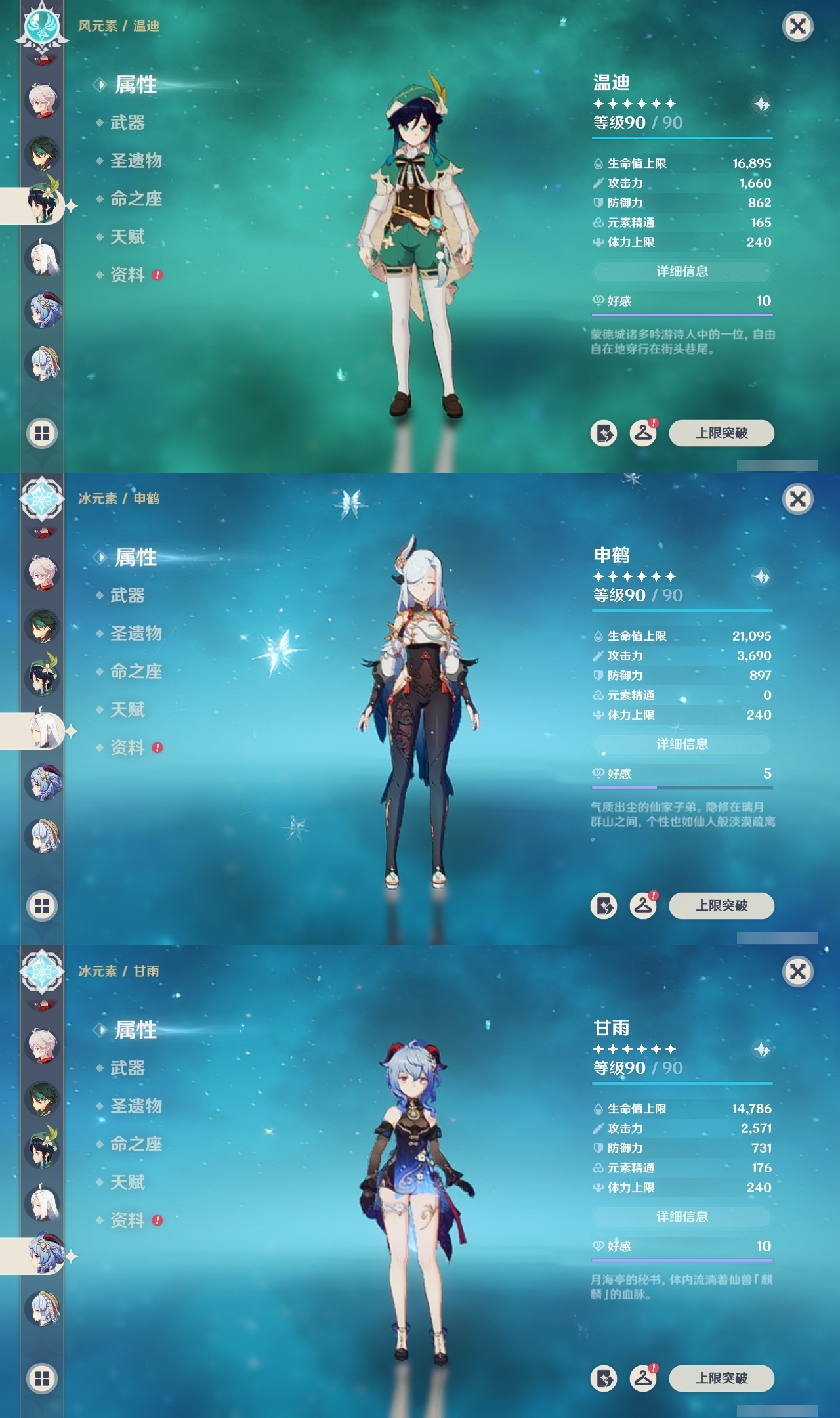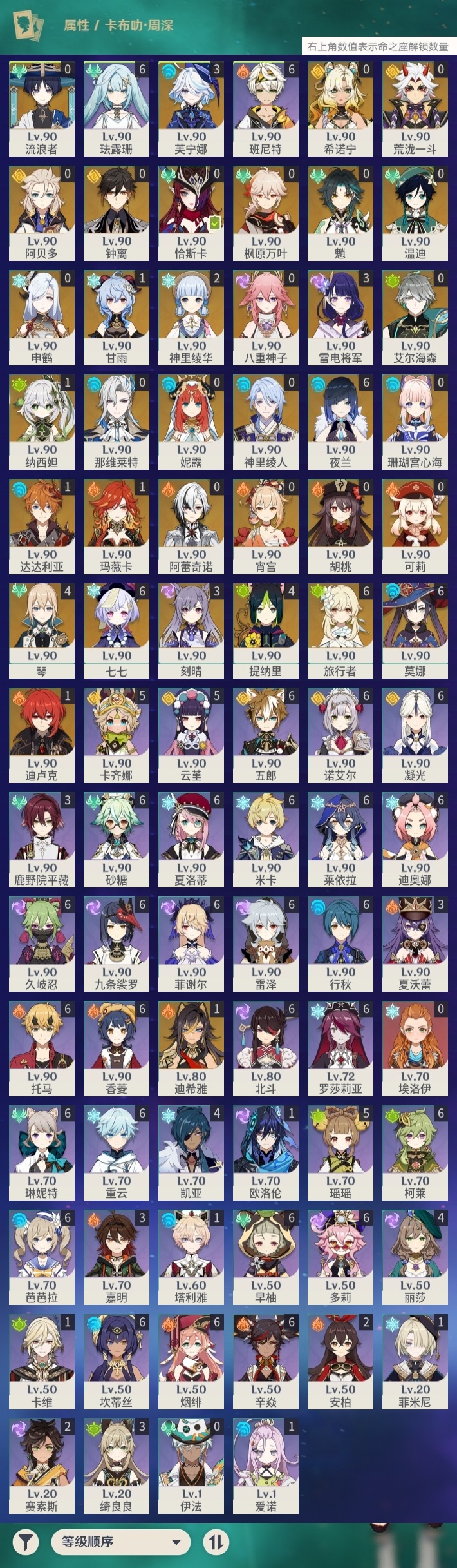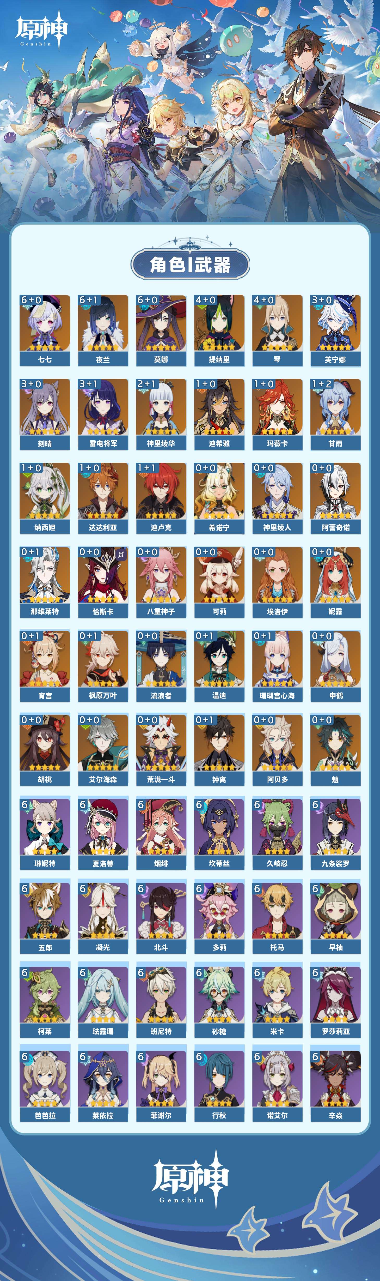 【原神】满命,冒险等级:60,五星数量:53,五星角色:莫娜 6命七七 6命夜兰 6命琴 4命提纳里 4命芙宁娜 3命刻晴 3命雷电将军 3命神里绫华 2命玛薇卡 1命迪希雅 1命达达利亚 1命迪卢克 1命甘雨 1命纳西妲 1命珊瑚宫心海希诺宁温迪恰斯卡宵宫钟离荒泷一斗申鹤八重神子神里绫人阿贝多那维莱特阿蕾奇诺妮露艾尔海森流浪者枫原万叶魈胡桃可莉__五星武器:阿莫斯之弓 2精万世流涌大典不灭月华苍古自由之誓飞雷之弦振风鹰剑狼的末路磐岩结绿天空之傲天空之脊天空之卷天空之翼雾切之回光薙草之稻光终末嗟叹之诗贯虹之槊若水__四星角色:班尼特 6命行秋 6命九条裟罗 6命香菱 6命久岐忍 6命珐露珊 6命凝光 6命迪奥娜 6命砂糖 6命莱依拉 6命米卡 6命坎蒂丝 6命多莉 6命柯莱 6命芭芭拉 6命早柚 6命托马 6命五郎 6命烟绯 6命重云 6命辛焱 6命诺艾尔 6命罗莎莉亚 6命雷泽 6命菲谢尔 6命北斗 6命琳妮特 6命夏洛蒂 6命卡齐娜 5命瑶瑶 5命云堇 5命鹿野院平藏 3命绮良良 3命夏沃蕾 3命嘉明 3命赛索斯 2命卡维 1命欧洛伦 1命菲米尼 1命塔利雅 1命爱诺 1命埃洛伊伊法