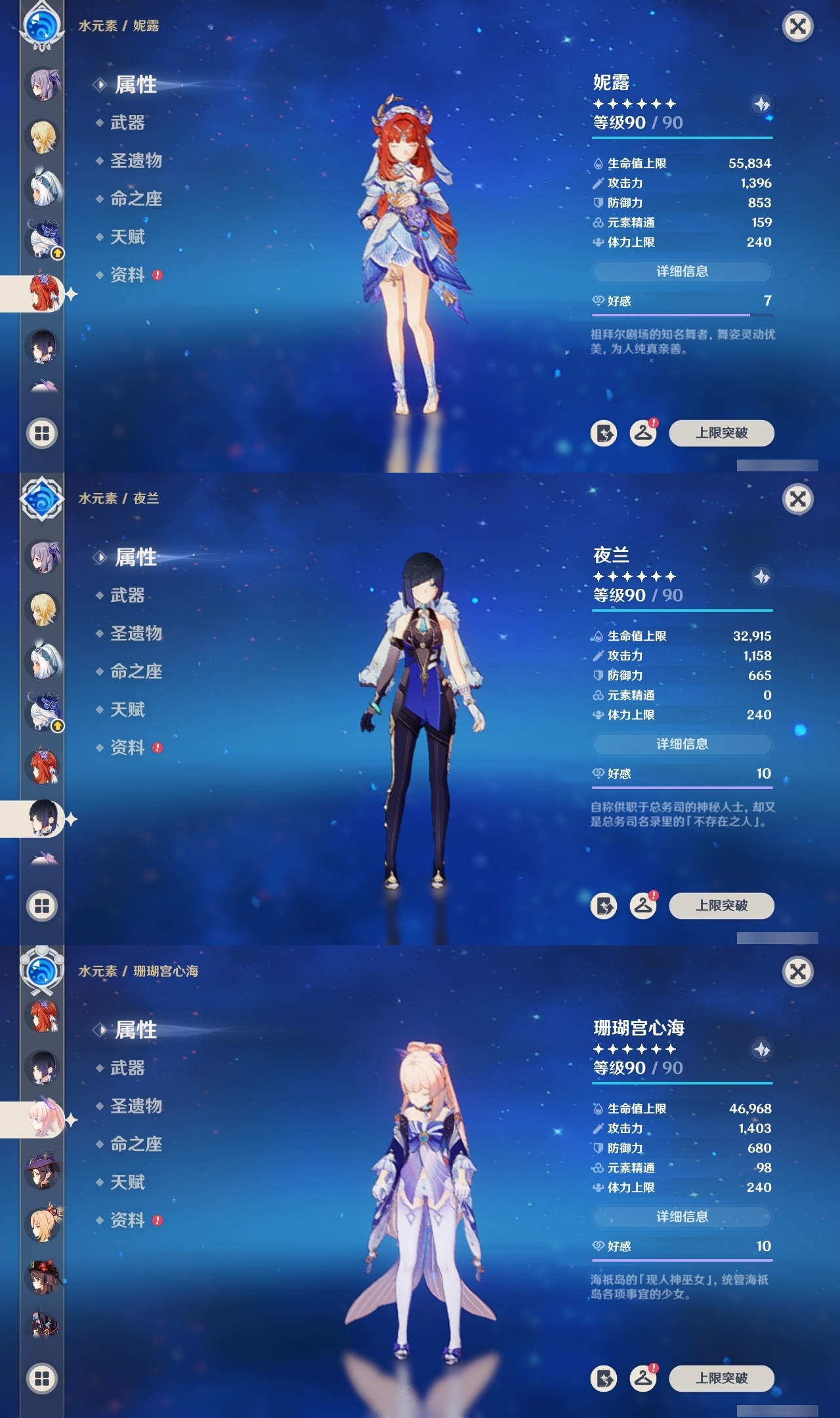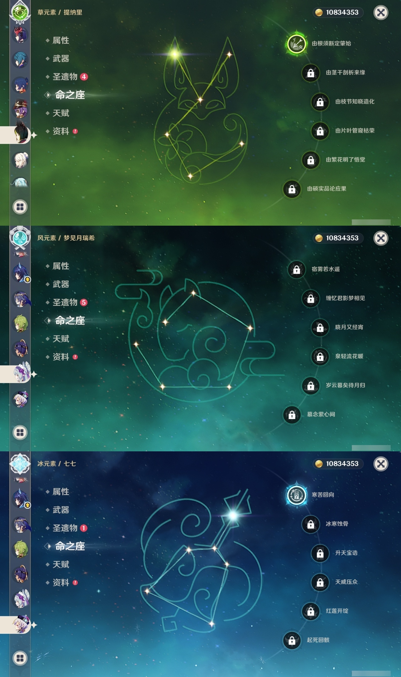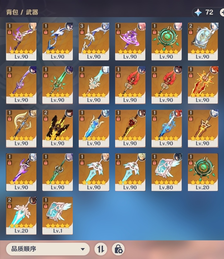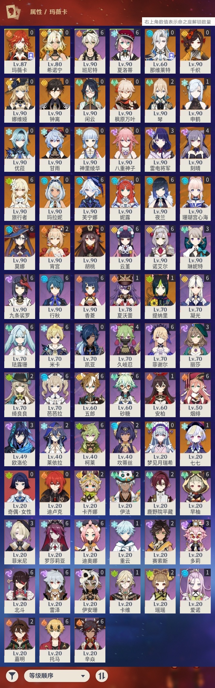 【原神】满命,冒险等级:60,五星数量:51,五星角色:芙宁娜 6命莫娜 6命夜兰 6命刻晴 4命雷电将军 3命琴 2命宵宫 2命七七 1命申鹤 1命提纳里 1命玛拉妮珊瑚宫心海希诺宁神里绫华玛薇卡优菈钟离梦见月瑞希八重神子那维莱特娜维娅闲云千织妮露迪卢克枫原万叶甘雨胡桃__五星武器:阿莫斯之弓 3精四风原典 2精天空之傲 2精无工之剑 2精碧落之珑焚曜千阳静水流涌之辉裁断有乐御簾切飞雷之弦振和璞鸢护摩之杖磐岩结绿松籁响起之时天空之脊天空之卷天空之刃雾切之回光薙草之稻光神乐之真意若水圣显之钥__四星角色:班尼特 6命行秋 6命九条裟罗 6命香菱 6命珐露珊 6命凝光 6命迪奥娜 6命砂糖 6命米卡 6命柯莱 6命芭芭拉 6命云堇 6命早柚 6命托马 6命五郎 6命烟绯 6命辛焱 6命诺艾尔 6命罗莎莉亚 6命雷泽 6命菲谢尔 6命北斗 6命夏洛蒂 6命久岐忍 4命多莉 3命欧洛伦 3命菲米尼 3命琳妮特 3命卡齐娜 2命鹿野院平藏 2命绮良良 2命瑶瑶 2命莱依拉 2命坎蒂丝 2命嘉明 2命伊法 2命赛索斯 2命卡维 1命重云 1命夏沃蕾 1命爱诺 1命奇偶·女性伊安珊