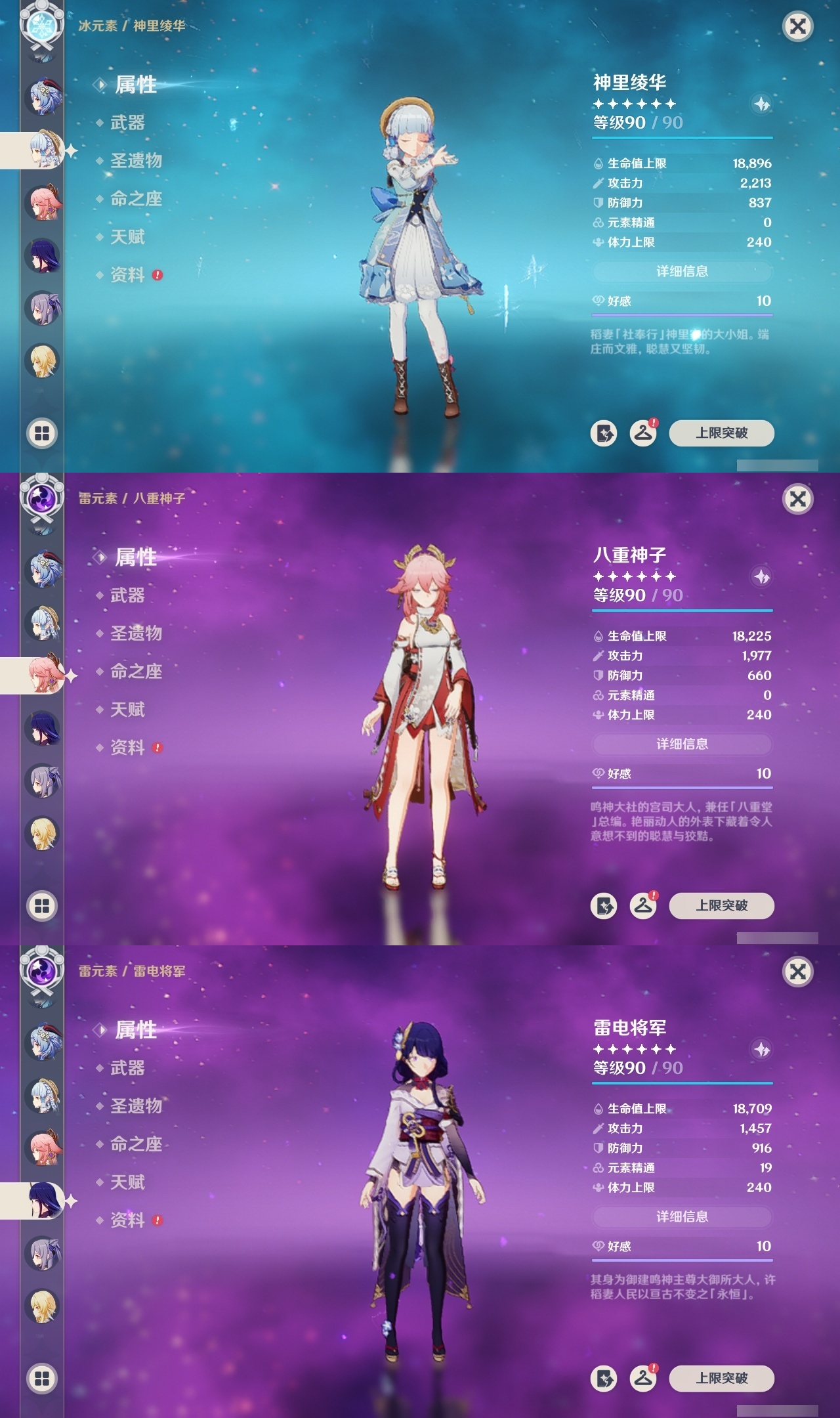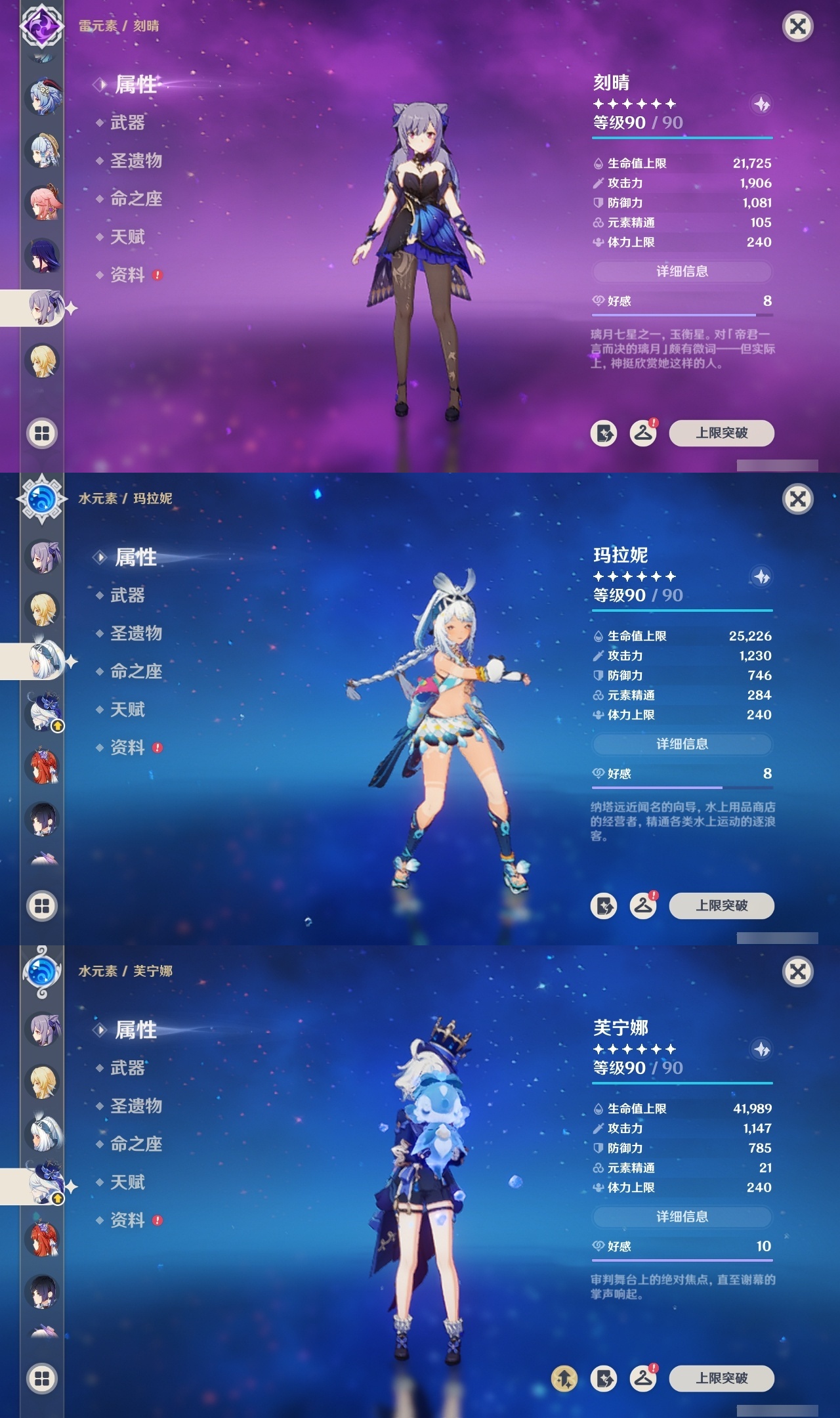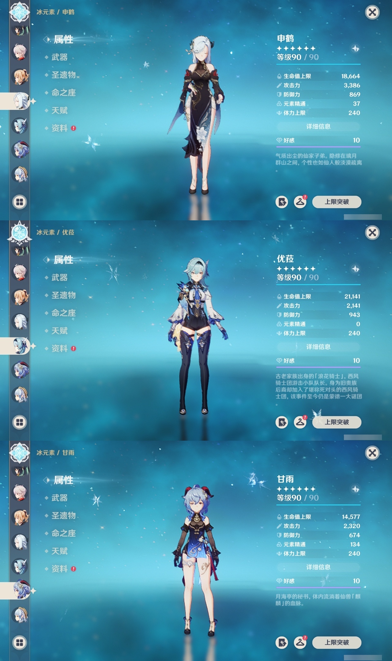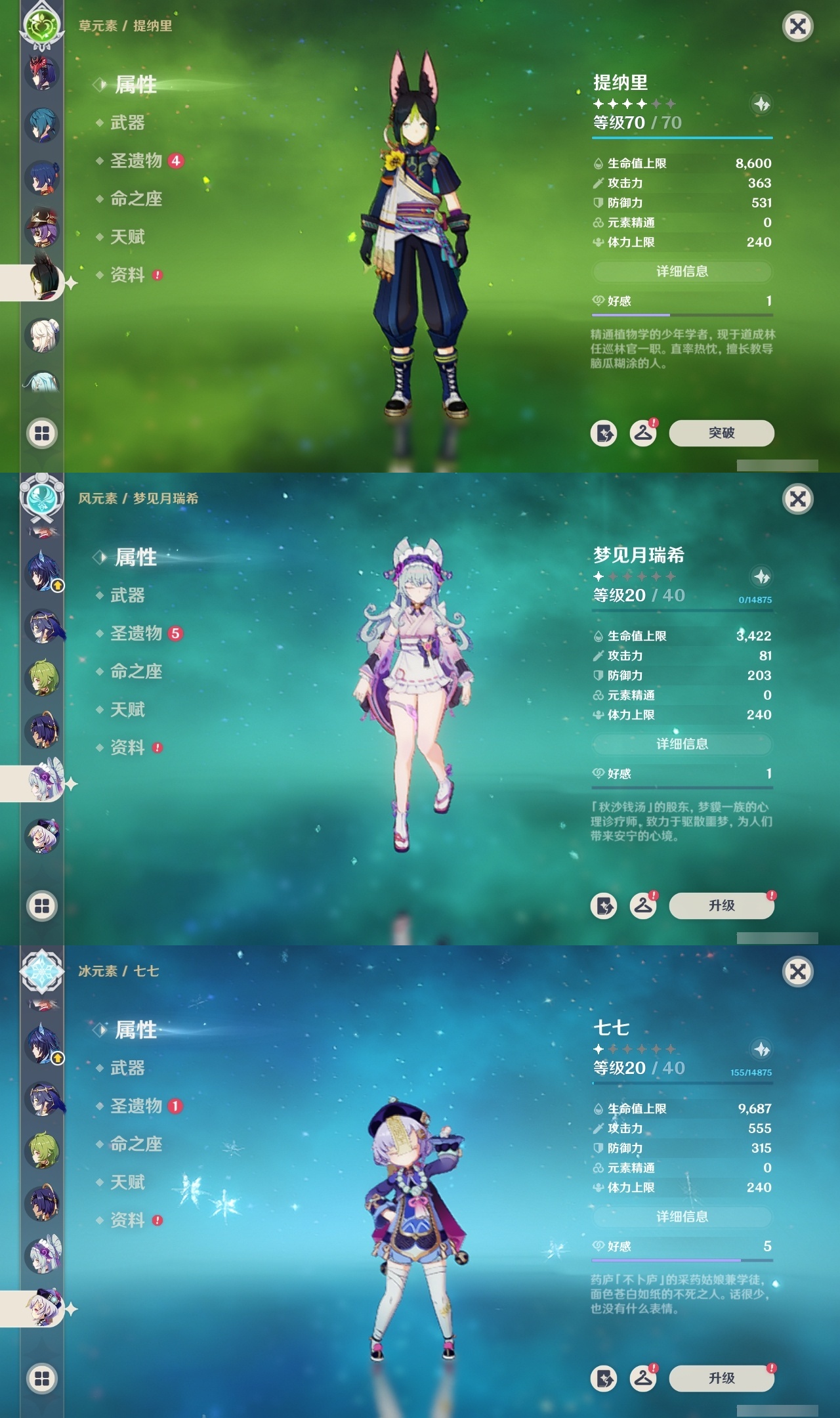 【原神】满命,冒险等级:60,五星数量:51,五星角色:芙宁娜 6命莫娜 6命夜兰 6命刻晴 4命雷电将军 3命琴 2命宵宫 2命七七 1命申鹤 1命提纳里 1命玛拉妮珊瑚宫心海希诺宁神里绫华玛薇卡优菈钟离梦见月瑞希八重神子那维莱特娜维娅闲云千织妮露迪卢克枫原万叶甘雨胡桃__五星武器:阿莫斯之弓 3精四风原典 2精天空之傲 2精无工之剑 2精碧落之珑焚曜千阳静水流涌之辉裁断有乐御簾切飞雷之弦振和璞鸢护摩之杖磐岩结绿松籁响起之时天空之脊天空之卷天空之刃雾切之回光薙草之稻光神乐之真意若水圣显之钥__四星角色:班尼特 6命行秋 6命九条裟罗 6命香菱 6命珐露珊 6命凝光 6命迪奥娜 6命砂糖 6命米卡 6命柯莱 6命芭芭拉 6命云堇 6命早柚 6命托马 6命五郎 6命烟绯 6命辛焱 6命诺艾尔 6命罗莎莉亚 6命雷泽 6命菲谢尔 6命北斗 6命夏洛蒂 6命久岐忍 4命多莉 3命欧洛伦 3命菲米尼 3命琳妮特 3命卡齐娜 2命鹿野院平藏 2命绮良良 2命瑶瑶 2命莱依拉 2命坎蒂丝 2命嘉明 2命伊法 2命赛索斯 2命卡维 1命重云 1命夏沃蕾 1命爱诺 1命奇偶·女性伊安珊