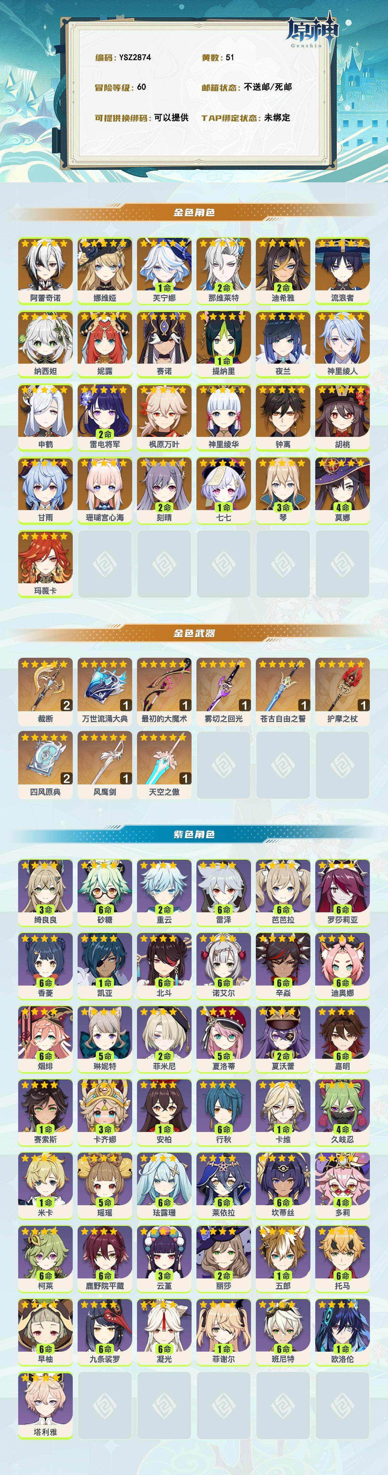 【ysz2874】60级/51黄/男主/26个五星角色/9个五星武器/0命玛薇卡/0命阿蕾奇诺/0命娜维娅/1命芙宁娜/2命那维莱特/2命迪希雅/0命流浪者/0命纳西妲/0命妮露/0命赛诺/1命提纳里/0命夜兰/0命神里绫人/0命申鹤/0命珊瑚宫心海/2命雷电将军/0命神里绫华/0命枫原万叶/0命胡桃/0命甘雨/0命钟离/3命琴/2命刻晴/4命莫娜/1命七七/精2裁断/精1万世流涌大典/精1最初的大魔术/精1雾切之回光/精1苍古自由之誓/精1护摩之杖/精1天空之傲/精2四风原典/精1风鹰剑/0命塔利雅/1命欧洛伦/3命卡齐娜/0命赛索斯/满命嘉明/2命夏沃蕾/5命夏洛蒂/2命菲米尼/5命琳妮特/3命绮良良/0命卡维/1命米卡/5命瑶瑶/满命珐露珊/满命莱依拉/满命坎蒂丝/4命多莉/满命柯莱/满命鹿野院平藏/4命久岐忍/3命云堇/1命五郎/满命托马/满命九条裟罗/满命早柚/满命烟绯/满命罗莎莉亚/满命辛焱/满命迪奥娜/满命砂糖/满命雷泽/0命菲谢尔/2命丽莎/满命北斗/满命香菱/0命安柏/满命班尼特/满命行秋/满命芭芭拉/满命凝光/满命诺艾尔/0命凯亚/2命重云