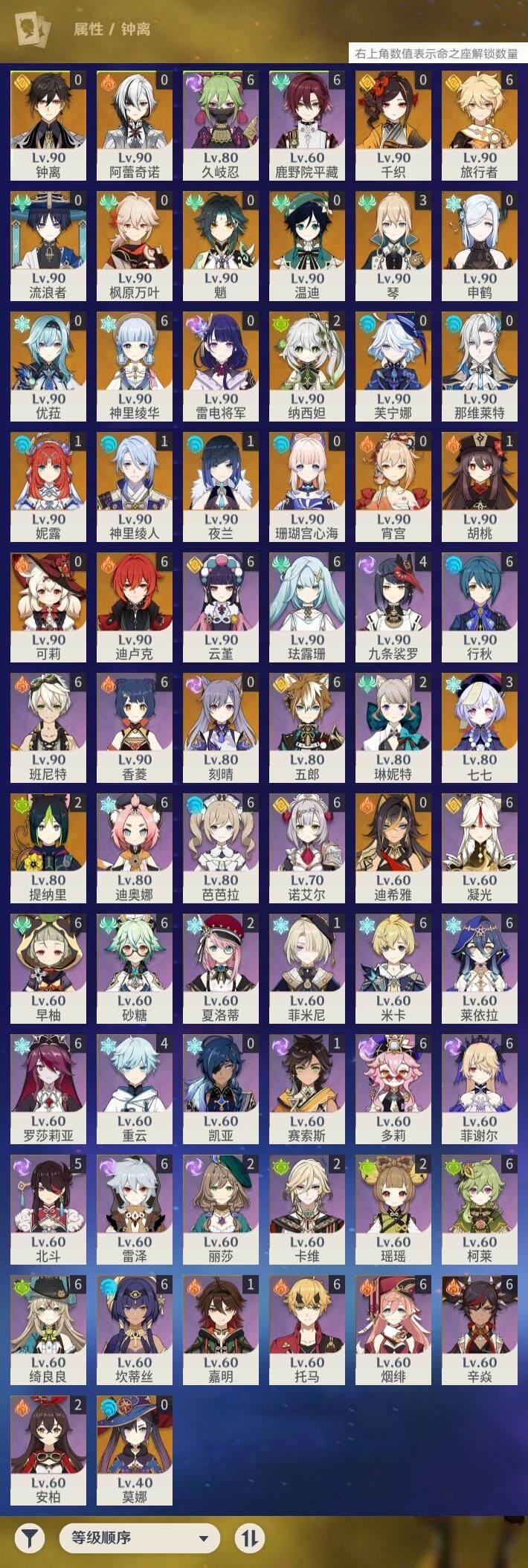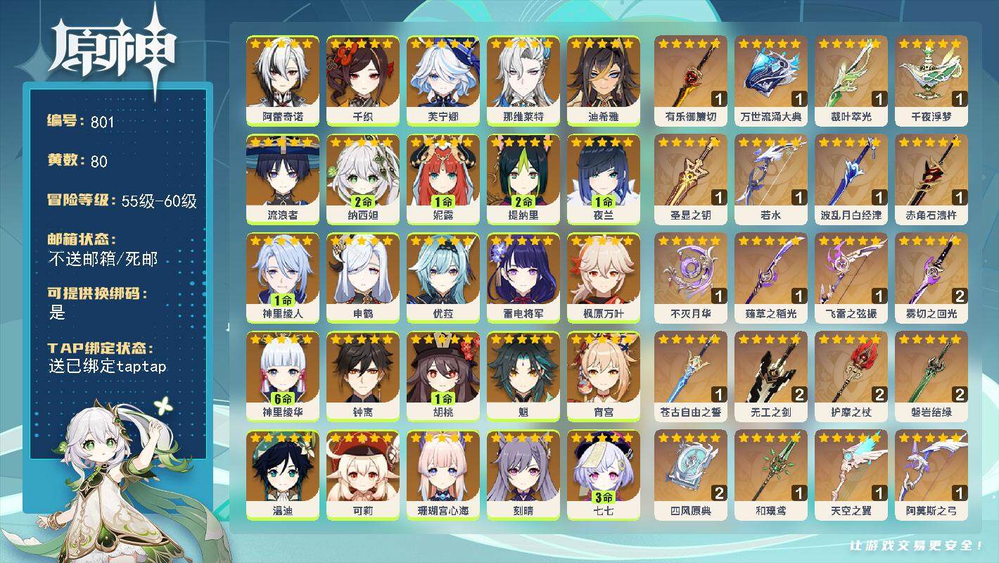 [13581402]60级/80黄/男主/28个五星角色/21个五星武器 0命阿蕾奇诺0命千织0命芙宁娜0命那维莱特0命迪希雅0命流浪者2命纳西妲1命妮露2命提纳里1命夜兰1命神里绫人0命申鹤0命优菈0命雷电将军0命枫原万叶满命神里绫华0命钟离1命胡桃0命魈0命宵宫0命温迪0命可莉0命珊瑚宫心海0命刻晴3命七七3命琴0命莫娜满命迪卢克精1有乐御簾切精1万世流涌大典精1裁叶萃光精1千夜浮梦精1圣显之钥精1若水精1波乱月白经津精1赤角石溃杵精1不灭月华精1薙草之稻光精1飞雷之弦振精2雾切之回光精1苍古自由之誓精2无工之剑精2护摩之杖精2磐岩结绿精2四风原典精1和璞鸢精1天空之翼精1阿莫斯之弓精1狼的末路