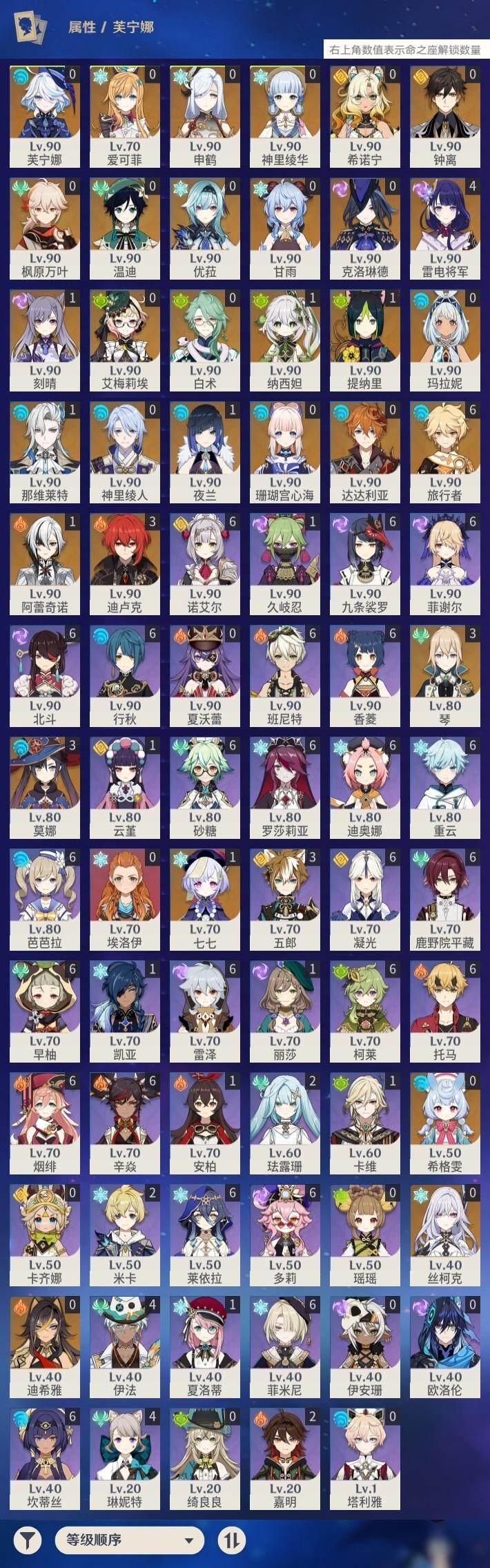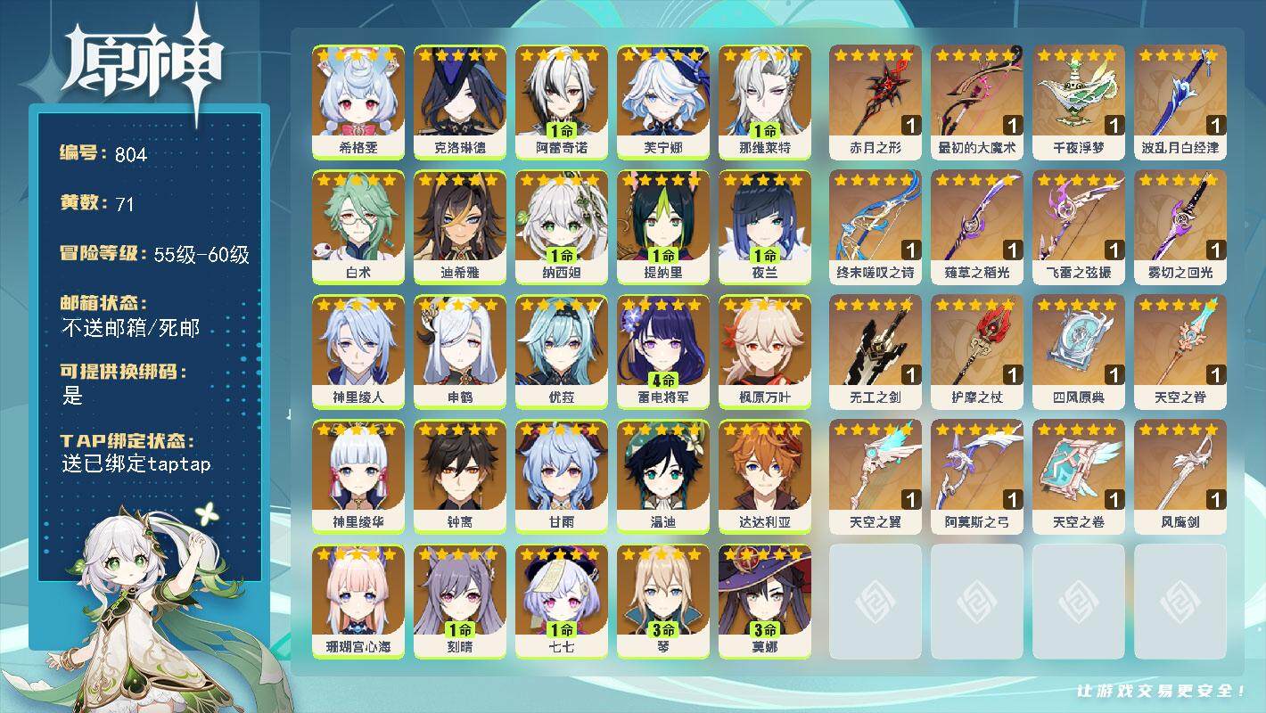 [13581644]60级/71黄/男主/31个五星角色/20个五星武器 0命希格雯0命克洛琳德1命阿蕾奇诺0命芙宁娜1命那维莱特0命白术0命迪希雅1命纳西妲1命提纳里1命夜兰0命神里绫人0命申鹤0命优菈4命雷电将军0命枫原万叶0命神里绫华0命钟离0命甘雨0命温迪0命达达利亚0命珊瑚宫心海1命刻晴1命七七3命琴3命莫娜3命迪卢克0命希诺宁0命玛拉妮0命艾梅莉埃0命爱可菲0命丝柯克精1赤月之形精1最初的大魔术精1千夜浮梦精1波乱月白经津精1终末嗟叹之诗精1薙草之稻光精1飞雷之弦振精1雾切之回光精1无工之剑精1护摩之杖精1四风原典精1天空之脊精1天空之翼精1阿莫斯之弓精1天空之卷精1风鹰剑