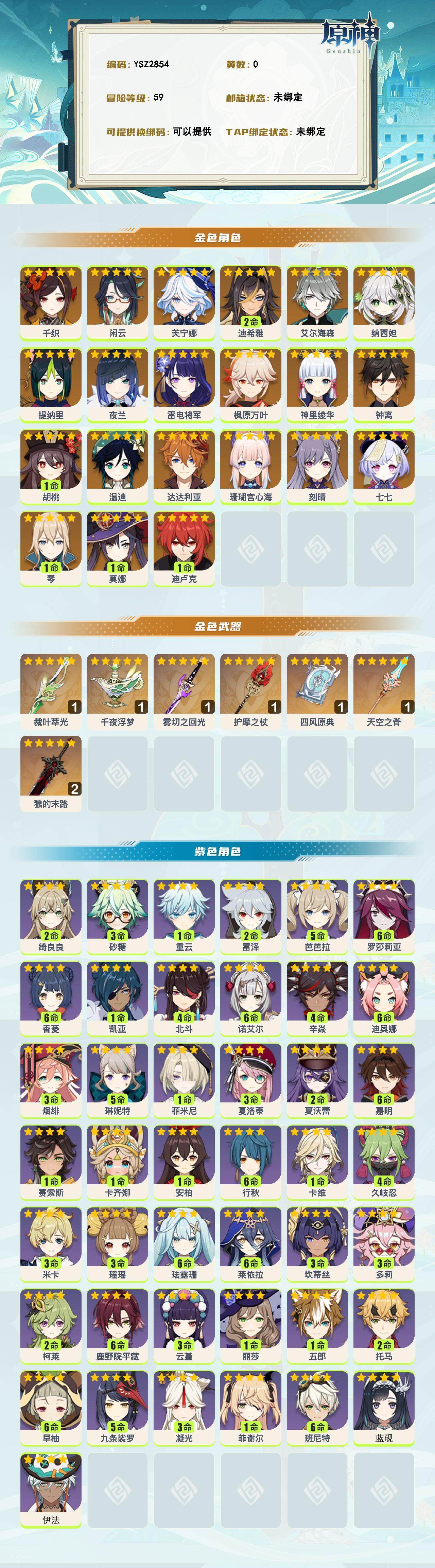 【ysz2854】59级/女主/23个五星角色/10个五星武器/0命千织/0命闲云/0命芙宁娜/2命迪希雅/0命艾尔海森/0命纳西妲/0命提纳里/0命夜兰/0命珊瑚宫心海/0命雷电将军/0命神里绫华/0命枫原万叶/1命胡桃/0命钟离/0命达达利亚/0命温迪/1命琴/0命刻晴/1命迪卢克/1命莫娜/0命七七/精1裁叶萃光/精1千夜浮梦/精1雾切之回光/精1护摩之杖/精1四风原典/精2狼的末路/精1天空之脊/0命伊法/0命蓝砚/0命卡齐娜/1命赛索斯/满命嘉明/2命夏沃蕾/3命夏洛蒂/1命菲米尼/5命琳妮特/2命绮良良/0命卡维/3命米卡/3命瑶瑶/满命珐露珊/满命莱依拉/3命坎蒂丝/3命多莉/2命柯莱/满命鹿野院平藏/4命久岐忍/3命云堇/0命五郎/2命托马/5命九条裟罗/满命早柚/3命烟绯/满命罗莎莉亚/4命辛焱/满命迪奥娜/3命砂糖/2命雷泽/1命菲谢尔/1命丽莎/4命北斗/满命香菱/1命安柏/满命班尼特/满命行秋/5命芭芭拉/3命凝光/满命诺艾尔/1命凯亚/1命重云