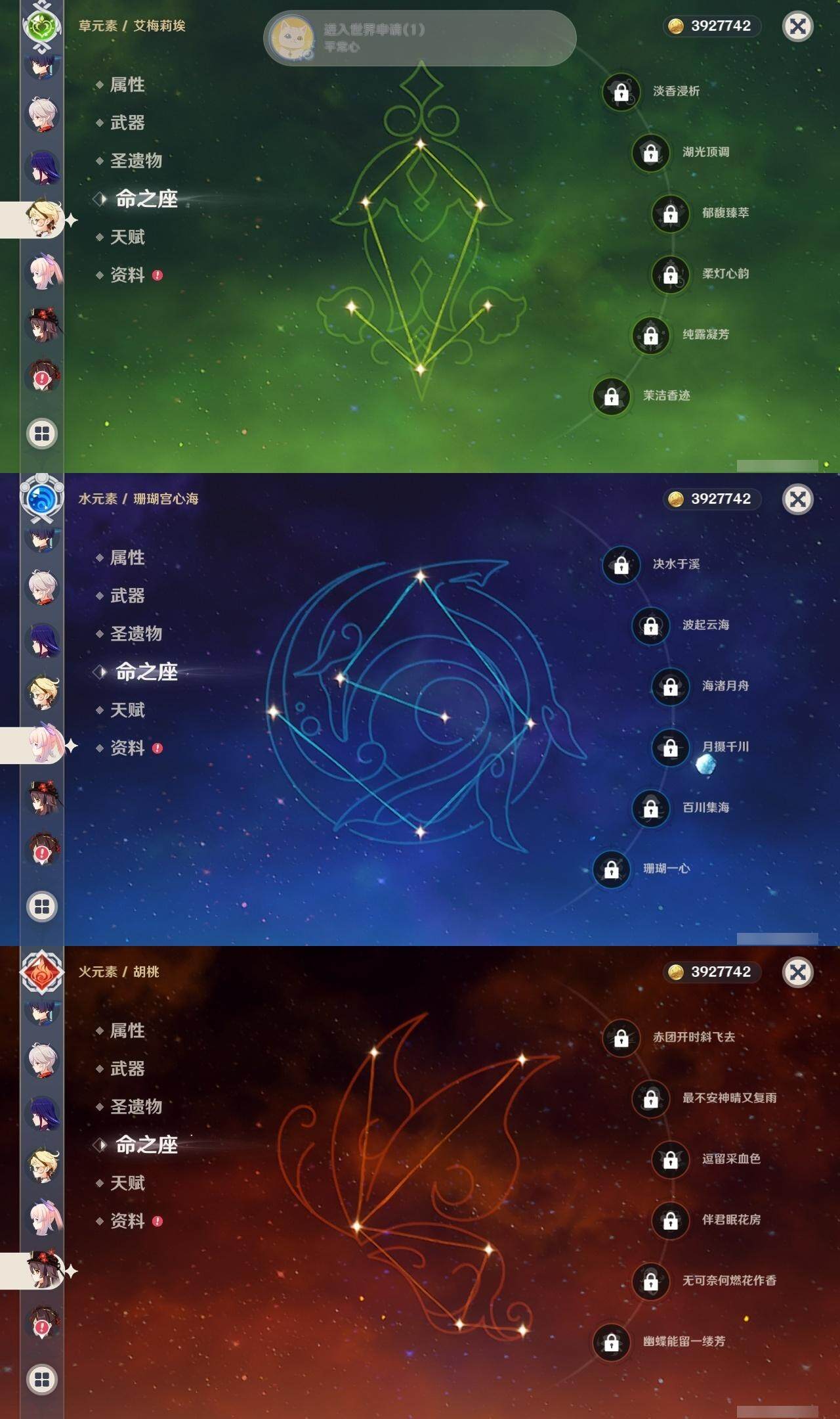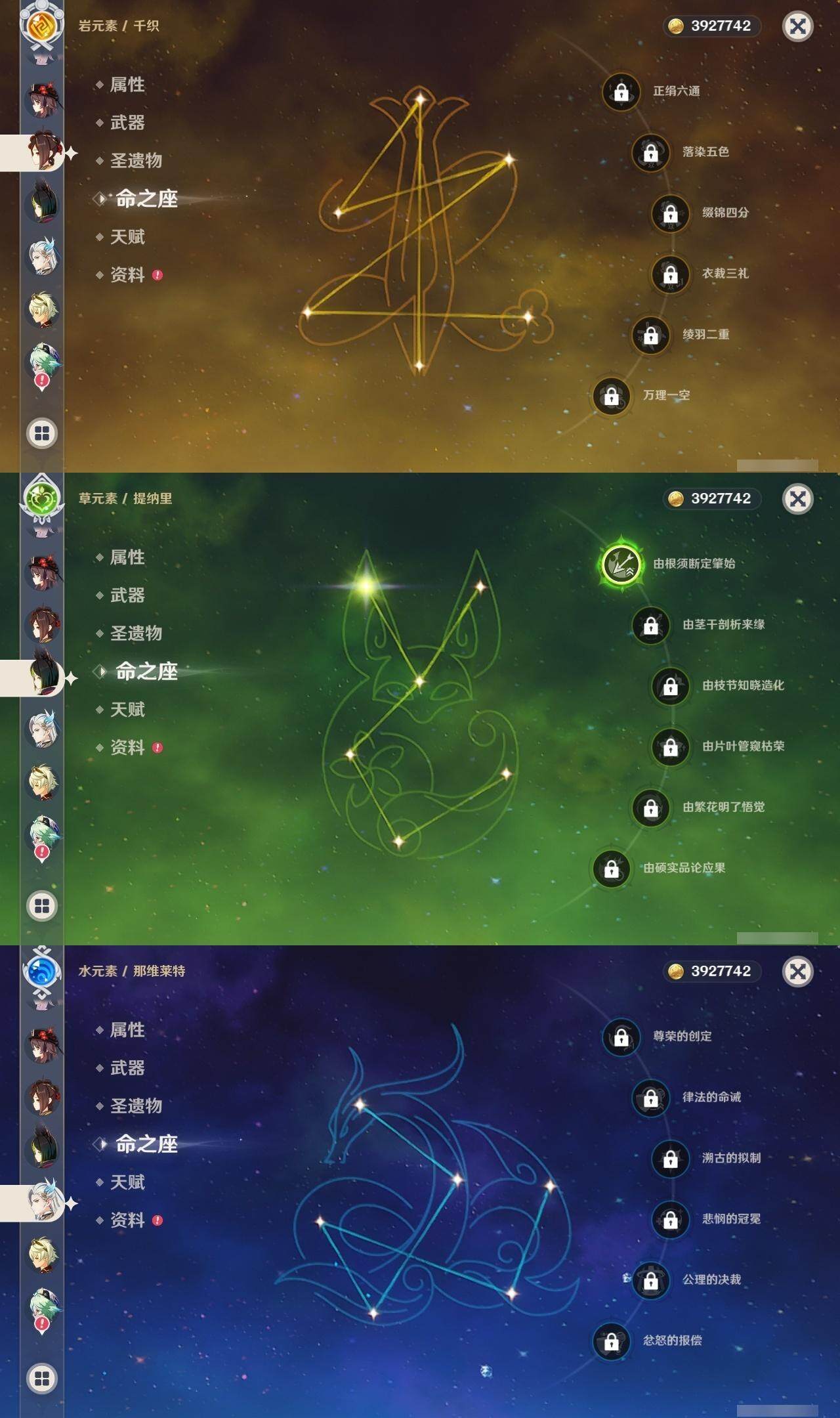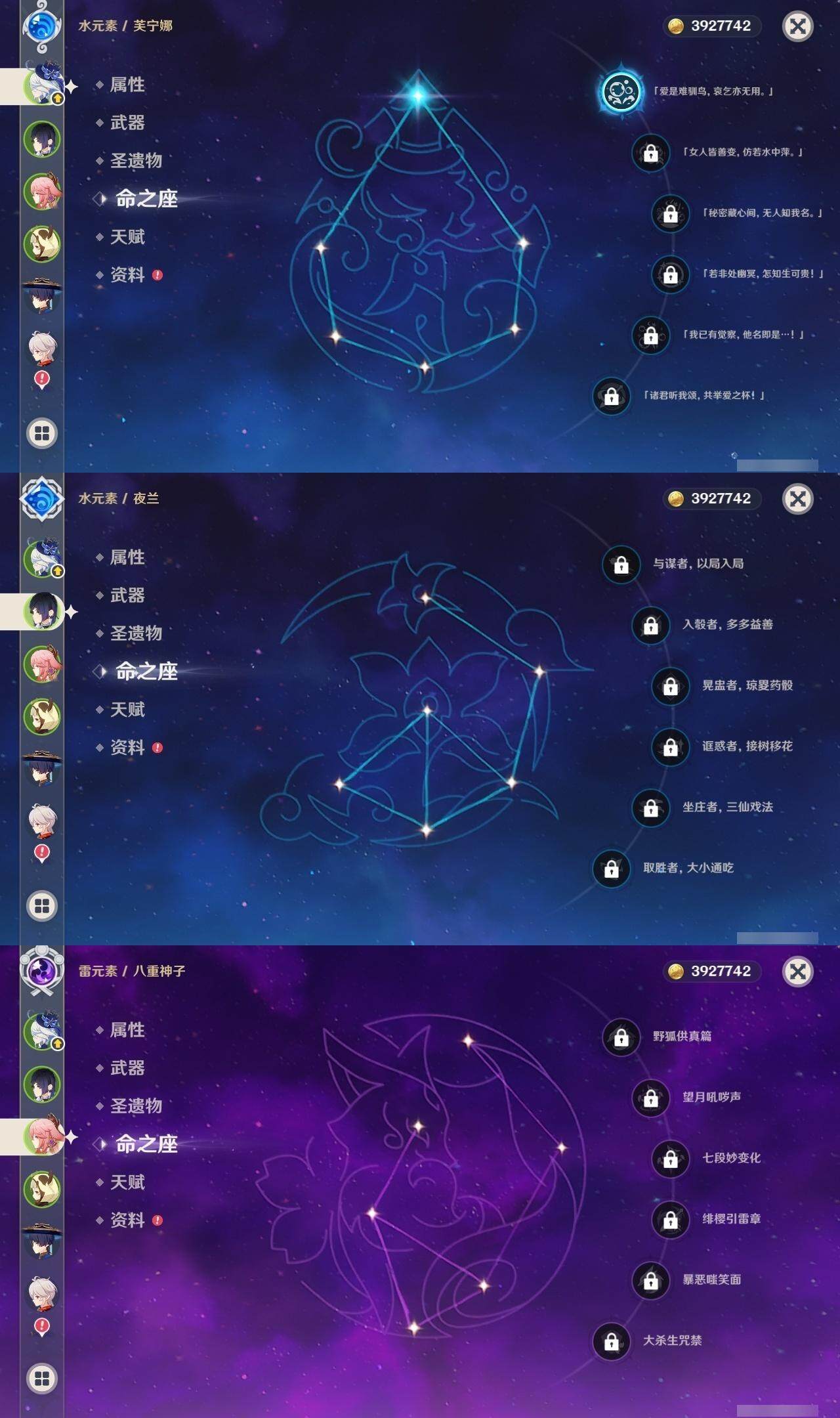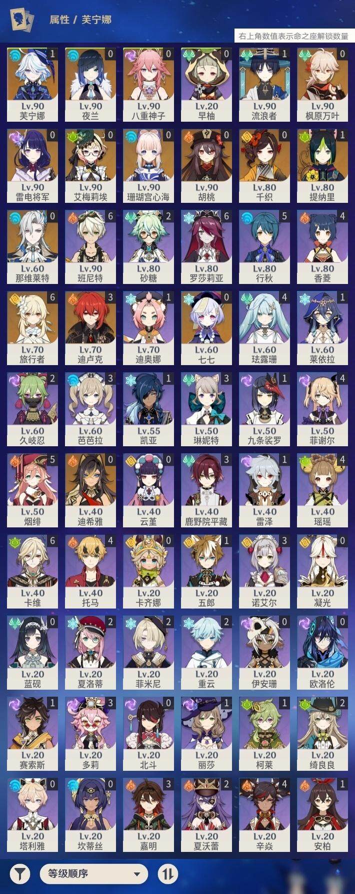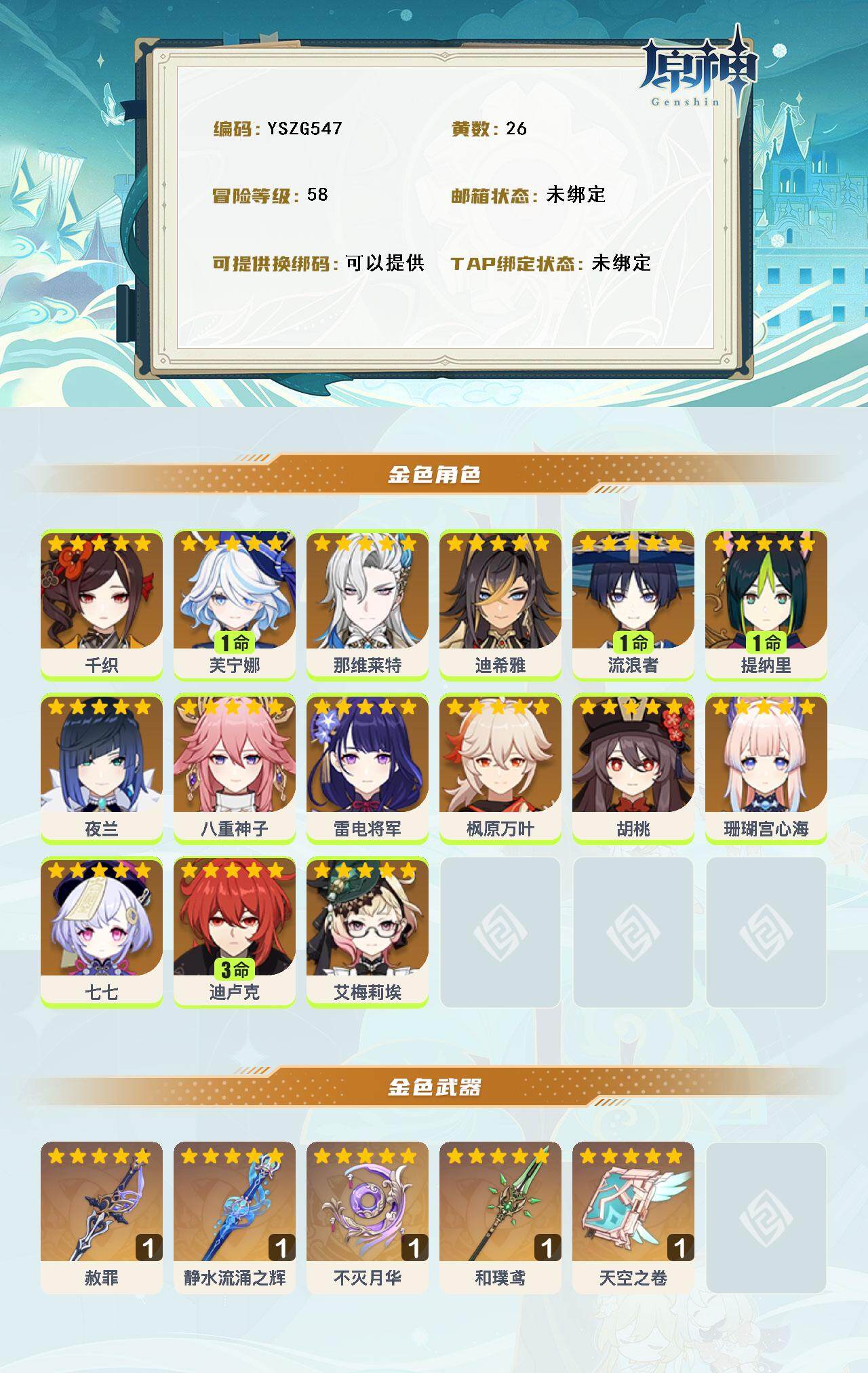 【yszg547】58级/26黄/女主/15个五星角色/5个五星武器/1命芙宁娜/0命夜兰/0命八重神子/1命流浪者/0命枫原万叶/0命雷电将军/0命艾梅莉埃/0命珊瑚宫心海/0命胡桃/0命千织/1命提纳里/0命那维莱特/3命迪卢克/0命七七/0命迪希雅/精1天空之卷/精1和璞鸢/精1静水流涌之辉/精1不灭月华/精1赦罪