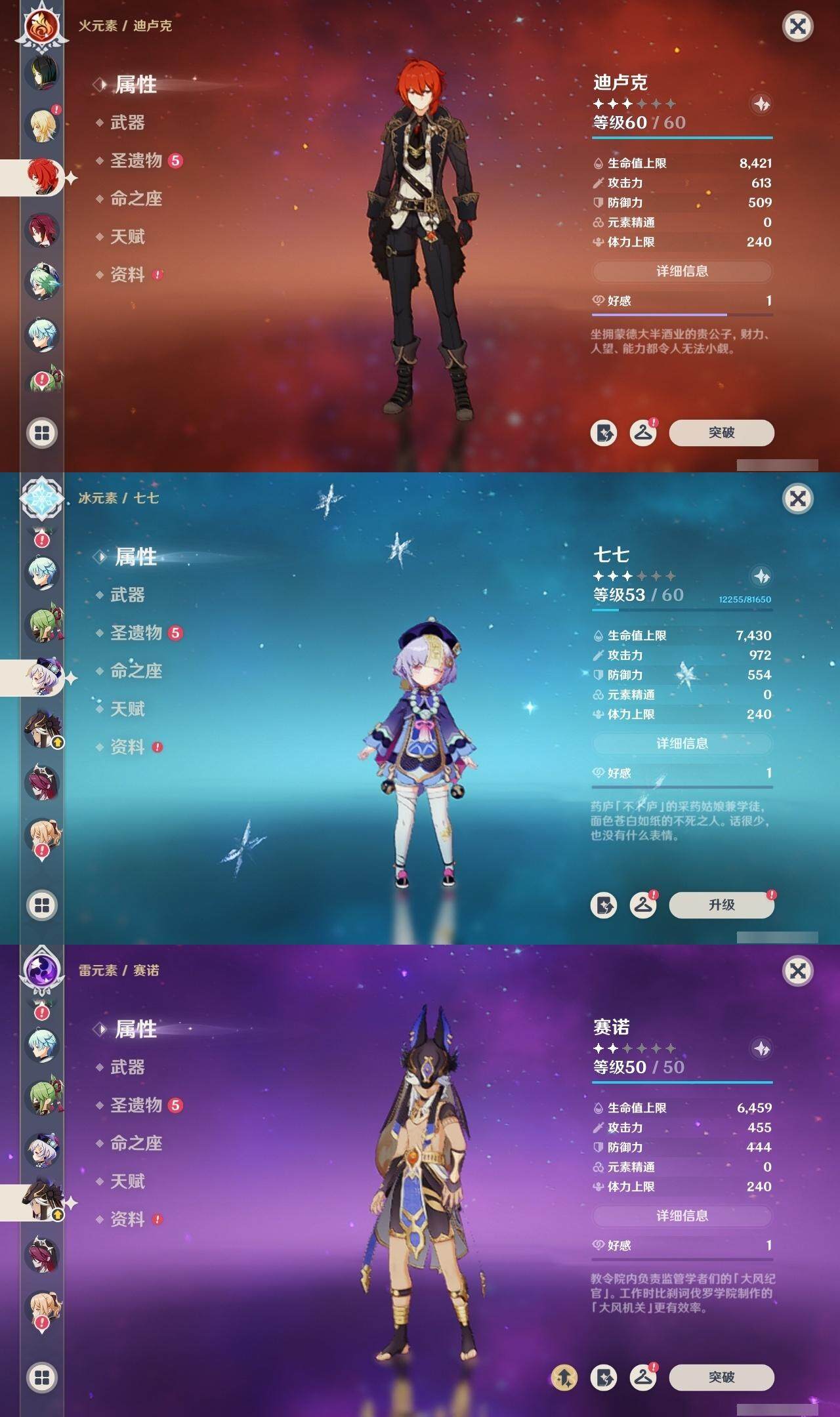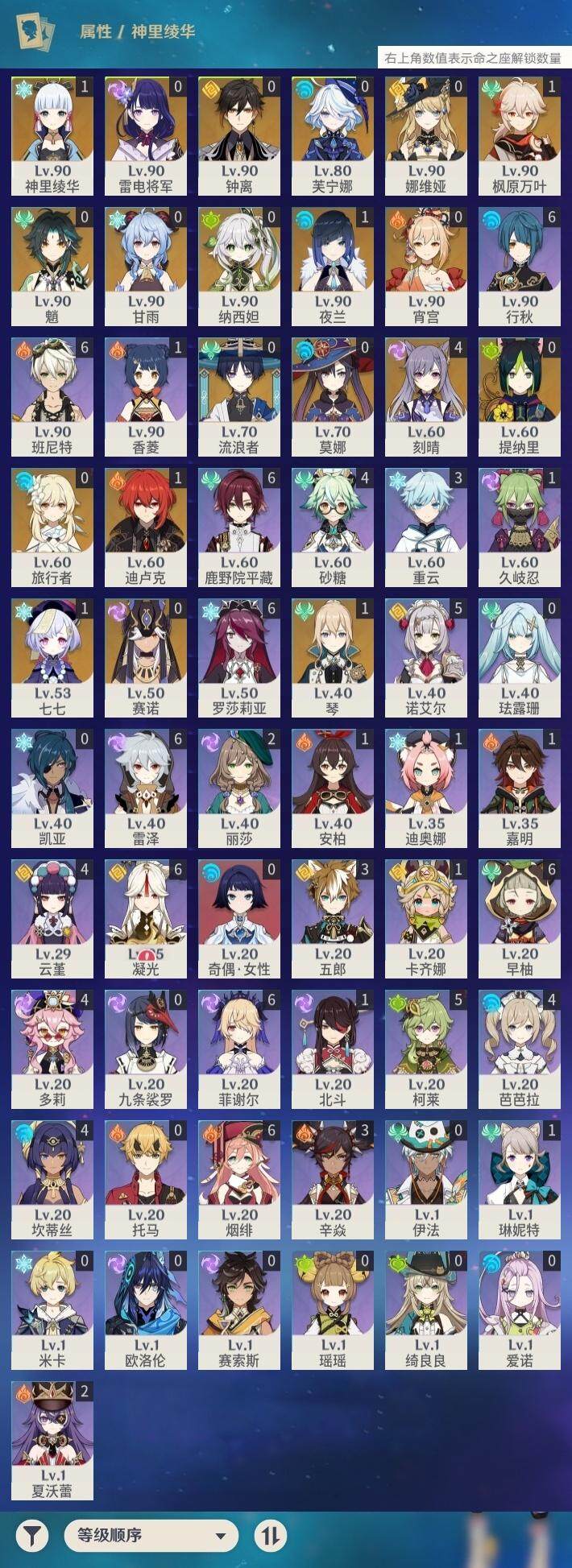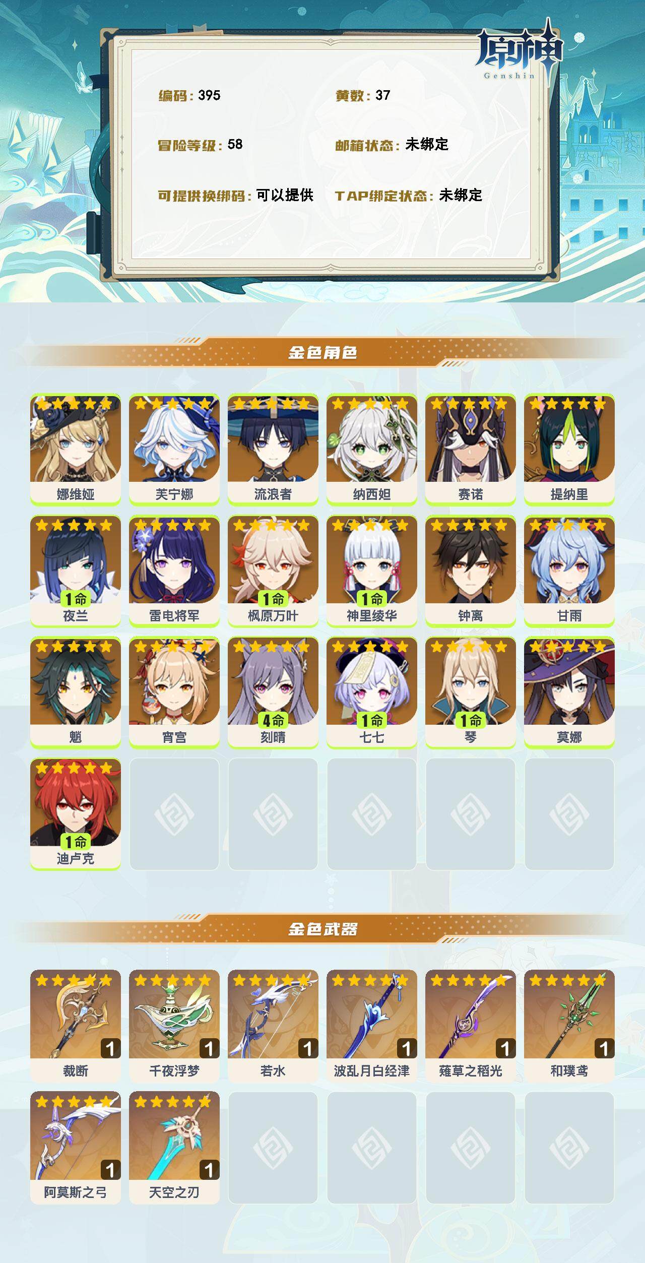 58级/37黄/女主/19个五星角色/8个五星武器 0命娜维娅0命芙宁娜0命流浪者0命纳西妲0命赛诺0命提纳里1命夜兰0命雷电将军1命枫原万叶1命神里绫华0命钟离0命甘雨0命魈0命宵宫4命刻晴1命七七1命琴0命莫娜1命迪卢克精1裁断精1千夜浮梦精1若水精1波乱月白经津精1薙草之稻光精1和璞鸢精1阿莫斯之弓精1天空之刃