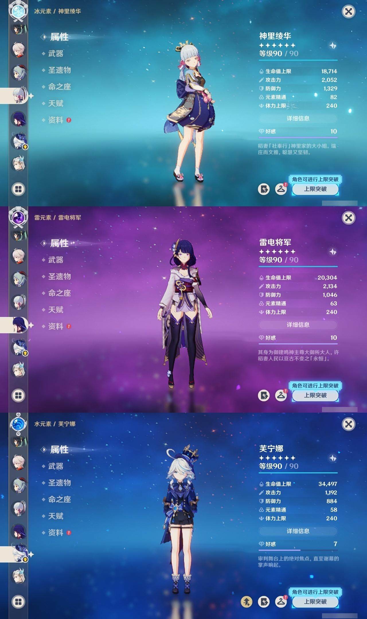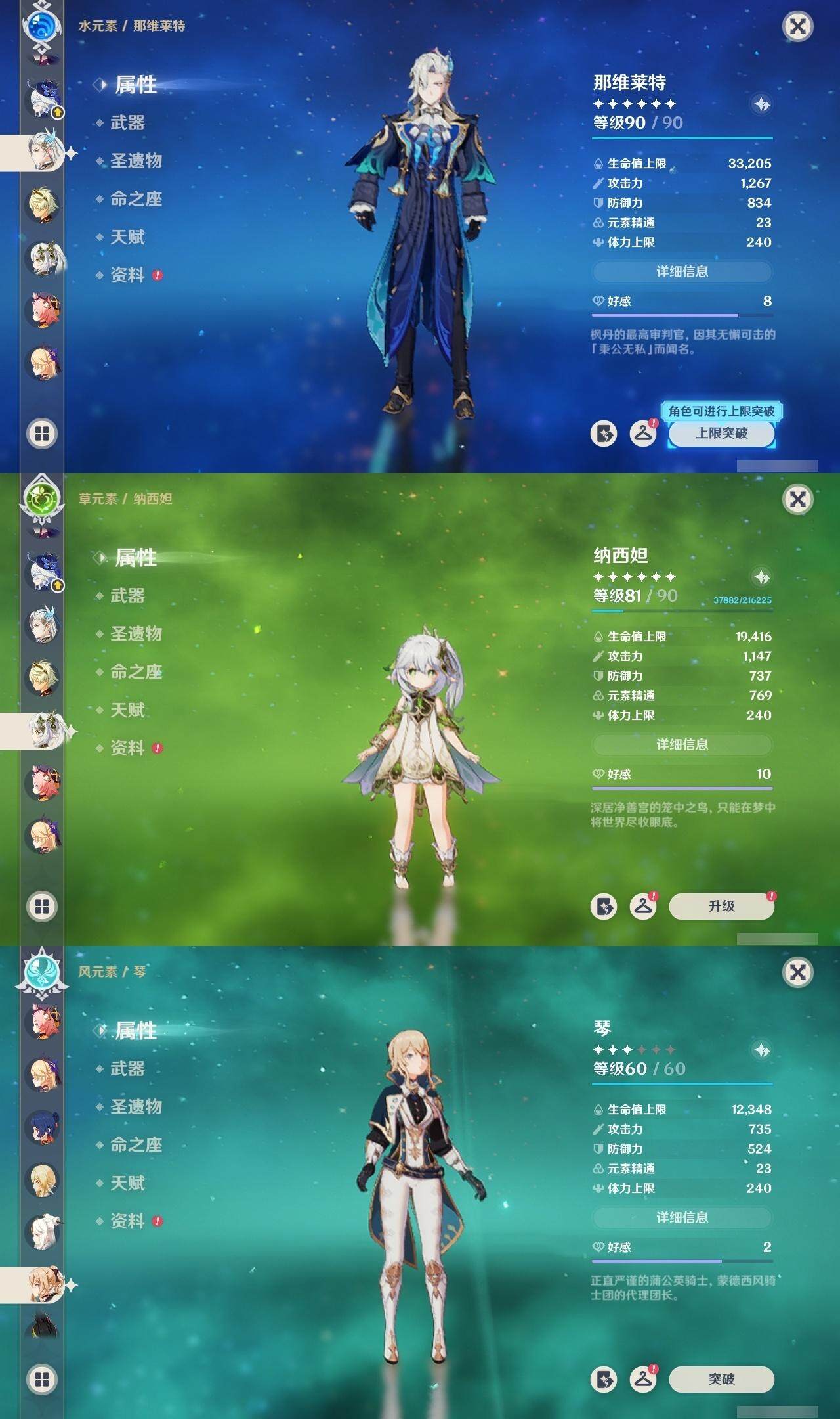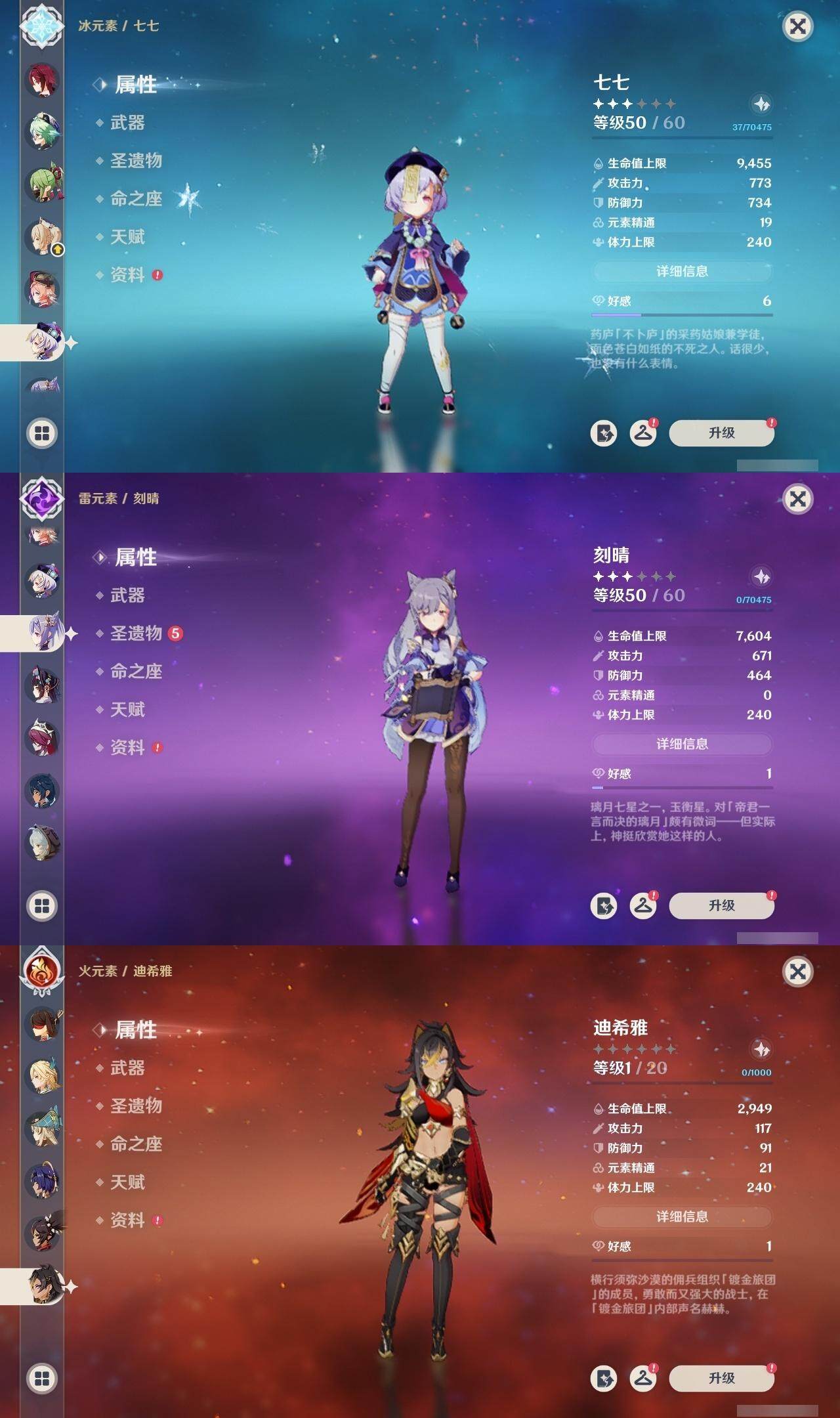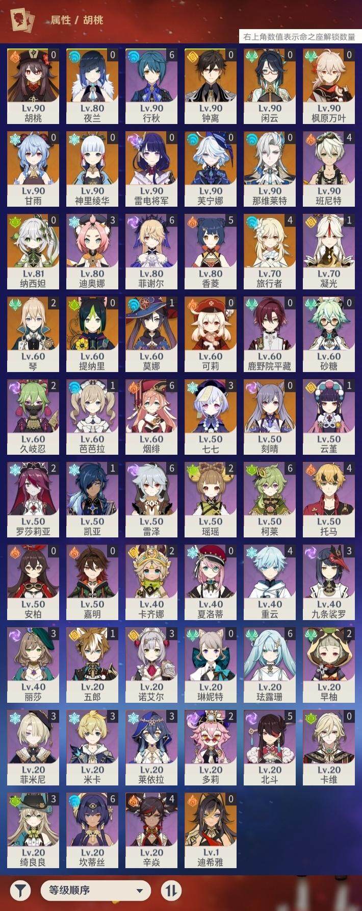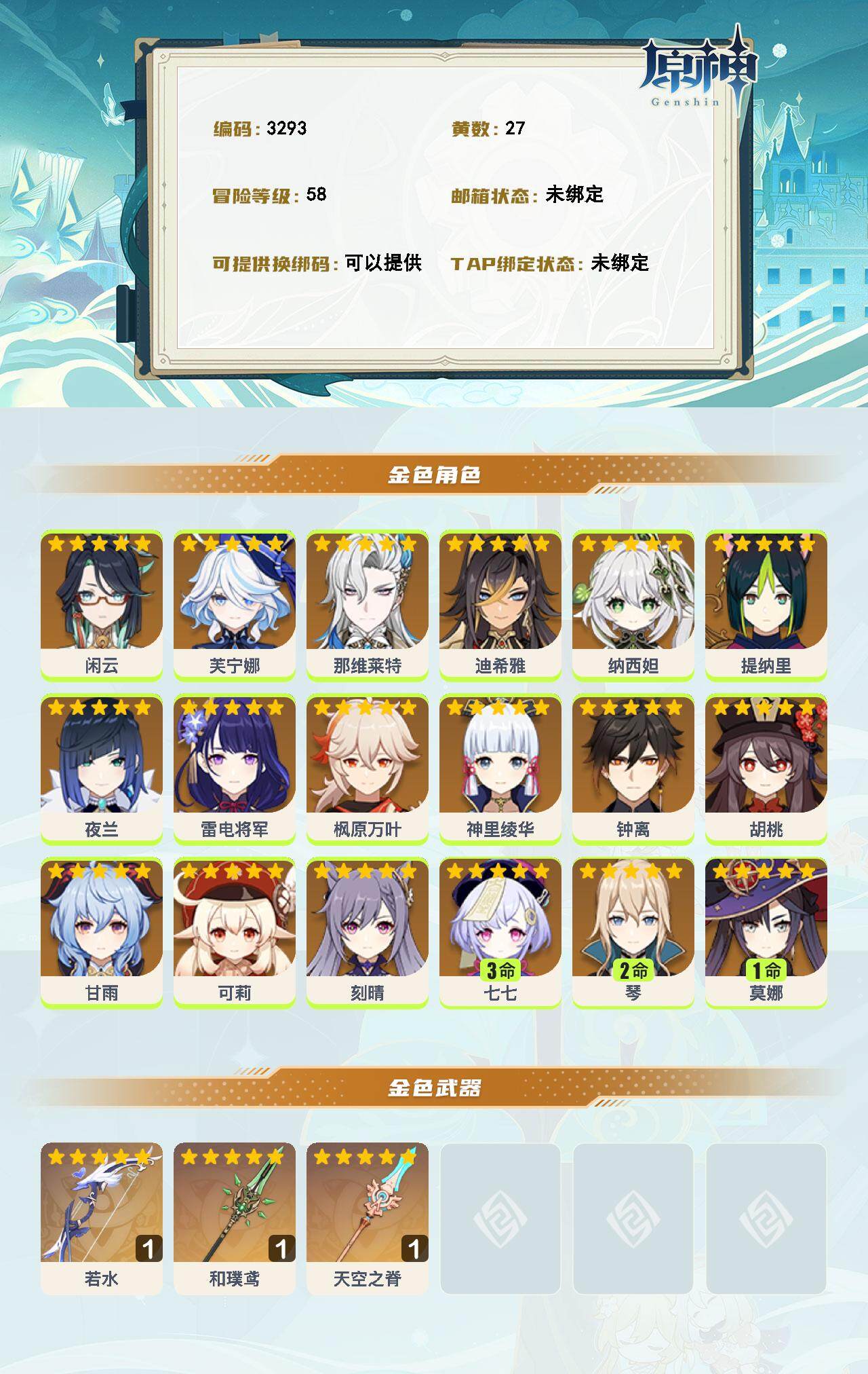 58级/27黄/女主/18个五星角色/3个五星武器 0命闲云0命芙宁娜0命那维莱特0命迪希雅0命纳西妲0命提纳里0命夜兰0命雷电将军0命枫原万叶0命神里绫华0命钟离0命胡桃0命甘雨0命可莉0命刻晴3命七七2命琴1命莫娜精1若水精1和璞鸢精1天空之脊