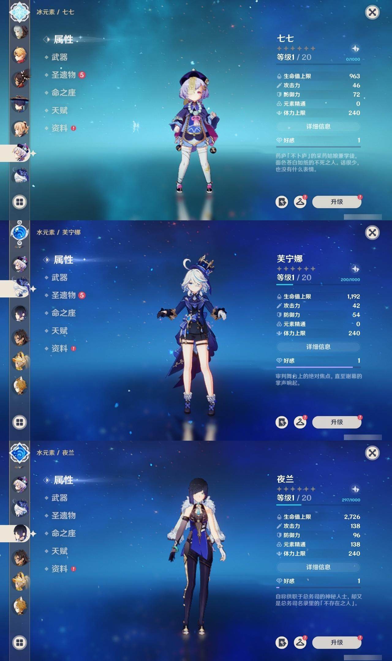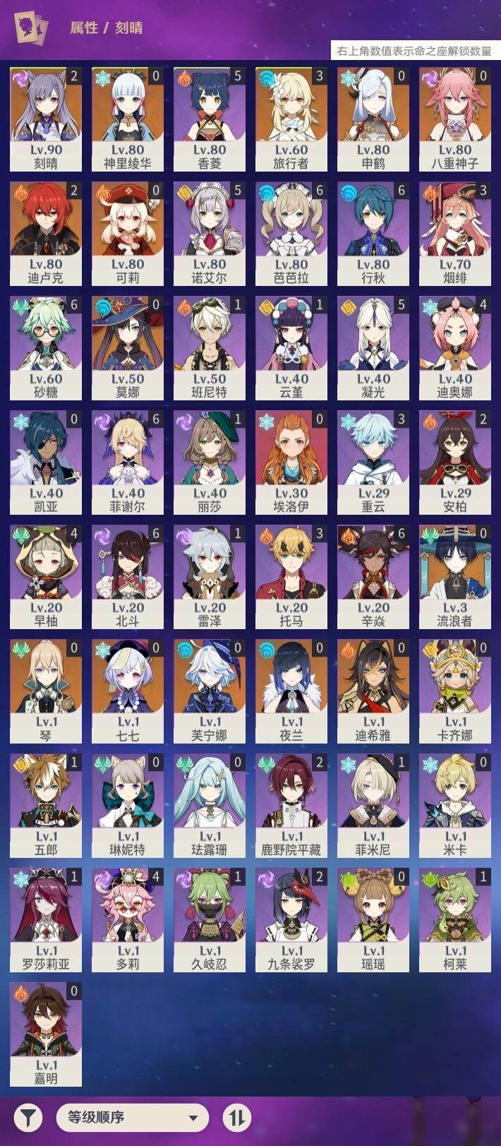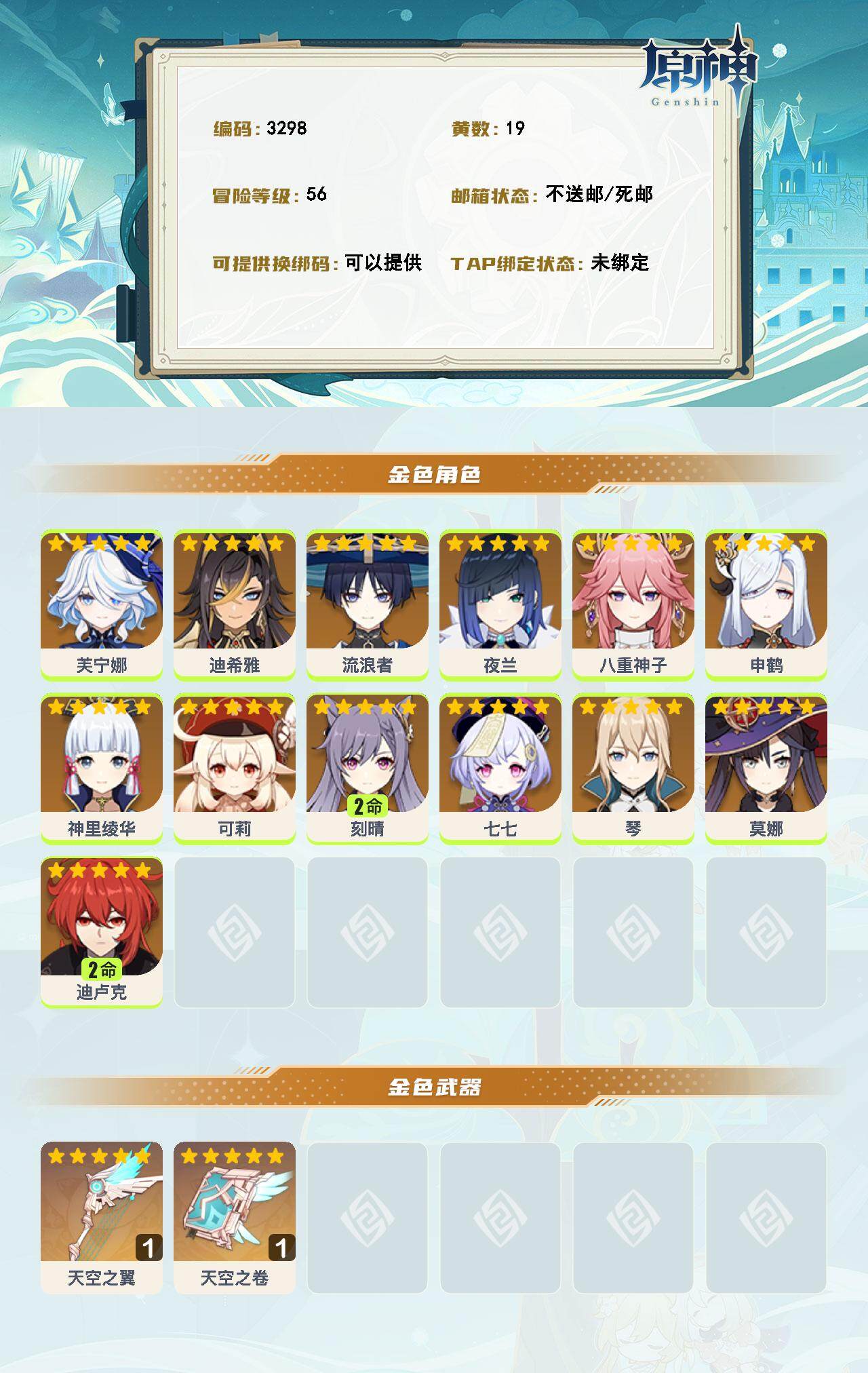 56级/19黄/女主/13个五星角色/2个五星武器 0命芙宁娜0命迪希雅0命流浪者0命夜兰0命八重神子0命申鹤0命神里绫华0命可莉2命刻晴0命七七0命琴0命莫娜2命迪卢克精1天空之翼精1天空之卷