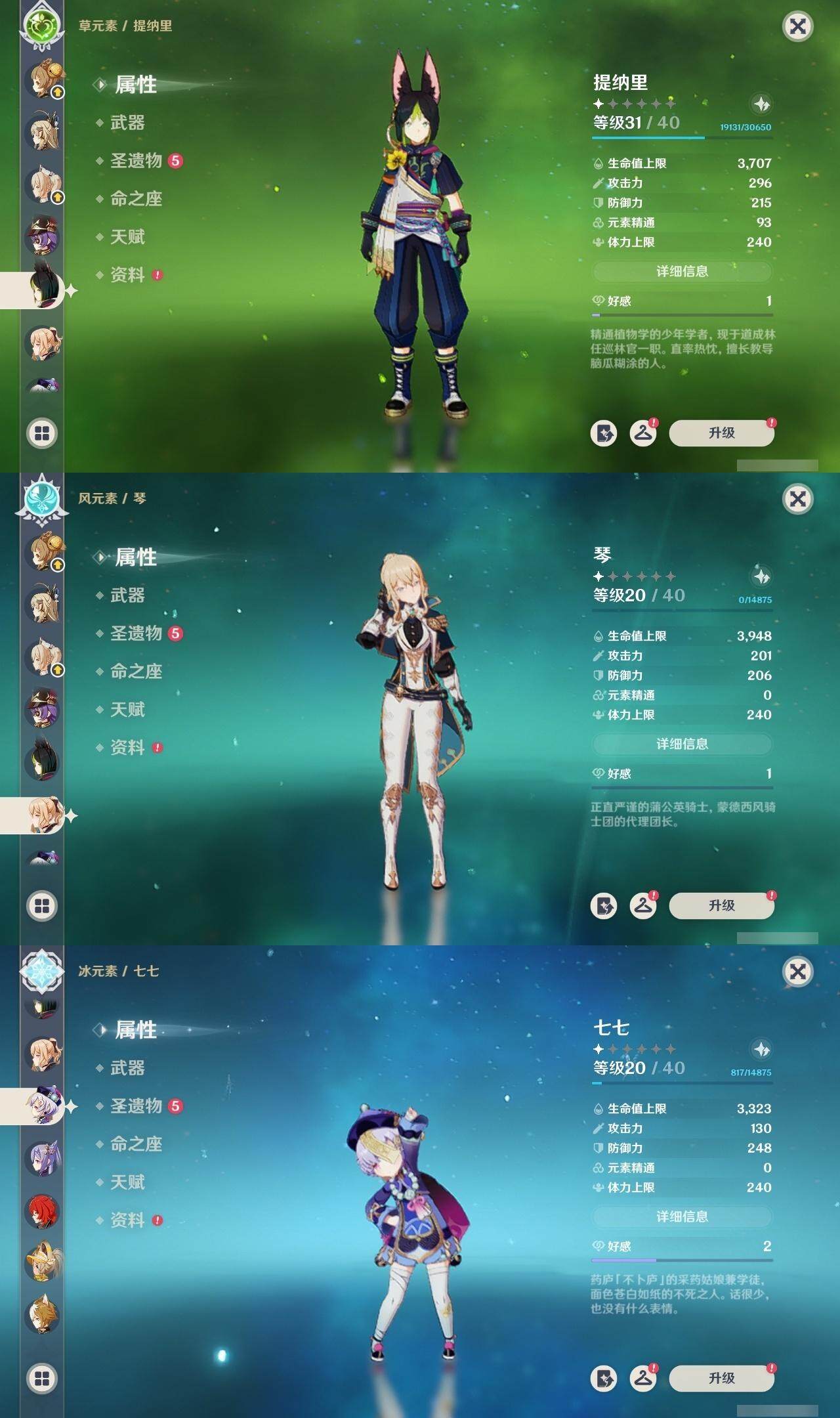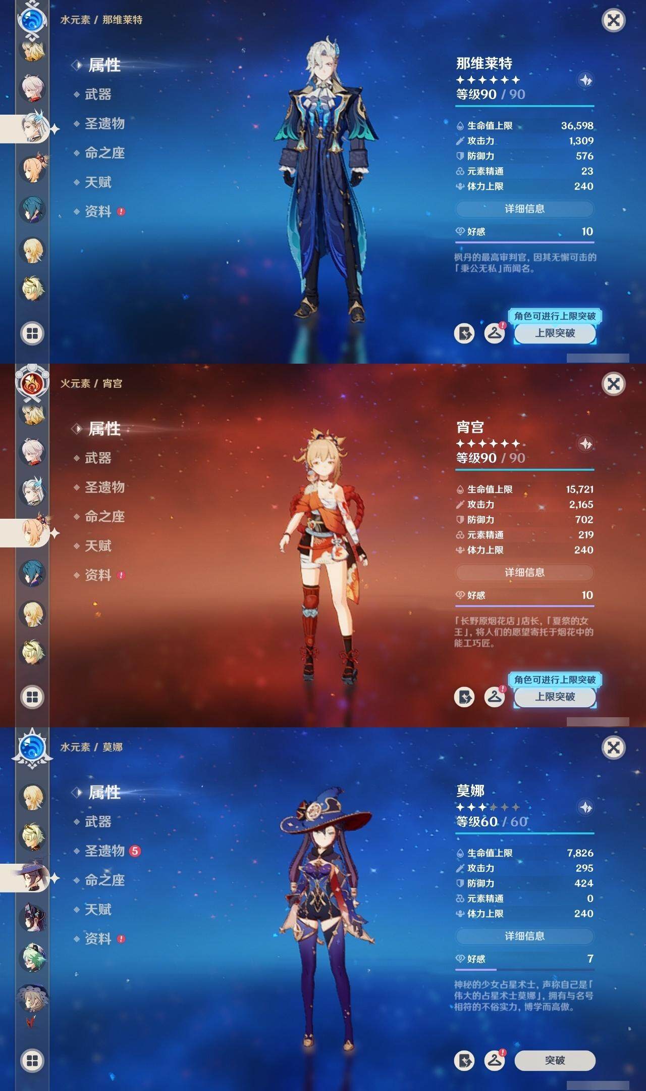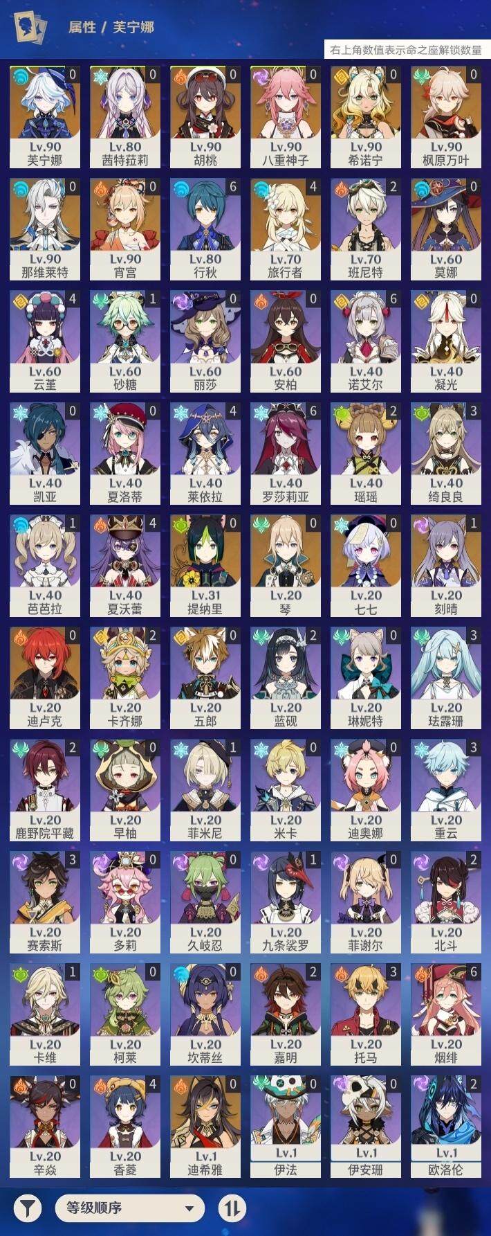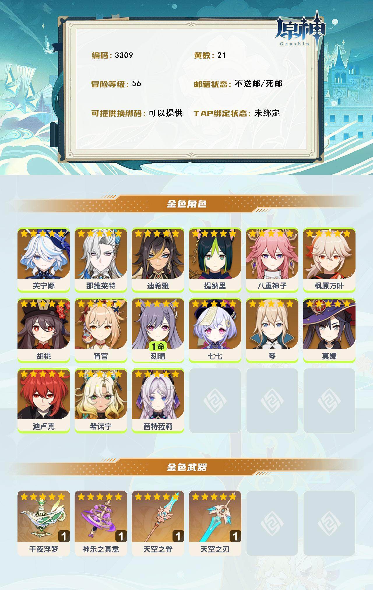 56级/21黄/女主/15个五星角色/5个五星武器 0命芙宁娜0命那维莱特0命迪希雅0命提纳里0命八重神子0命枫原万叶0命胡桃0命宵宫1命刻晴0命七七0命琴0命莫娜0命迪卢克0命希诺宁0命茜特菈莉精1千夜浮梦精1神乐之真意精1天空之脊精1天空之刃