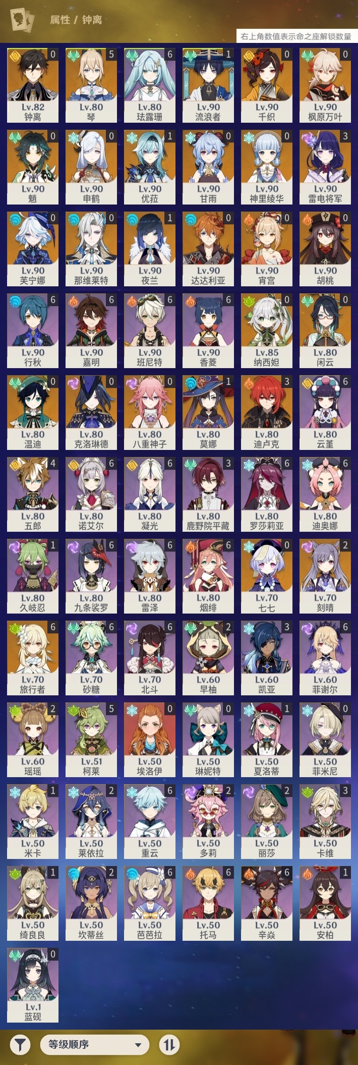 【原神】【lyys7854】冒险等级:60,五星数量:46,五星角色:琴 5命迪卢克 3命雷电将军 3命刻晴 2命莫娜 1命优菈 1命夜兰 1命流浪者 1命七七神里绫华温迪宵宫钟离达达利亚申鹤八重神子那维莱特芙宁娜闲云千织纳西妲枫原万叶甘雨魈胡桃克洛琳德__五星武器:万世流涌大典裁叶萃光图莱杜拉的回忆阿莫斯之弓飞雷之弦振风鹰剑护摩之杖磐岩结绿天空之傲天空之脊天空之卷天空之刃无工之剑薙草之稻光终末嗟叹之诗赤角石溃杵息灾贯虹之槊若水__四星角色:班尼特 6命行秋 6命九条裟罗 6命香菱 6命珐露珊 6命凝光 6命迪奥娜 6命砂糖 6命芭芭拉 6命云堇 6命托马 6命烟绯 6命重云 6命辛焱 6命诺艾尔 6命罗莎莉亚 6命雷泽 6命菲谢尔 6命北斗 6命嘉明 6命柯莱 5命五郎 4命鹿野院平藏 3命卡维 3命瑶瑶 2命莱依拉 2命坎蒂丝 2命多莉 2命早柚 2命久岐忍 1命绮良良 1命米卡 1命夏洛蒂 1命埃洛伊蓝砚菲米尼琳妮特