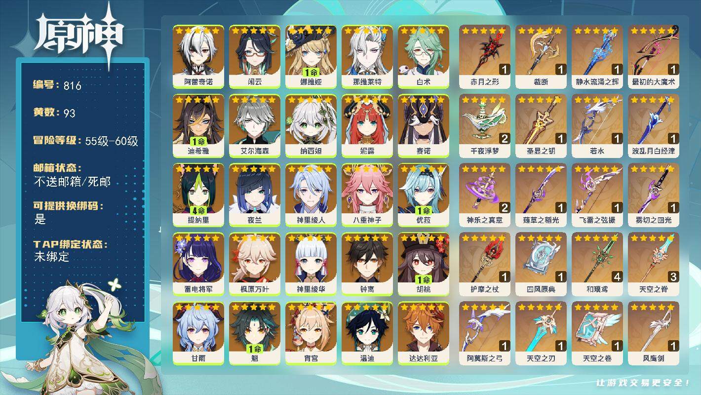 [13681615]60级/93黄/女主/36个五星角色/23个五星武器 0命阿蕾奇诺0命闲云1命娜维娅0命那维莱特0命白术1命迪希雅0命艾尔海森0命纳西妲0命妮露0命赛诺4命提纳里0命夜兰0命神里绫人0命八重神子1命优菈0命雷电将军0命枫原万叶0命神里绫华0命钟离1命胡桃0命甘雨1命魈0命宵宫0命温迪0命达达利亚3命刻晴5命七七4命琴5命莫娜1命迪卢克0命希诺宁0命玛拉妮0命恰斯卡0命玛薇卡0命瓦雷莎0命丝柯克精1赤月之形精1裁断精1静水流涌之辉精1最初的大魔术精2千夜浮梦精1圣显之钥精1若水精1波乱月白经津精2神乐之真意精1薙草之稻光精1飞雷之弦振精1雾切之回光精1护摩之杖精1四风原典精4和璞鸢精3天空之脊精1阿莫斯之弓精1天空之刃精1天空之卷精1风鹰剑精1天空之傲