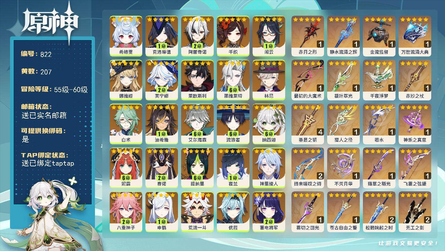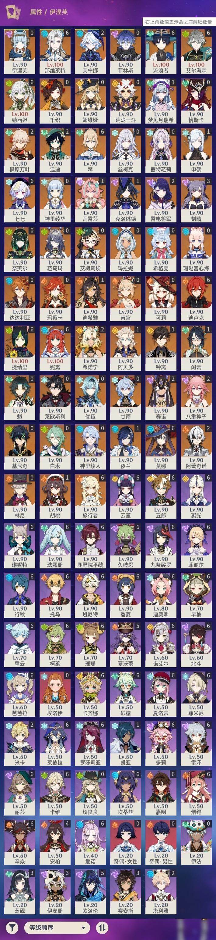 [13702874]60级/207黄/女主/56个五星角色/41个五星武器 0命希格雯1命克洛琳德2命阿蕾奇诺0命千织1命闲云0命娜维娅2命芙宁娜0命莱欧斯利满命那维莱特0命林尼0命白术1命迪希雅满命艾尔海森满命流浪者满命纳西妲满命妮露2命赛诺满命提纳里1命夜兰0命神里绫人2命八重神子1命申鹤0命荒泷一斗0命优菈2命雷电将军2命枫原万叶0命神里绫华1命钟离1命胡桃0命甘雨0命魈0命宵宫2命温迪0命可莉0命达达利亚1命阿贝多0命珊瑚宫心海3命刻晴满命七七满命琴满命莫娜满命迪卢克0命基尼奇2命希诺宁0命玛拉妮0命艾梅莉埃0命恰斯卡0命玛薇卡0命茜特菈莉1命梦见月瑞希1命瓦雷莎0命丝柯克0命伊涅芙0命菈乌玛0命菲林斯0命奈芙尔精1赤月之形精1静水流涌之辉精1金流监督精1万世流涌大典精1最初的大魔术精1裁叶萃光精1千夜浮梦精1赤沙之杖精4圣显之钥精1猎人之径精1若水精1神乐之真意精2终末嗟叹之诗精1不灭月华精1薙草之稻光精1飞雷之弦振精1雾切之回光精1苍古自由之誓精2松籁响起之时精2无工之剑精1护摩之杖精1磐岩结绿精5四风原典精4和璞鸢精2天空之脊精1贯虹之槊精2天空之翼精1阿莫斯之弓精1天空之刃精1斫峰之刃精3天空之卷精2风鹰剑精2狼的末路精3天空之傲