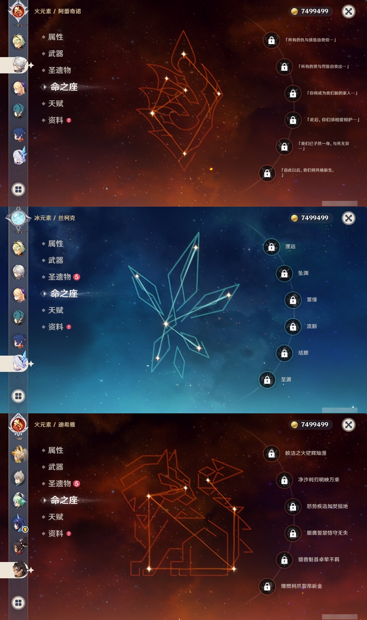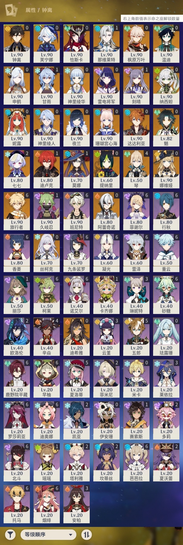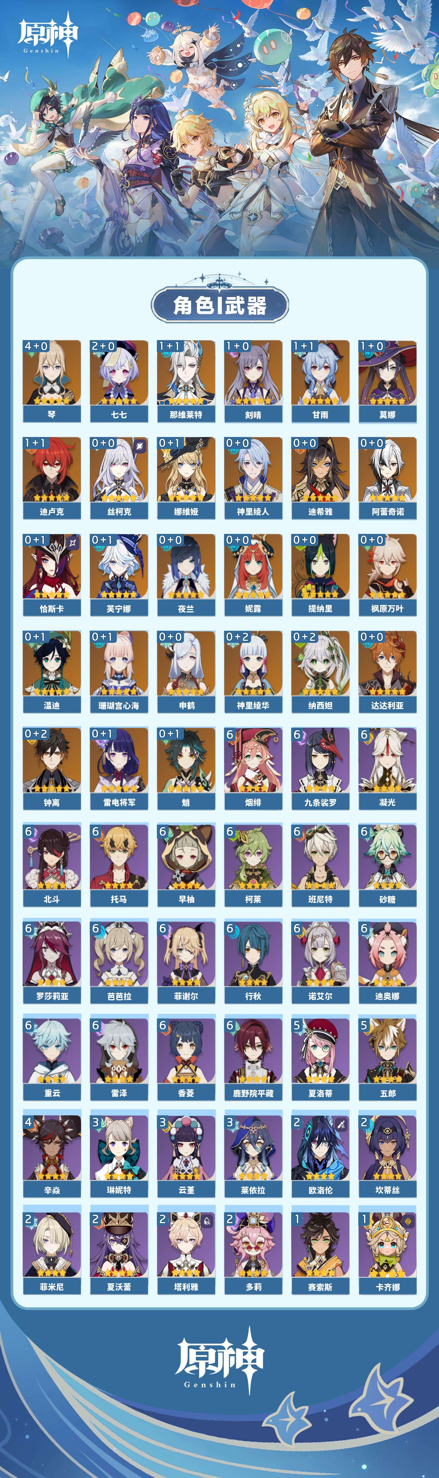 【原神】【lyys7885】冒险等级:59,五星数量:45,五星角色:琴 4命七七 2命那维莱特 1命迪卢克 1命甘雨 1命刻晴 1命莫娜 1命珊瑚宫心海神里绫华温迪恰斯卡迪希雅钟离达达利亚申鹤神里绫人夜兰芙宁娜娜维娅提纳里阿蕾奇诺丝柯克妮露纳西妲枫原万叶魈雷电将军__五星武器:天空之脊 3精雾切之回光 2精贯虹之槊 2精千夜浮梦 2精星鹫赤羽万世流涌大典静水流涌之辉裁断阿莫斯之弓不灭月华和璞鸢狼的末路四风原典天空之傲天空之卷天空之刃薙草之稻光终末嗟叹之诗__四星角色:班尼特 6命行秋 6命九条裟罗 6命香菱 6命鹿野院平藏 6命凝光 6命迪奥娜 6命砂糖 6命柯莱 6命芭芭拉 6命早柚 6命托马 6命烟绯 6命重云 6命诺艾尔 6命罗莎莉亚 6命雷泽 6命菲谢尔 6命北斗 6命五郎 5命夏洛蒂 5命辛焱 4命莱依拉 3命云堇 3命琳妮特 3命坎蒂丝 2命多莉 2命欧洛伦 2命菲米尼 2命夏沃蕾 2命塔利雅 2命卡齐娜 1命久岐忍 1命瑶瑶 1命赛索斯 1命珐露珊米卡伊安珊