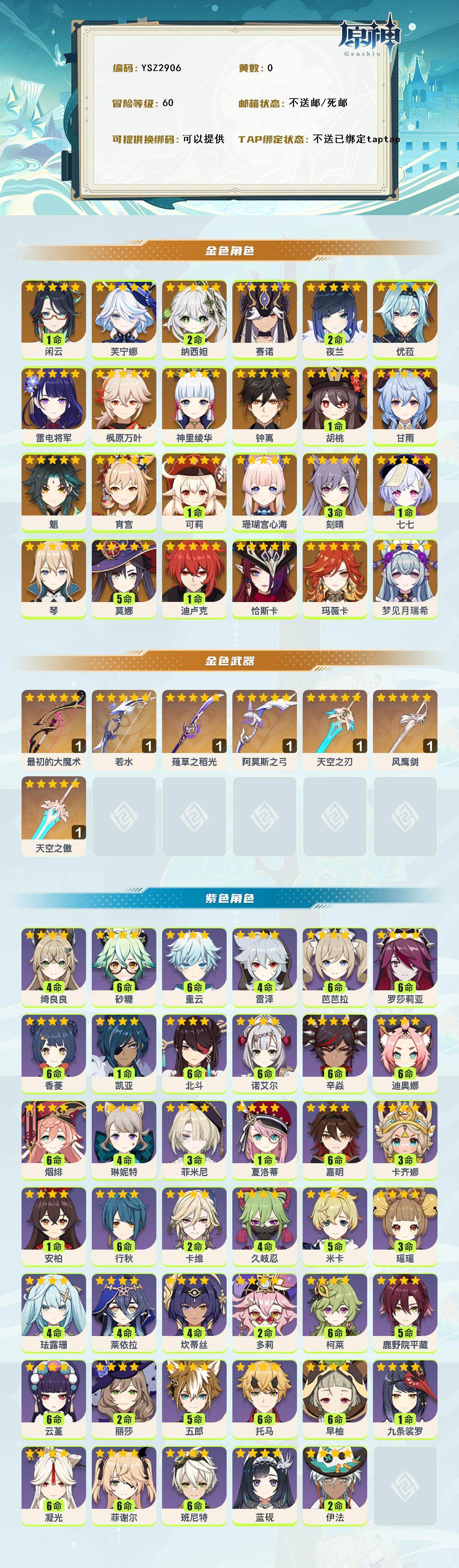 【ysz2906】60级/女主/26个五星角色/0命梦见月瑞希/0命玛薇卡/0命恰斯卡/1命闲云/0命芙宁娜/2命纳西妲/0命赛诺/2命夜兰/0命珊瑚宫心海/0命雷电将军/0命宵宫/0命神里绫华/0命枫原万叶/0命优菈/1命胡桃/0命魈/0命甘雨/0命钟离/1命可莉/0命琴/3命刻晴/1命迪卢克/5命莫娜/1命七七/精1最初的大魔术/精1若水/精1薙草之稻光/精1天空之傲/精1阿莫斯之弓/精1风鹰剑/精1天空之刃/2命伊法/0命蓝砚/3命卡齐娜/满命嘉明/0命夏洛蒂/3命菲米尼/4命琳妮特/4命绮良良/2命卡维/5命米卡/3命瑶瑶/4命珐露珊/4命莱依拉/4命坎蒂丝/2命多莉/满命柯莱/5命鹿野院平藏/4命久岐忍/满命云堇/5命五郎/满命托马/1命九条裟罗/满命早柚/满命烟绯/满命罗莎莉亚/满命辛焱/满命迪奥娜/满命砂糖/4命雷泽/满命菲谢尔/2命丽莎/满命北斗/满命香菱/1命安柏/满命班尼特/满命行秋/满命芭芭拉/满命凝光/满命诺艾尔/0命凯亚/满命重云
