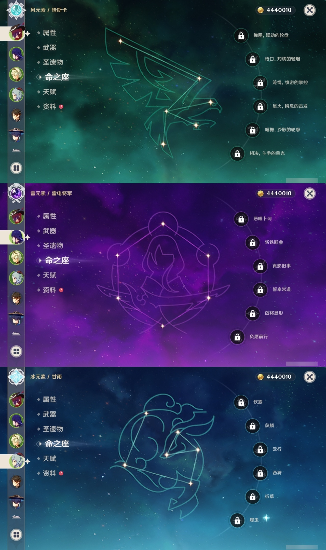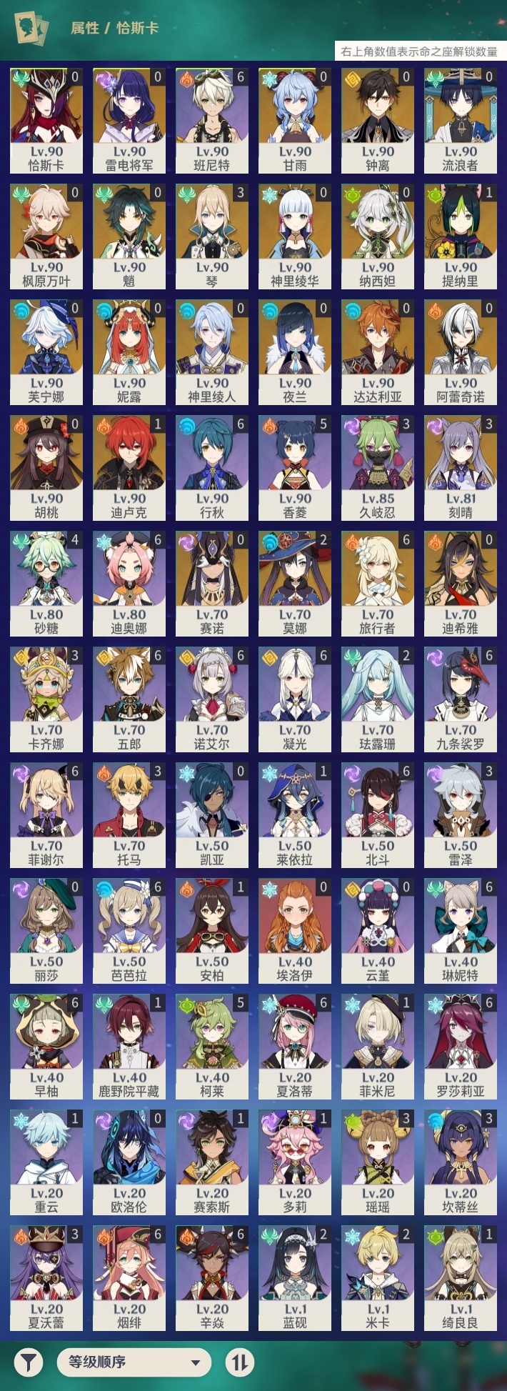 【原神】【lyys7922】冒险等级:60,五星数量:37,五星角色:刻晴 3命琴 3命莫娜 2命迪卢克 1命提纳里 1命神里绫华恰斯卡迪希雅钟离达达利亚神里绫人夜兰芙宁娜赛诺阿蕾奇诺妮露纳西妲流浪者枫原万叶甘雨魈胡桃雷电将军__五星武器:万世流涌大典阿莫斯之弓尘世之锁和璞鸢护摩之杖磐岩结绿天空之脊天空之翼薙草之稻光终末嗟叹之诗息灾若水千夜浮梦__四星角色:班尼特 6命行秋 6命九条裟罗 6命凝光 6命迪奥娜 6命芭芭拉 6命早柚 6命五郎 6命烟绯 6命辛焱 6命诺艾尔 6命罗莎莉亚 6命菲谢尔 6命北斗 6命琳妮特 6命夏洛蒂 6命香菱 5命柯莱 5命砂糖 4命卡齐娜 3命久岐忍 3命瑶瑶 3命坎蒂丝 3命托马 3命雷泽 3命夏沃蕾 3命珐露珊 2命米卡 2命蓝砚 2命鹿野院平藏 1命绮良良 1命莱依拉 1命多莉 1命重云 1命菲米尼 1命赛索斯 1命埃洛伊欧洛伦云堇