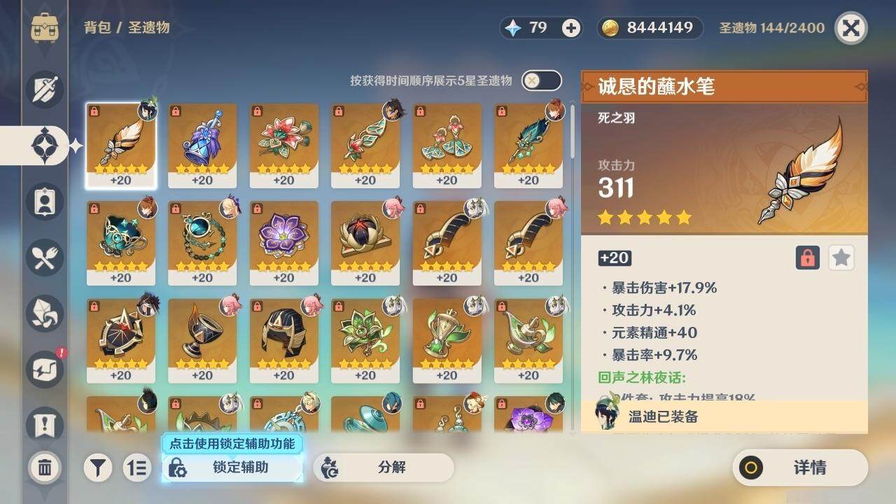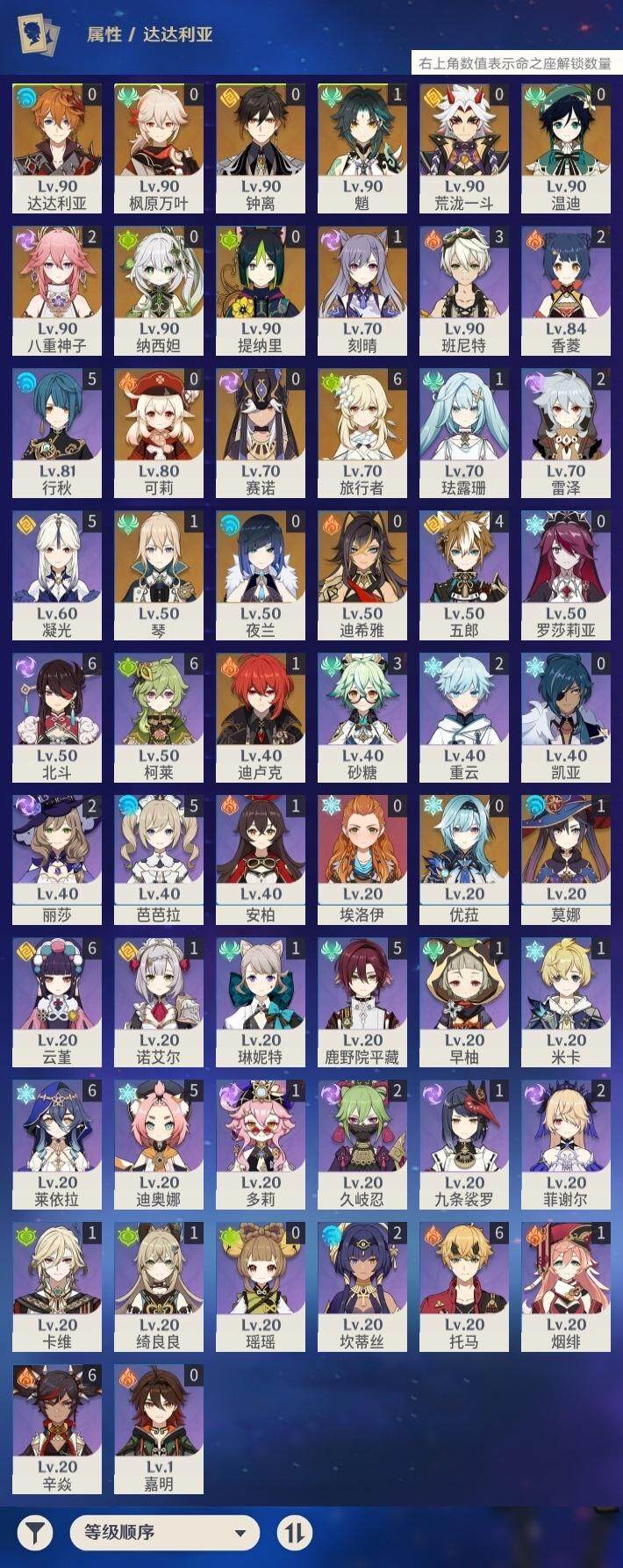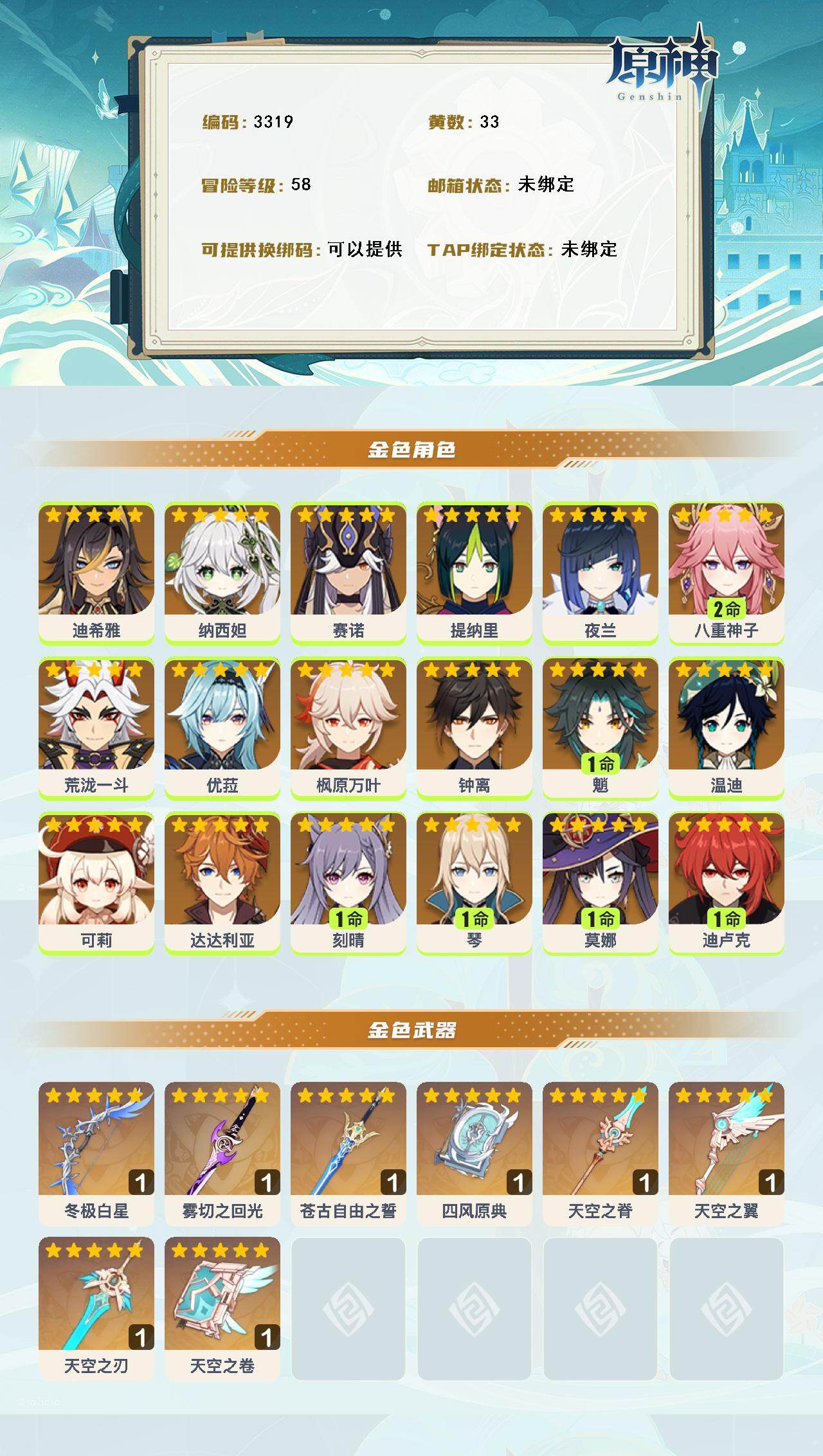 58级/33黄/女主/18个五星角色/8个五星武器 0命迪希雅0命纳西妲0命赛诺0命提纳里0命夜兰2命八重神子0命荒泷一斗0命优菈0命枫原万叶0命钟离1命魈0命温迪0命可莉0命达达利亚1命刻晴1命琴1命莫娜1命迪卢克精1冬极白星精1雾切之回光精1苍古自由之誓精1四风原典精1天空之脊精1天空之翼精1天空之刃精1天空之卷