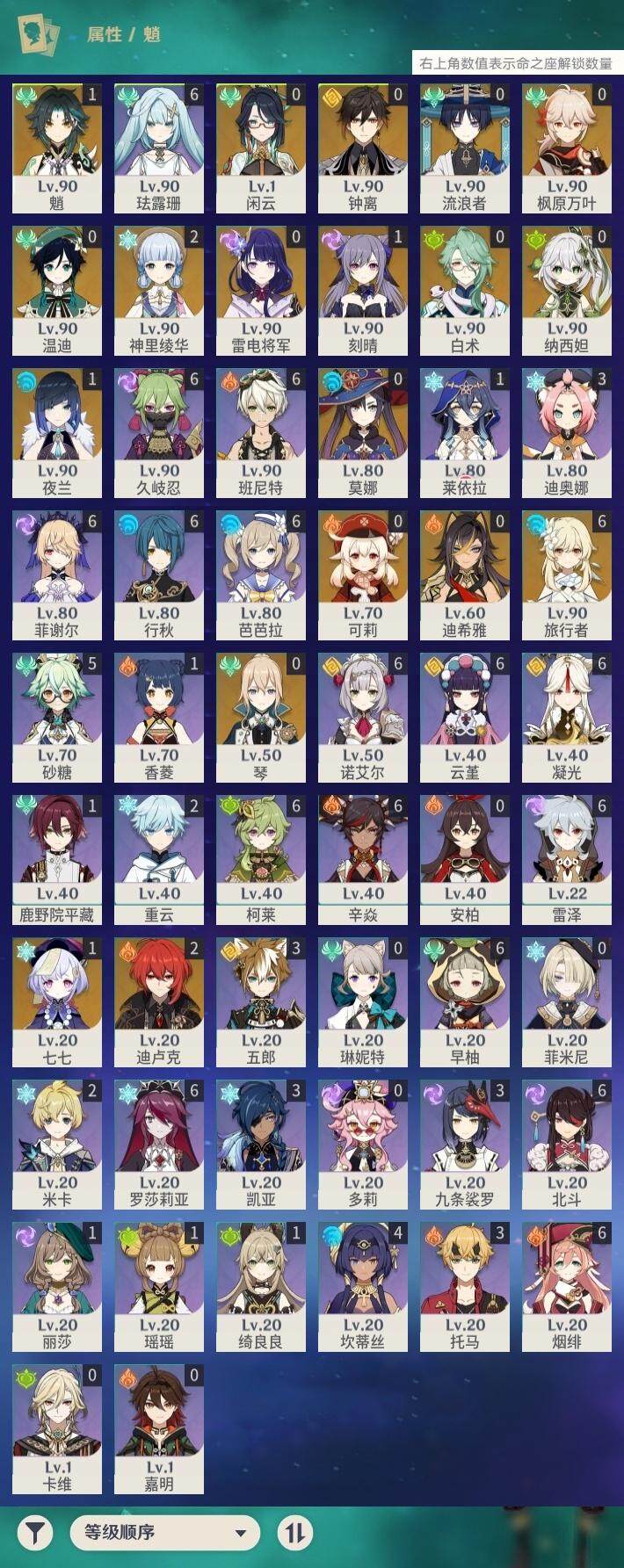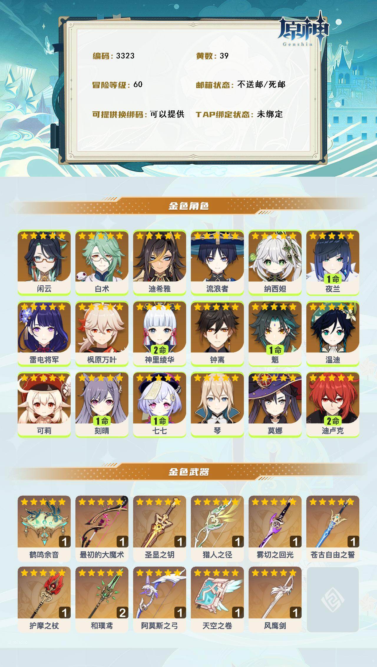 60级/39黄/女主/18个五星角色/12个五星武器 0命闲云0命白术0命迪希雅0命流浪者0命纳西妲1命夜兰0命雷电将军0命枫原万叶2命神里绫华0命钟离1命魈0命温迪0命可莉1命刻晴1命七七0命琴0命莫娜2命迪卢克精1鹤鸣余音精1最初的大魔术精1圣显之钥精1猎人之径精1雾切之回光精1苍古自由之誓精1护摩之杖精2和璞鸢精1阿莫斯之弓精1天空之卷精1风鹰剑