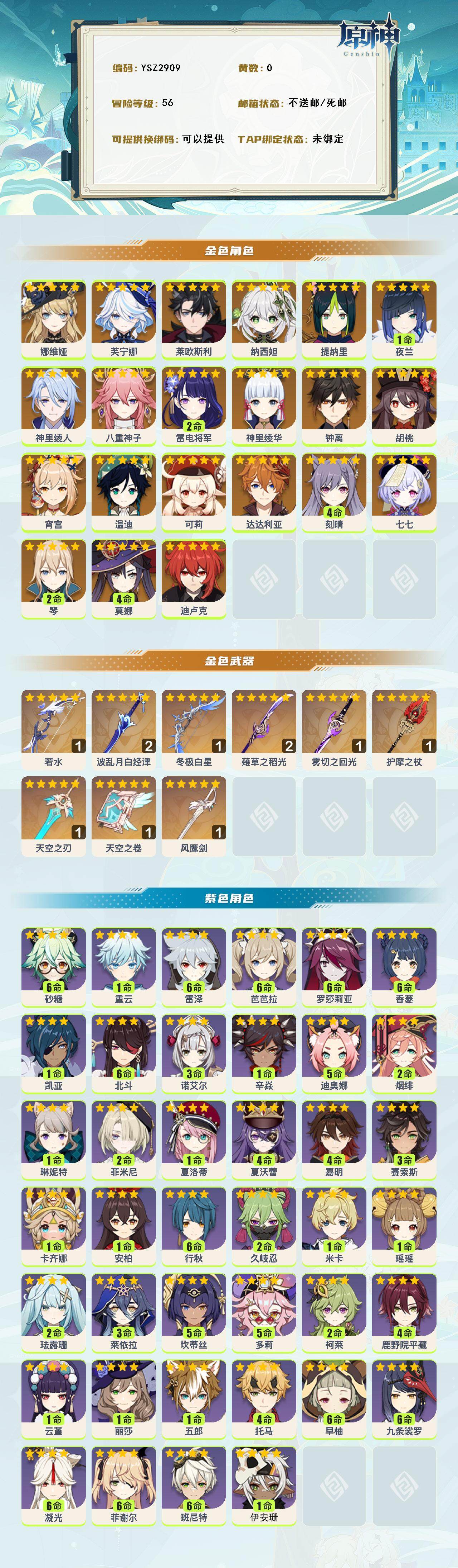 【ysz2909】56级/女主/22个五星角色/0命娜维娅/0命芙宁娜/0命莱欧斯利/0命纳西妲/0命提纳里/1命夜兰/0命神里绫人/0命八重神子/2命雷电将军/0命宵宫/0命神里绫华/0命胡桃/0命钟离/0命达达利亚/0命可莉/0命温迪/2命琴/4命刻晴/0命迪卢克/4命莫娜/0命七七/精1若水/精2波乱月白经津/精1冬极白星/精2薙草之稻光/精1雾切之回光/精1护摩之杖/精1天空之卷/精1风鹰剑/精1天空之刃/1命伊安珊/1命卡齐娜/3命赛索斯/4命嘉明/4命夏沃蕾/0命夏洛蒂/2命菲米尼/1命琳妮特/1命米卡/1命瑶瑶/2命珐露珊/3命莱依拉/5命坎蒂丝/5命多莉/2命柯莱/4命鹿野院平藏/2命久岐忍/0命云堇/1命五郎/4命托马/满命九条裟罗/满命早柚/2命烟绯/满命罗莎莉亚/0命辛焱/5命迪奥娜/满命砂糖/满命雷泽/满命菲谢尔/1命丽莎/满命北斗/满命香菱/1命安柏/满命班尼特/满命行秋/满命芭芭拉/满命凝光/3命诺艾尔/0命凯亚/1命重云