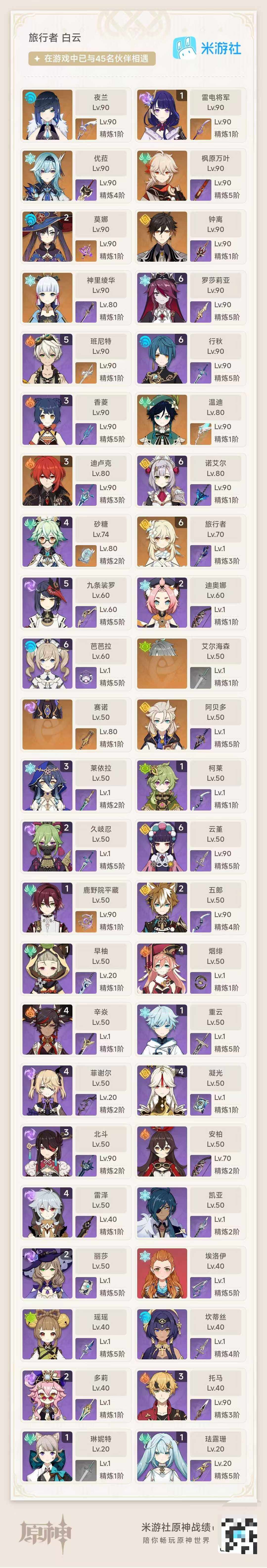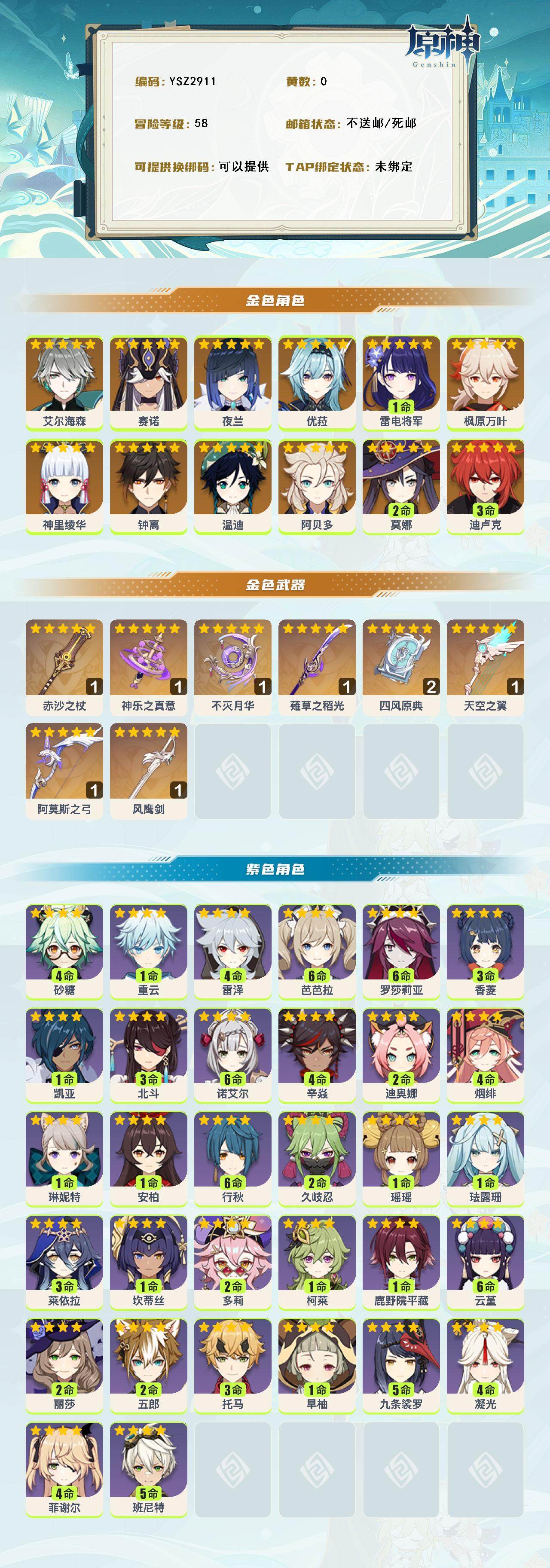 【ysz2911】58级/女主/14个五星角色/0命艾尔海森/0命赛诺/0命夜兰/1命雷电将军/0命神里绫华/0命枫原万叶/0命优菈/0命阿贝多/0命钟离/0命温迪/3命迪卢克/2命莫娜/精1赤沙之杖/精1神乐之真意/精1薙草之稻光/精1不灭月华/精2四风原典/精1阿莫斯之弓/精1风鹰剑/精1天空之翼/1命琳妮特/0命瑶瑶/1命珐露珊/3命莱依拉/0命坎蒂丝/2命多莉/1命柯莱/1命鹿野院平藏/2命久岐忍/满命云堇/2命五郎/3命托马/5命九条裟罗/1命早柚/4命烟绯/满命罗莎莉亚/4命辛焱/2命迪奥娜/4命砂糖/4命雷泽/4命菲谢尔/2命丽莎/3命北斗/3命香菱/0命安柏/5命班尼特/满命行秋/满命芭芭拉/4命凝光/满命诺艾尔/0命凯亚/1命重云