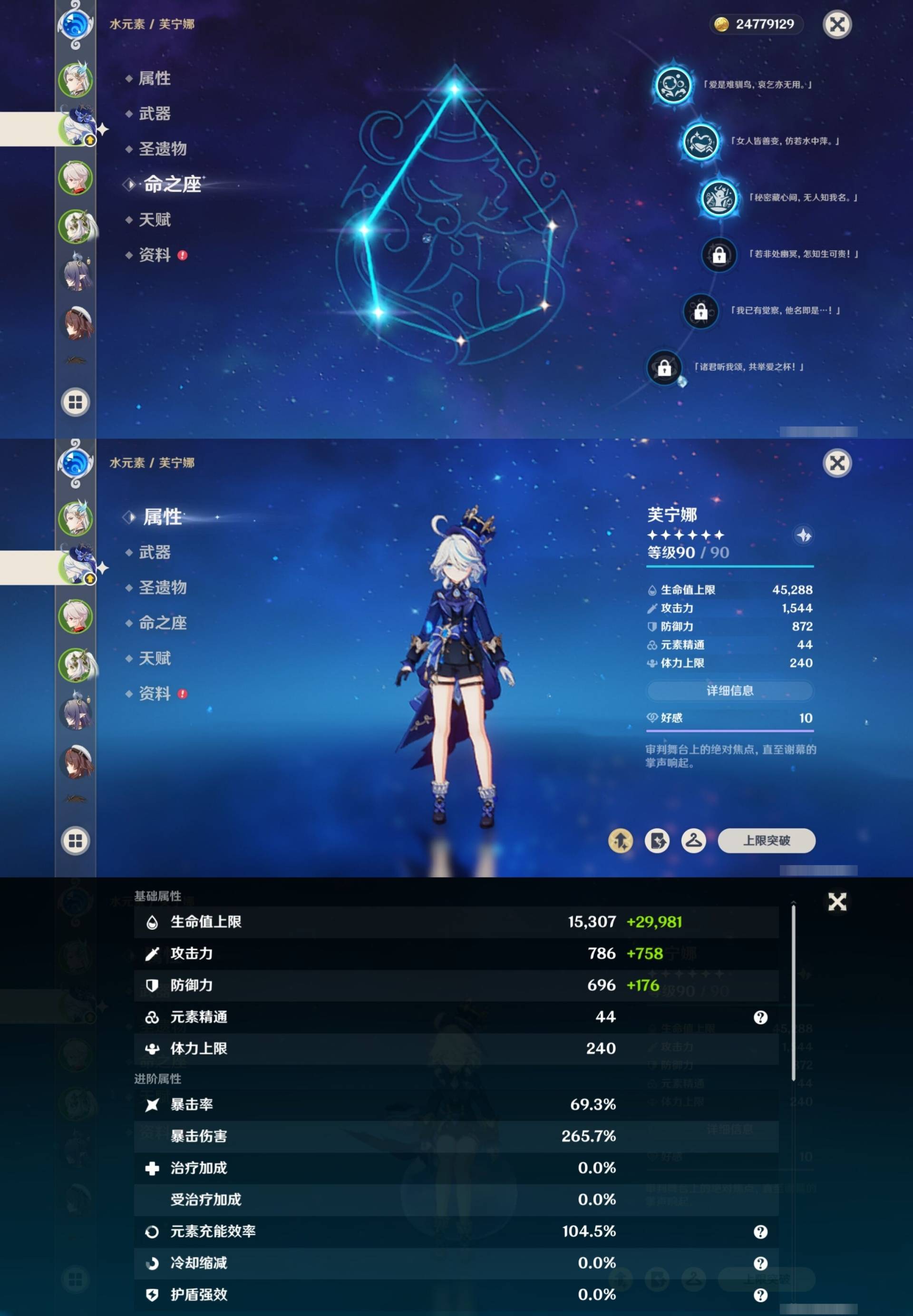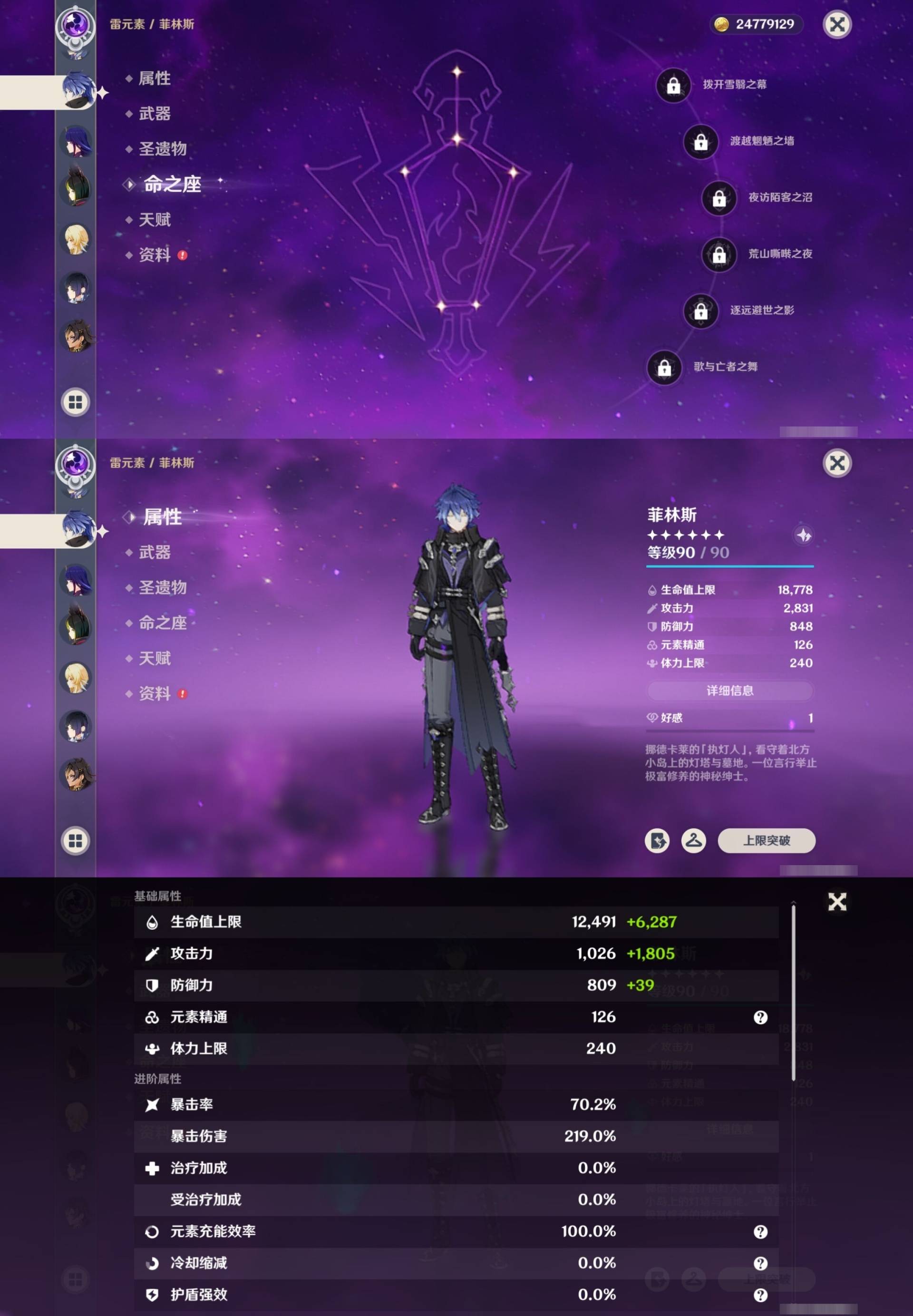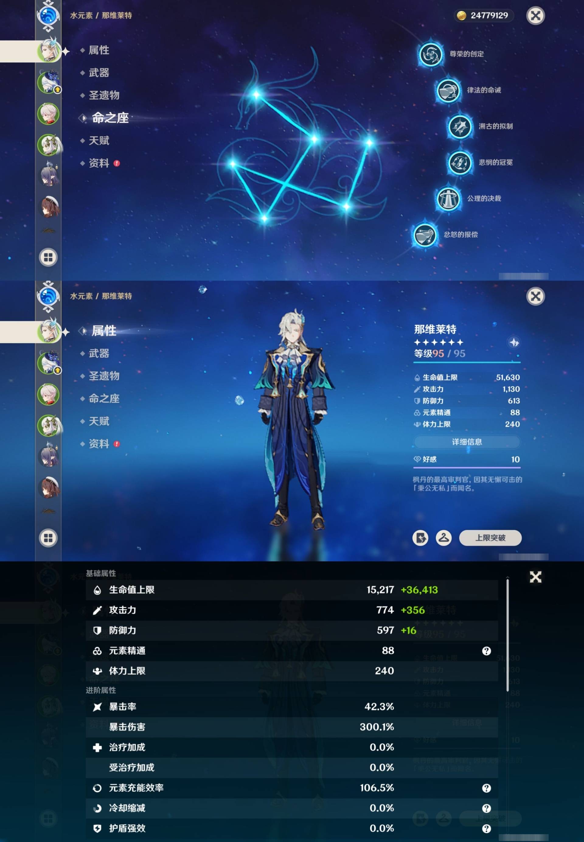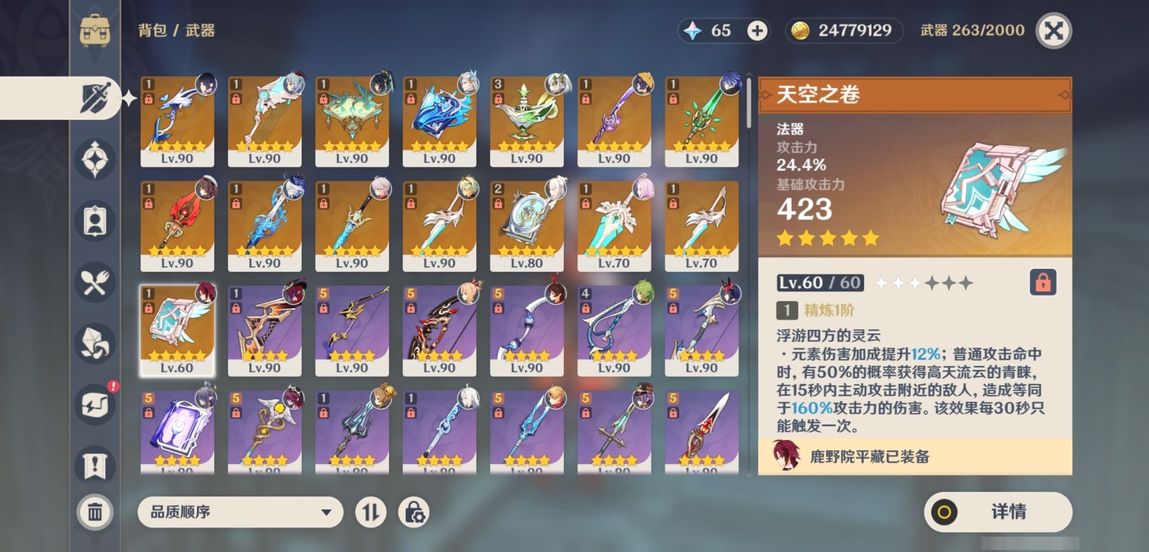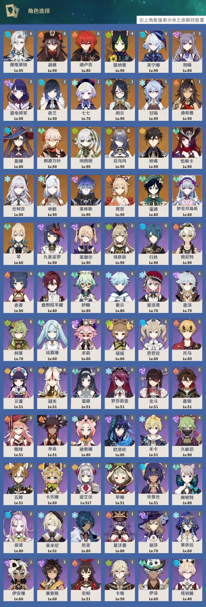 [13787558]81黄 风:0命枫原万叶,0命恰斯卡,1命闲云,0命温迪,0命梦见月瑞希,0命琴 火:6命胡桃,1命迪希雅,0命宵宫,6命迪卢克 水:6命那维莱特,3命芙宁娜,2命夜兰,1命莫娜 冰:0命丝柯克,0命申鹤,1命甘雨,2命七七 岩:0命钟离 雷:0命菲林斯,2命雷电将军,3命刻晴 草:0命纳西妲,0命菈乌玛,4命提纳里 弓:精1若水,精1天空之翼 法器:精1鹤鸣余音,精1万世流涌大典,精3千夜浮梦,精2四风原典,精1天空之卷 单手剑:精1静水流涌之辉,精1苍古自由之誓,精1风鹰剑,精1风鹰剑 双手剑:精1天空之傲 长柄武器:精1薙草之稻光,精1和璞鸢,精1护摩之杖 【角色皮肤】 五星角色:胡桃-宿雪桃红 四星角色:香菱-岁夜欢哗,行秋-雨化竹身,凯亚-帆影游风,丽莎-叶隐芳名,菲谢尔-极夜真梦,凝光-纱中幽兰