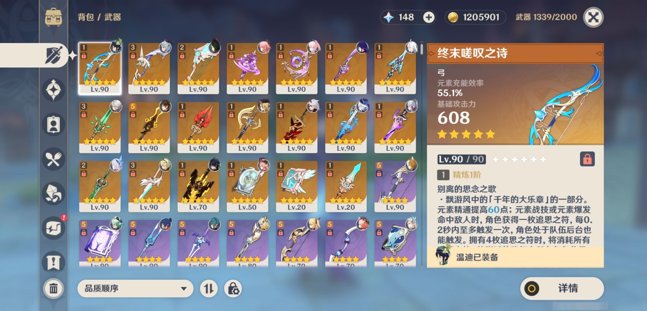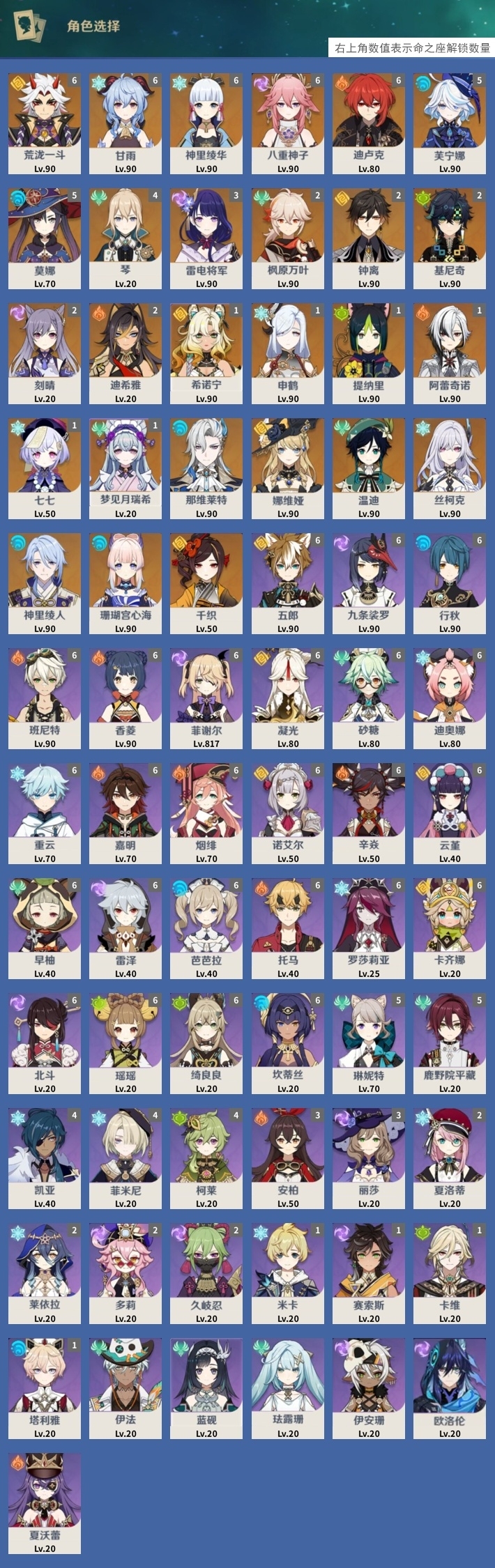 [13787721]122黄 风系:0命温迪/1命梦见月瑞希/4命琴/2命枫原万叶 火系:1命阿蕾奇诺/6命迪卢克/2命迪希雅 水系:5命芙宁娜/0命神里绫人/0命珊瑚宫心海/5命莫娜/0命那维莱特 冰系:0命丝柯克/1命申鹤/6命甘雨/6命神里绫华/1命七七 岩系:0命娜维娅/6命荒泷一斗/2命钟离/0命千织/1命希诺宁 雷系:6命八重神子/3命雷电将军/2命刻晴 草系:2命基尼奇/1命提纳里 [四星角色等级及命座] 风系: 6命砂糖/5命琳妮特/6命早柚/0命伊法/0命蓝砚/0命珐露珊/5命鹿野院平藏 火系: 6命班尼特/6命香菱/6命嘉明/6命烟绯/6命辛焱/3命安柏/6命托马/0命夏沃蕾 水系:6命行秋/6命芭芭拉/1命塔利雅/6命坎蒂丝 冰系:6命迪奥娜/6命重云/4命凯亚/6命罗莎莉亚/2命夏洛蒂/4命菲米尼/1命米卡/2命莱依拉 岩系:6命五郎/6命凝光/6命诺艾尔/6命云堇 雷系:6命九条裟罗/6命菲谢尔/6命雷泽/0命伊安珊/0命欧洛伦/1命赛索斯/2命多莉/2命久岐忍/6命北斗/3命丽莎 草系:1命卡维/6命瑶瑶/4命柯莱/6命绮良良 [角色经验书] 紫色92/蓝色962