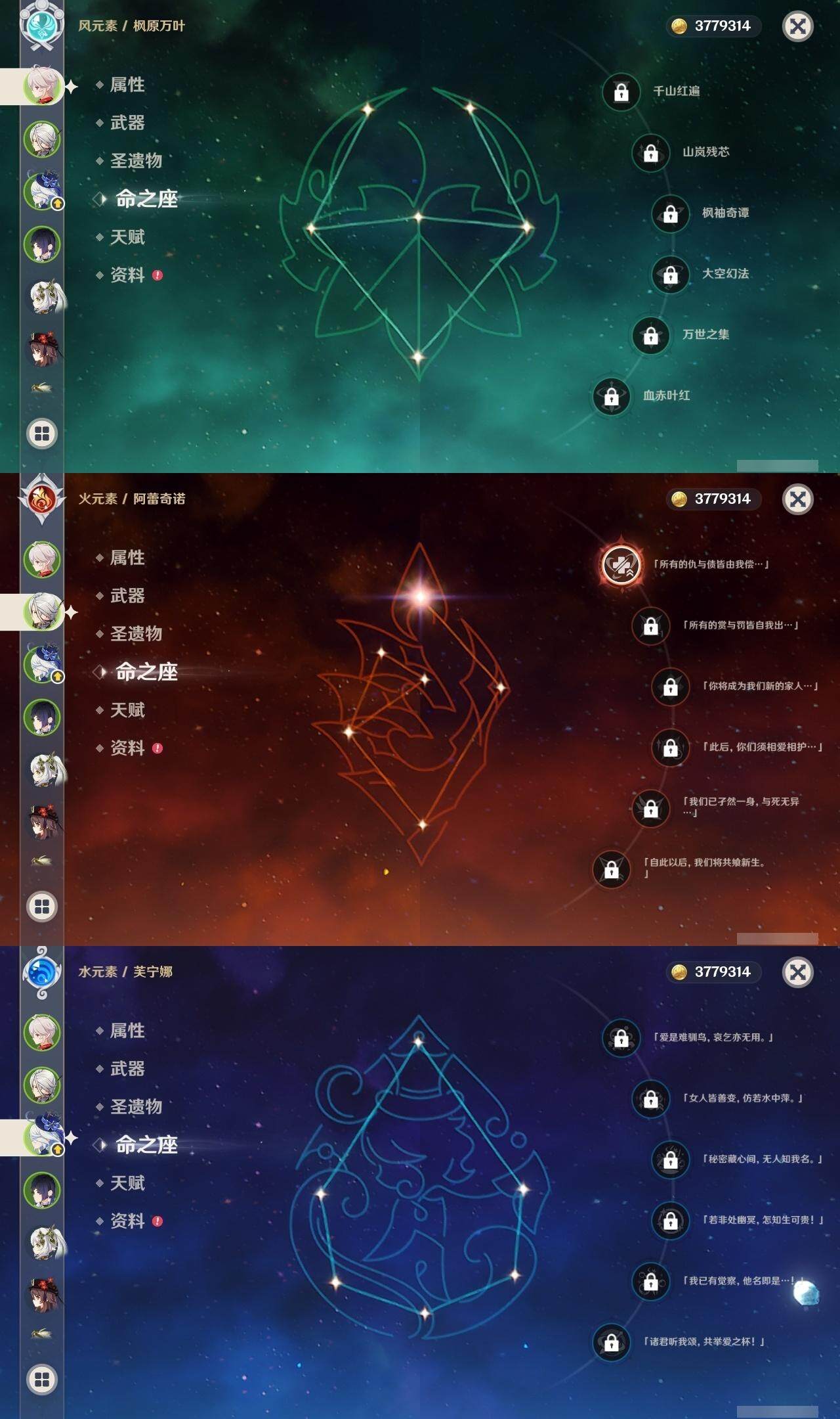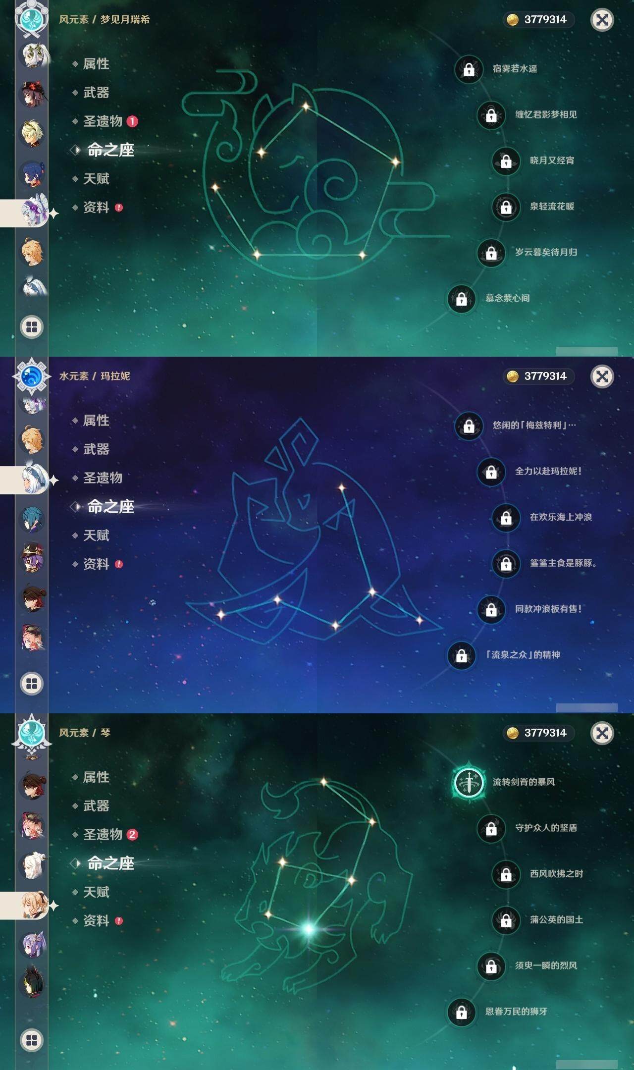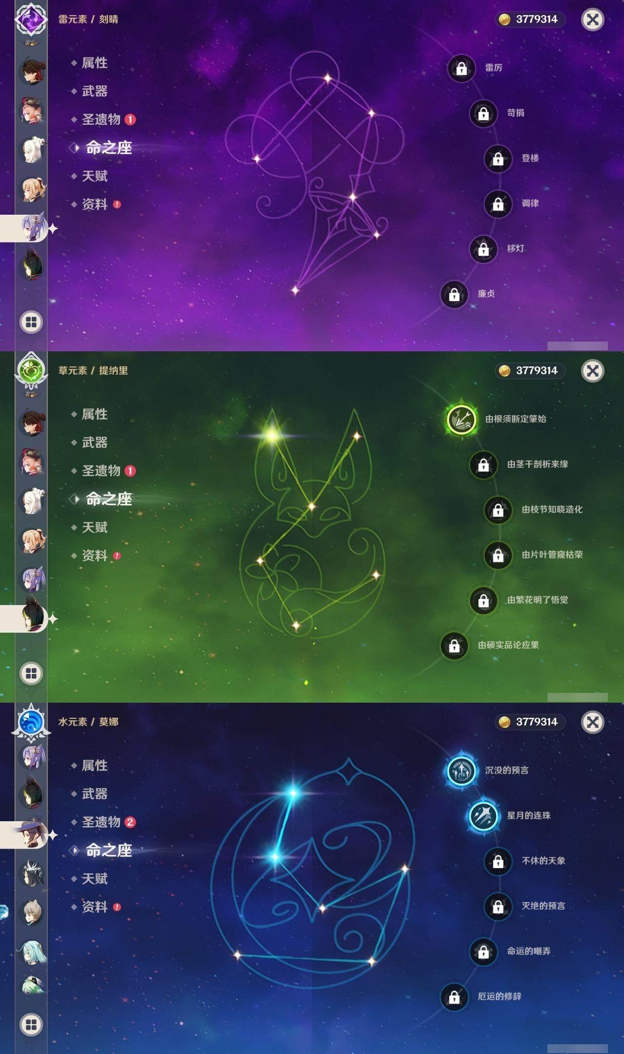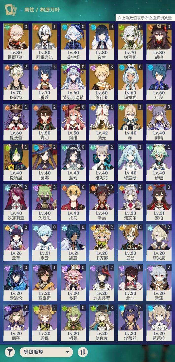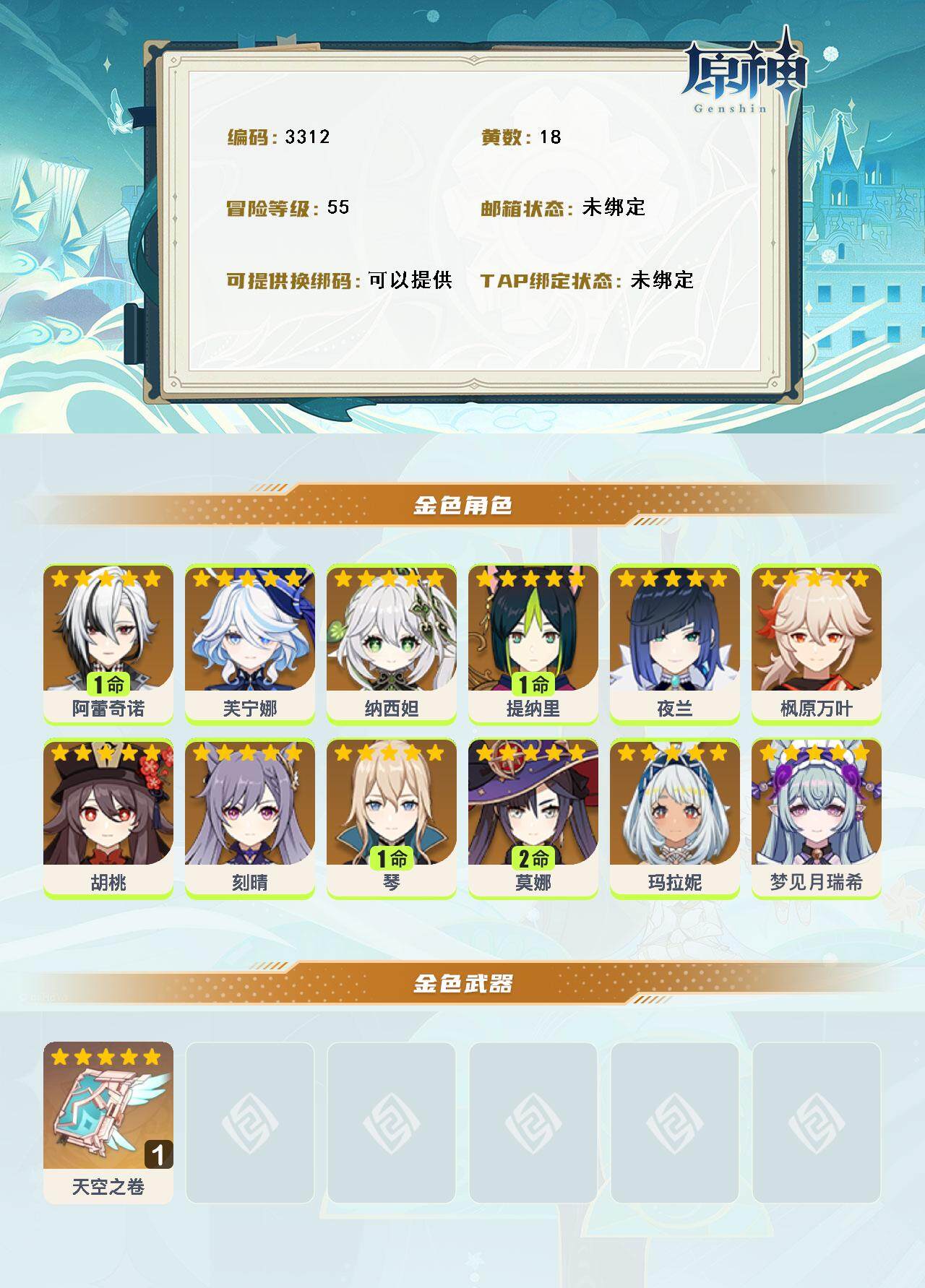 55级/18黄/男主/12个五星角色/1个五星武器 1命阿蕾奇诺0命芙宁娜0命纳西妲1命提纳里0命夜兰0命枫原万叶0命胡桃0命刻晴1命琴2命莫娜0命玛拉妮0命梦见月瑞希精1天空之卷