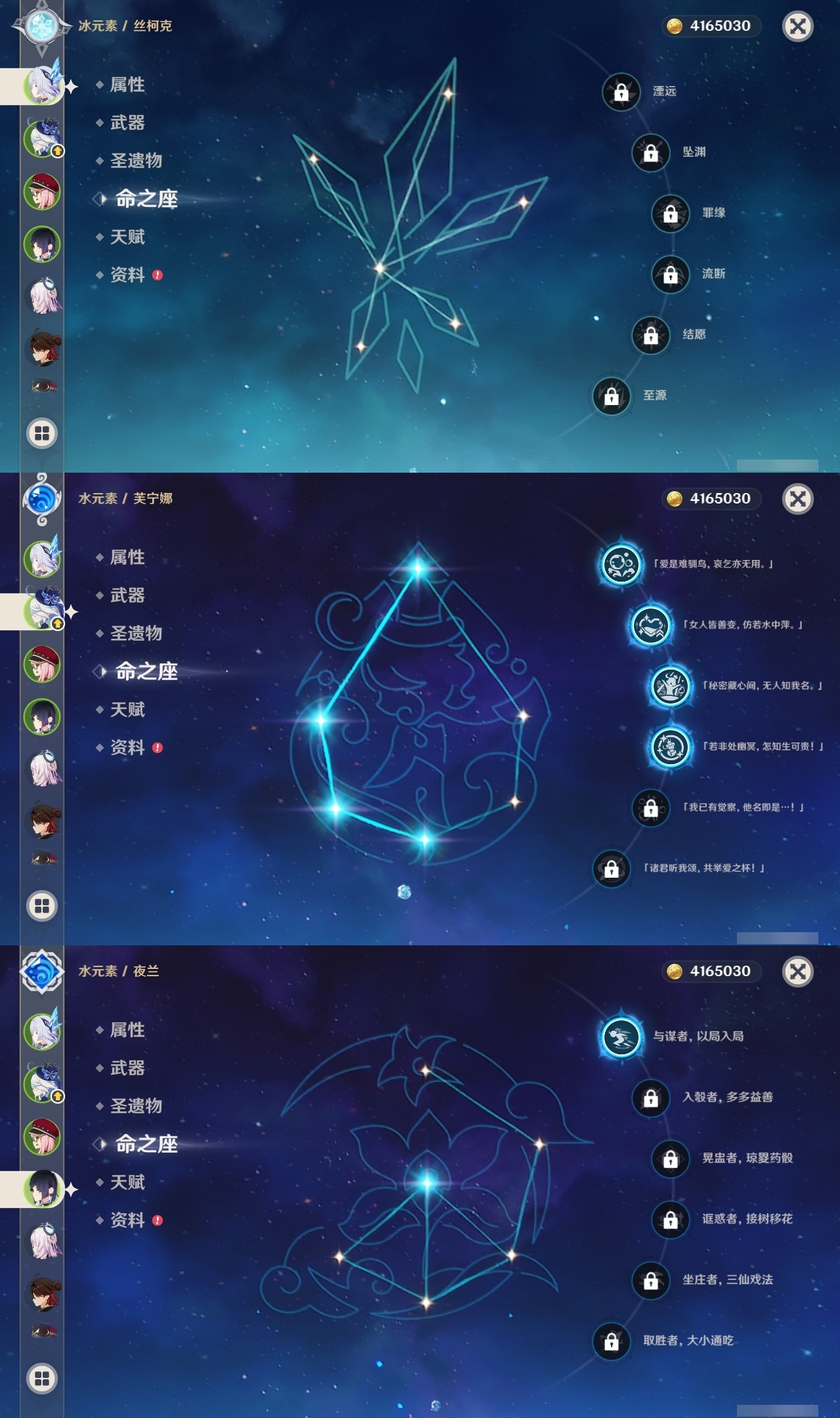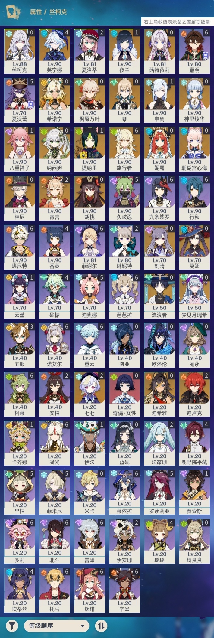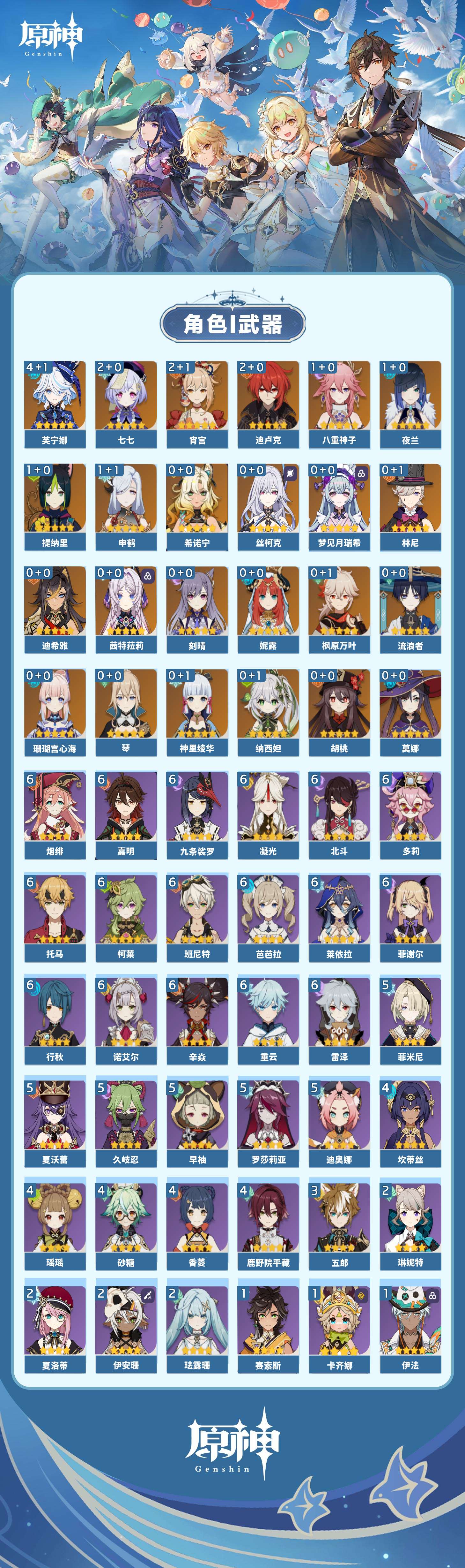 【原神】【lyys8042】冒险等级:60,五星数量:36,五星角色:芙宁娜 4命迪卢克 2命七七 2命宵宫 2命申鹤 1命八重神子 1命夜兰 1命提纳里 1命莫娜琴珊瑚宫心海希诺宁神里绫华茜特菈莉迪希雅梦见月瑞希林尼丝柯克妮露纳西妲流浪者枫原万叶胡桃刻晴__五星武器:和璞鸢 2精四风原典 2精最初的大魔术静水流涌之辉苍古自由之誓飞雷之弦振天空之脊天空之翼雾切之回光息灾千夜浮梦__四星角色:班尼特 6命行秋 6命九条裟罗 6命凝光 6命莱依拉 6命多莉 6命柯莱 6命芭芭拉 6命托马 6命烟绯 6命重云 6命辛焱 6命诺艾尔 6命雷泽 6命菲谢尔 6命北斗 6命嘉明 6命久岐忍 5命迪奥娜 5命早柚 5命罗莎莉亚 5命菲米尼 5命夏沃蕾 5命香菱 4命鹿野院平藏 4命砂糖 4命瑶瑶 4命坎蒂丝 4命五郎 3命珐露珊 2命琳妮特 2命夏洛蒂 2命伊安珊 2命卡齐娜 1命云堇 1命伊法 1命赛索斯 1命奇偶·女性绮良良米卡欧洛伦蓝砚